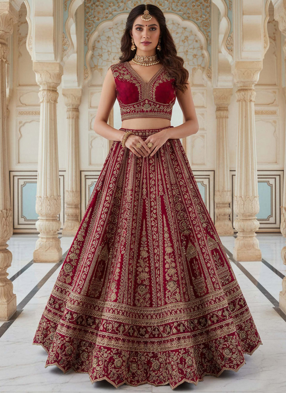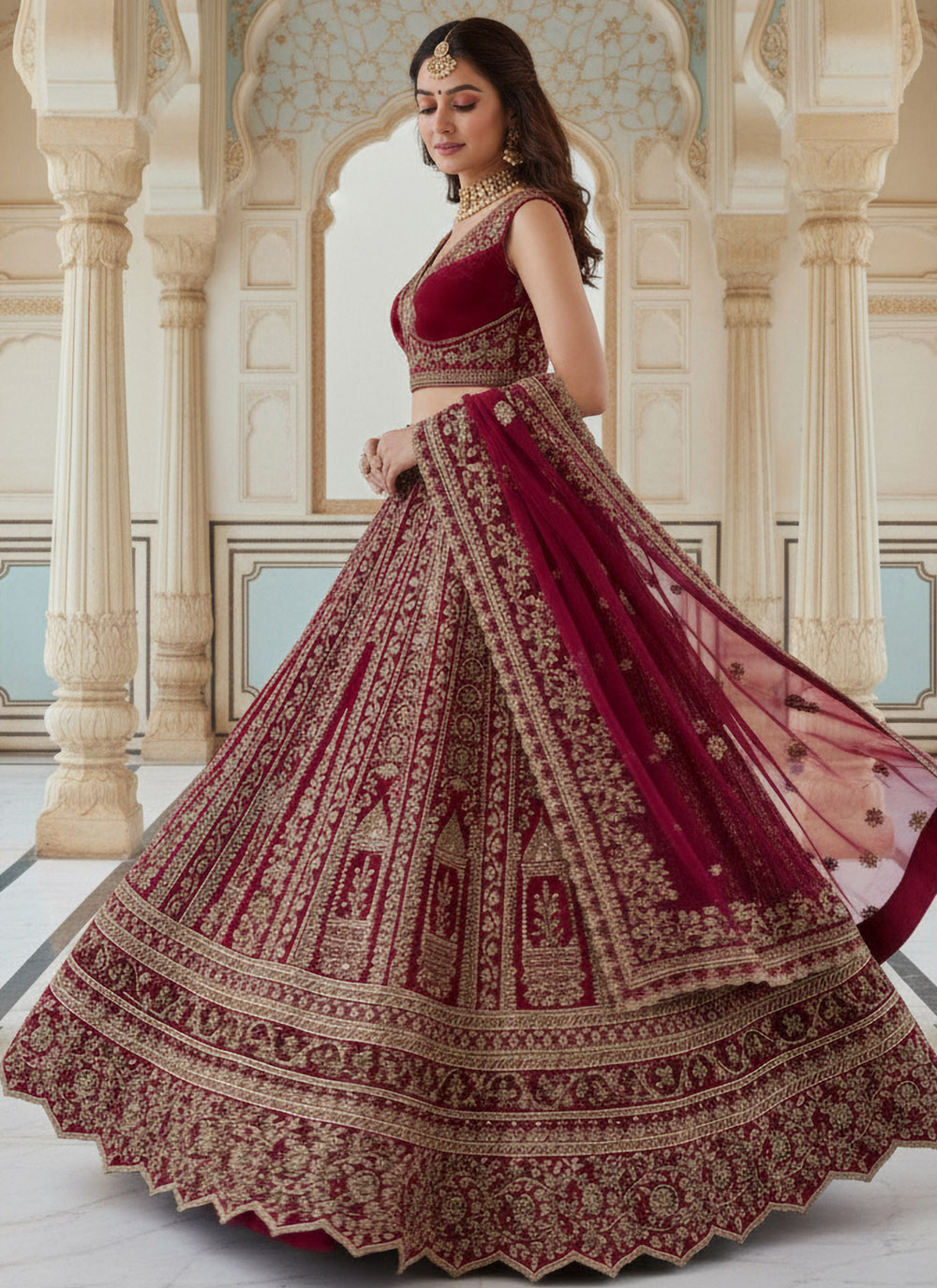 This diamond-studded pink lehenga choli combines intricate multi-thread and zari embroidery with sparkling embellishments. Perfect for wedding receptions or ceremonial functions, it offers unmatched festive charm and elegance. Comes with matching choli and dupatta.