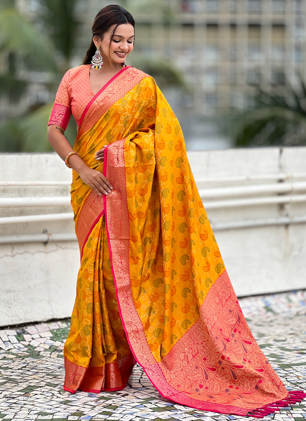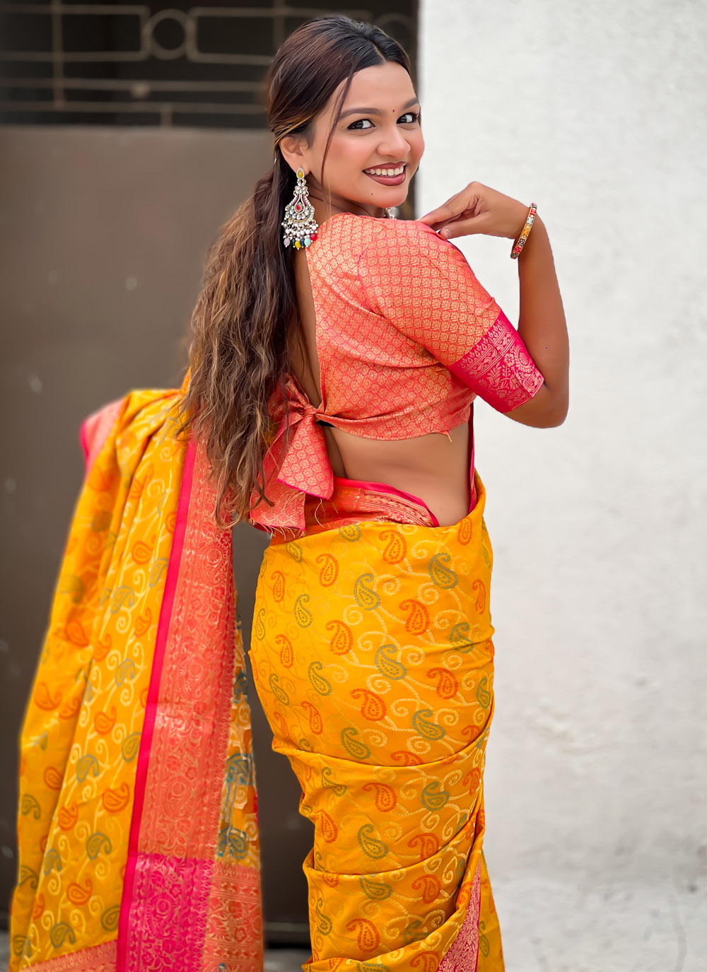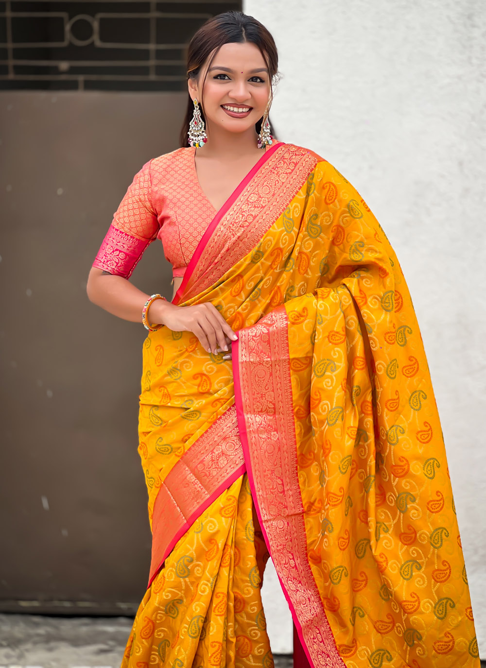 This Mustard silk saree beautifully blends traditional artistry with modern designer styling. The meenakari work adds vibrant detailing, while the flowing silk fabric enhances its royal appeal. Comes with matching blouse.