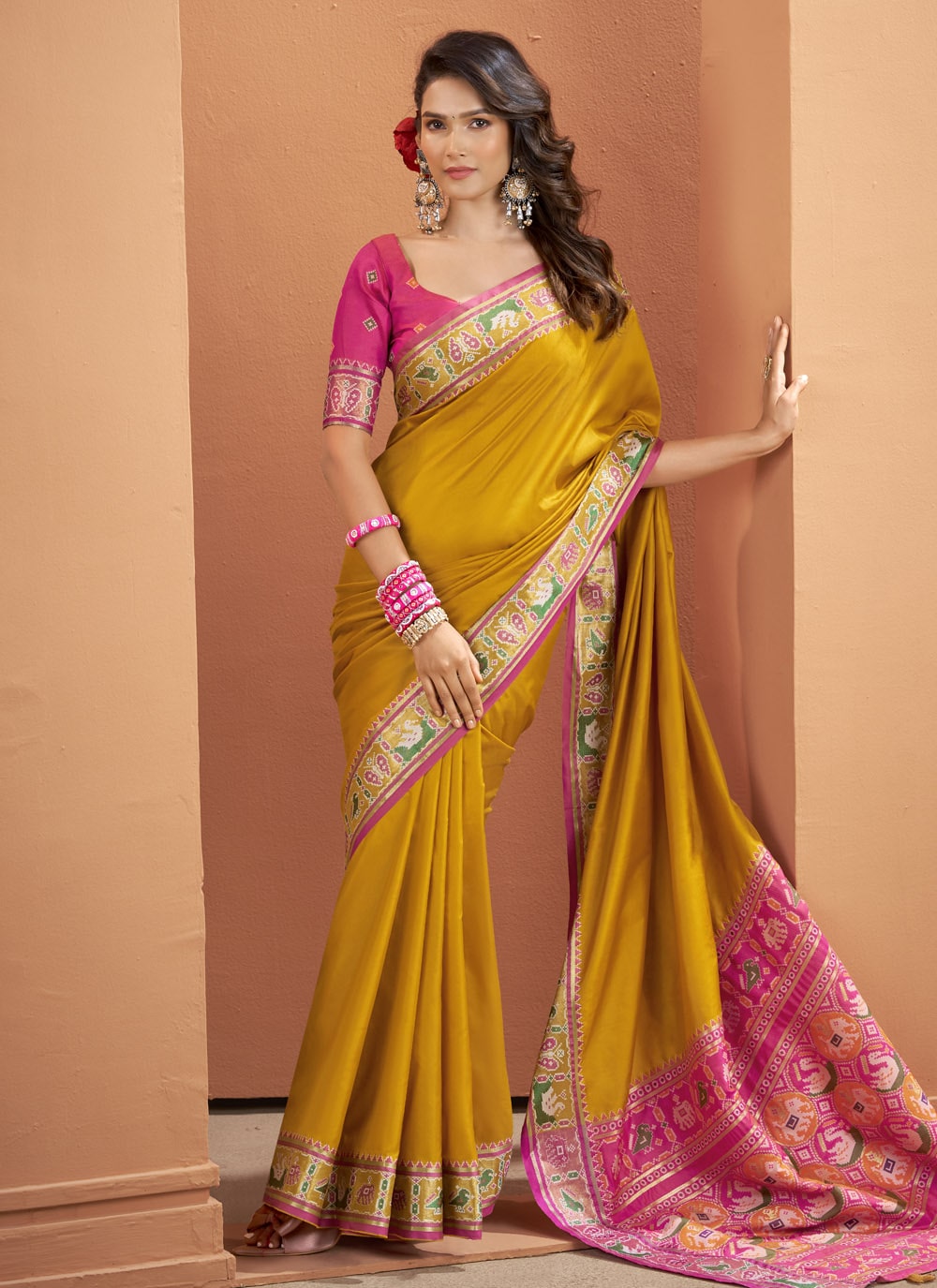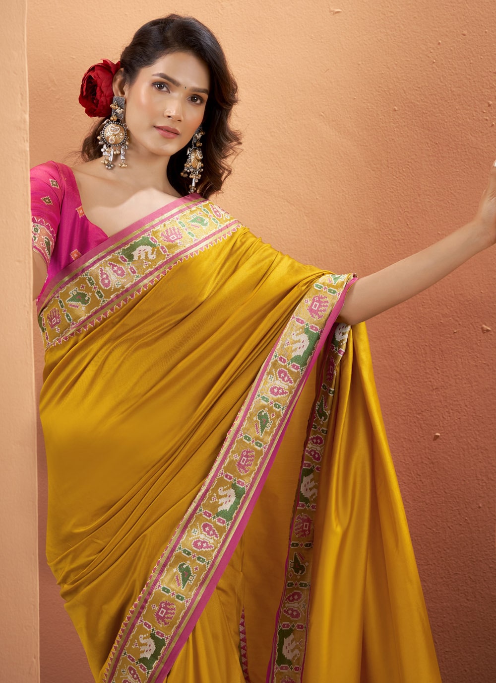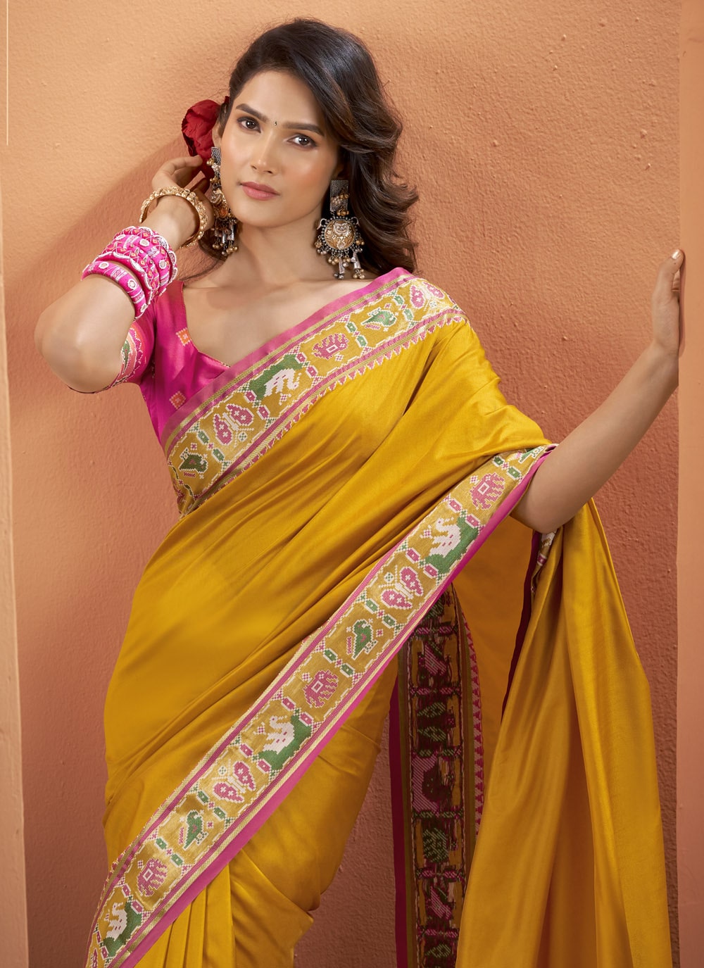 Celebrate your Haldi ceremony in vibrant style with this Mustard Silk Saree adorned with exquisite Patola weaving. The warm mustard hue is perfectly suited for pre-wedding festivities, while the intricate patterns reflect India’s timeless textile traditions. Comes with matching blouse.