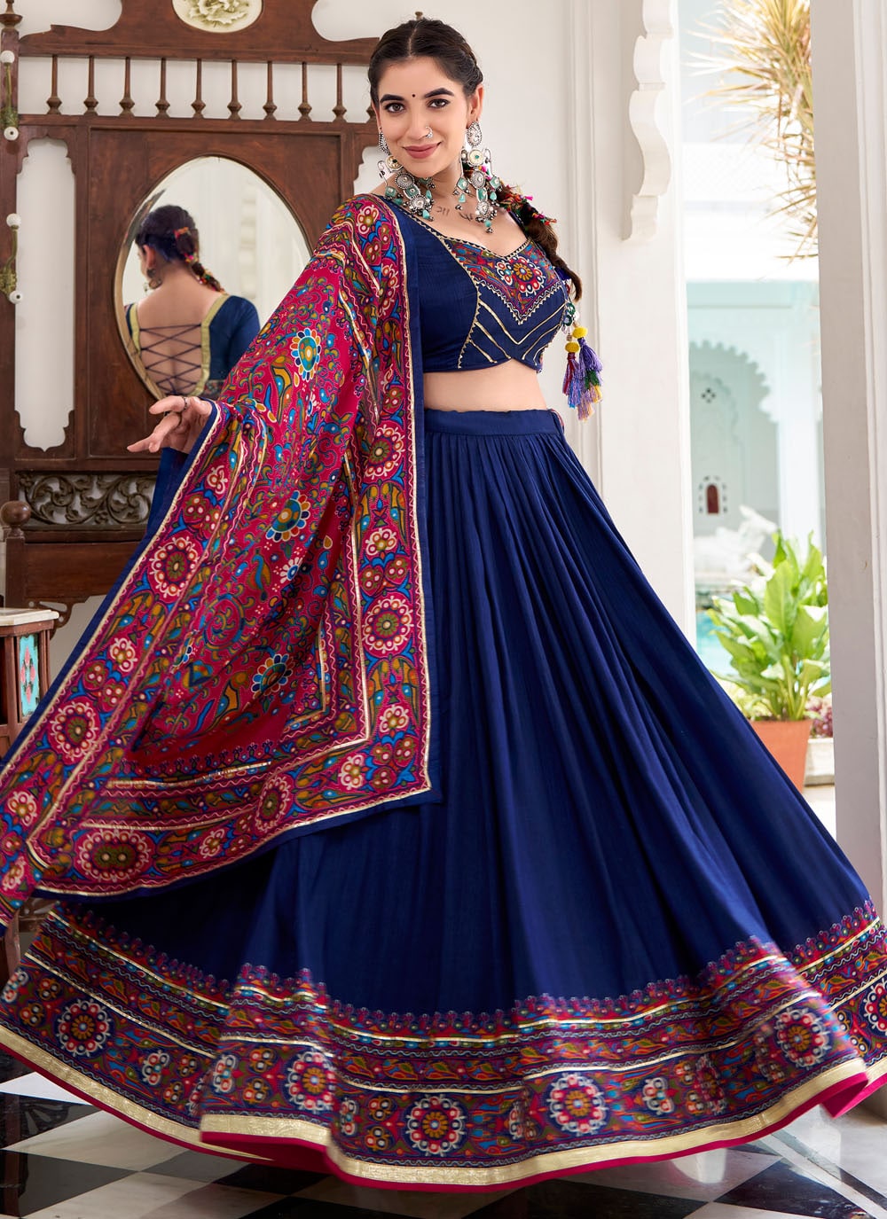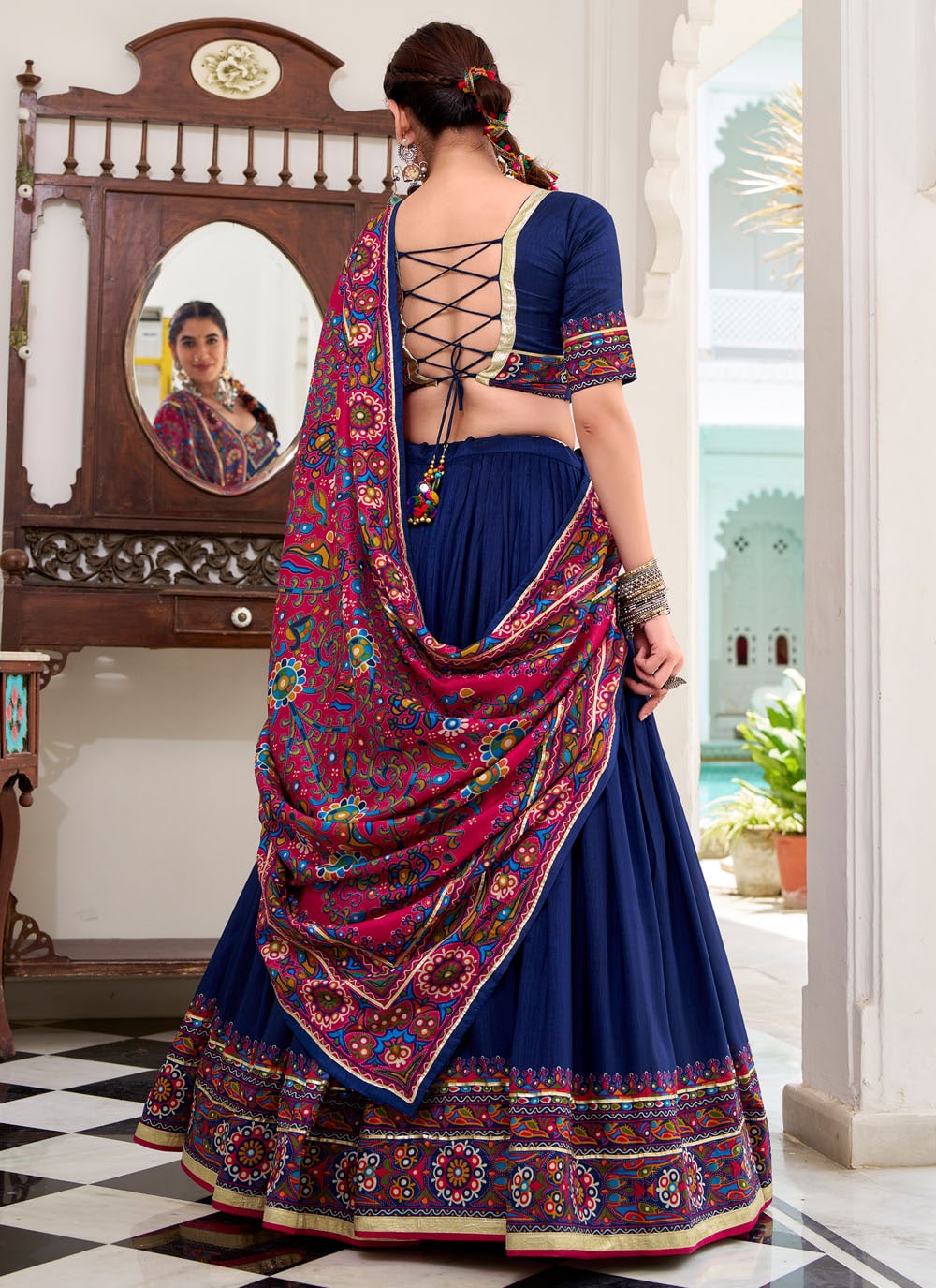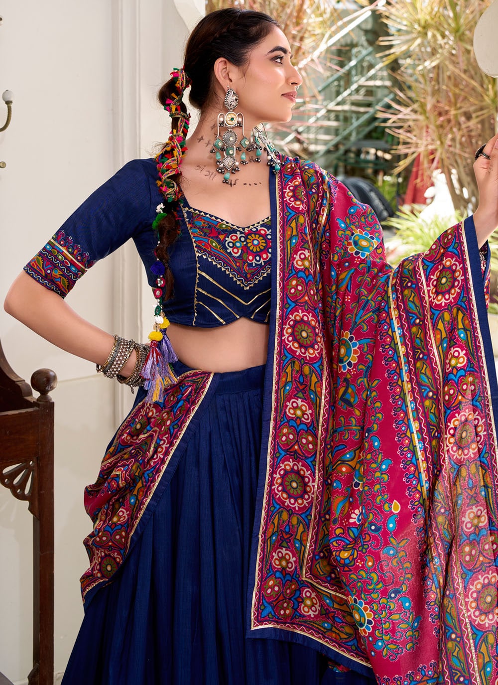 Radiate elegance in this Silk Navy Blue Gamthi Print and Lace Work Lehenga Choli, designed for the modern woman who loves timeless ethnic wear. while the colorful Gamthi motifs add a touch of tradition. Lace work at the borders elevates the design. Comes with matching choli and dupatta.