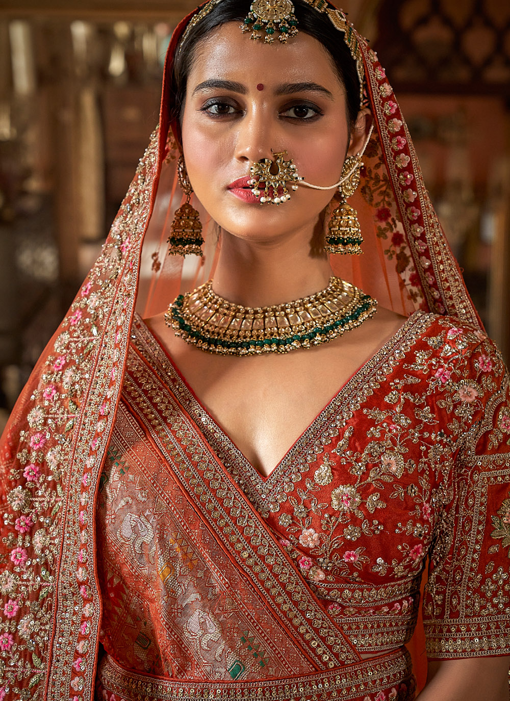This orange silk lehenga choli combines traditional artistry with contemporary bridal elegance. Intricate embroidery using zari, pearls, sequins, and stones creates a luxurious texture, making it a perfect choice for weddings, receptions, and grand celebrations. Comes with matching choli and dupatta.