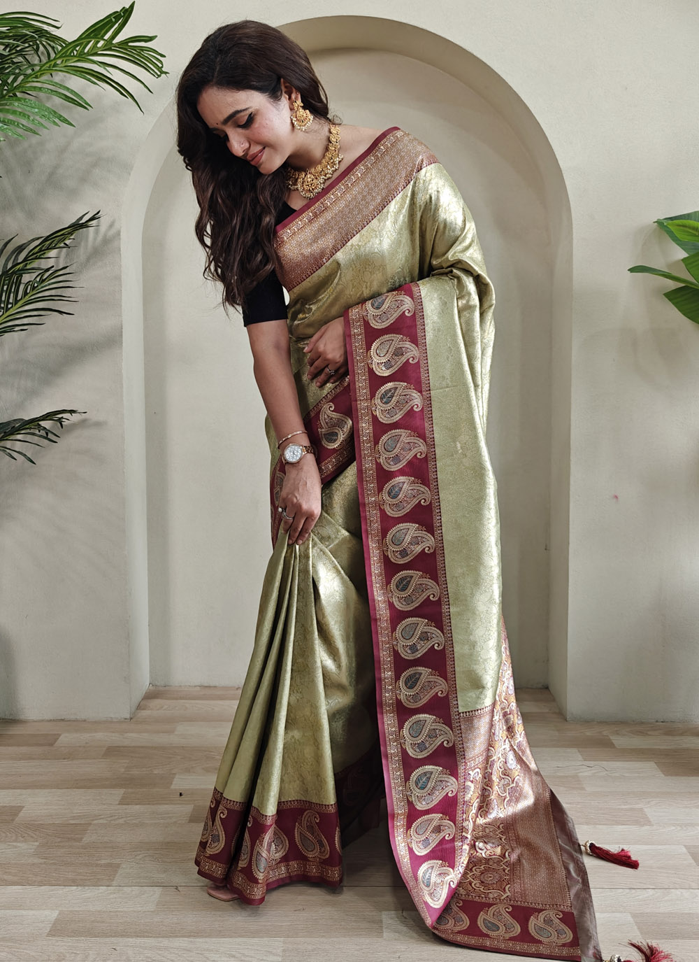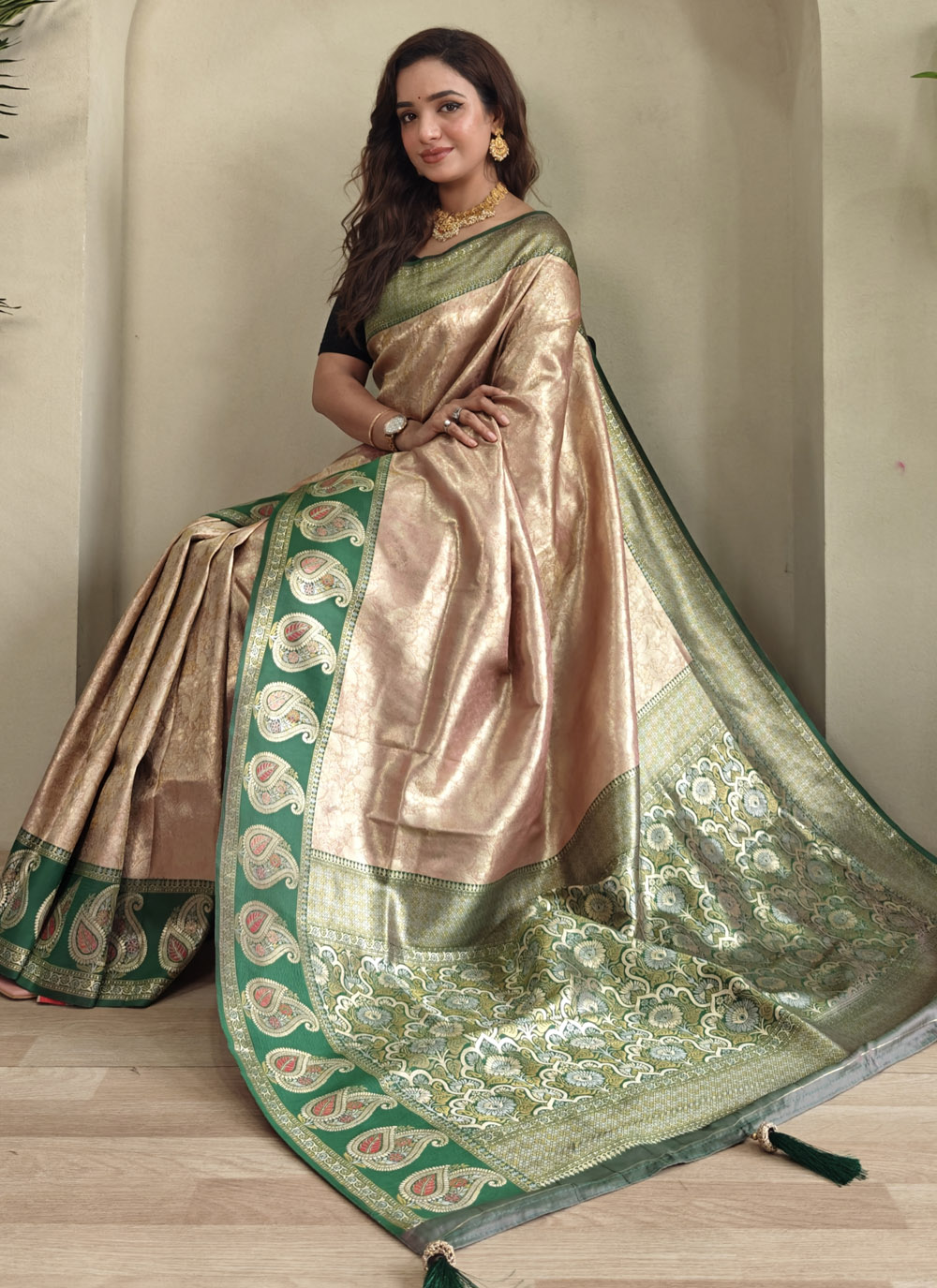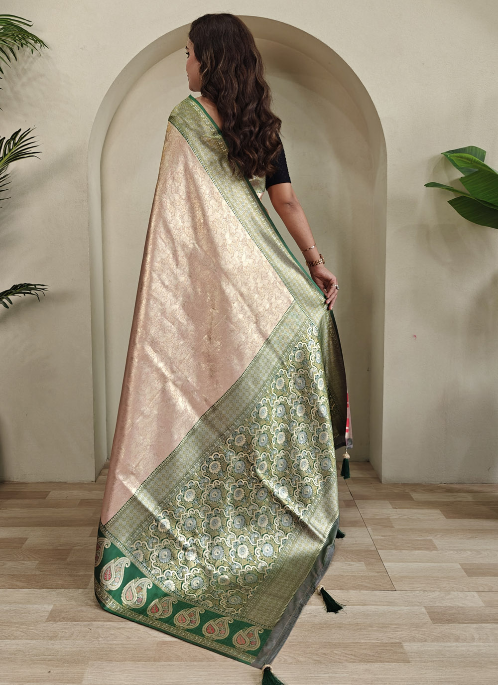 Add a touch of refined beauty to your wardrobe with this peach silk saree, adorned with elegant weaving work. The soft peach hue paired with intricate patterns makes it a graceful choice for weddings, receptions or festive gatherings. Comes with matching blouse.
