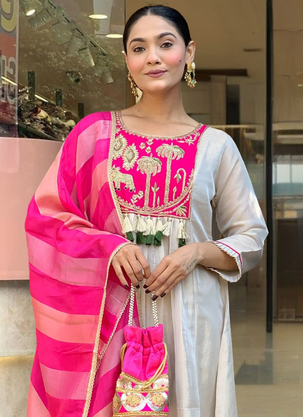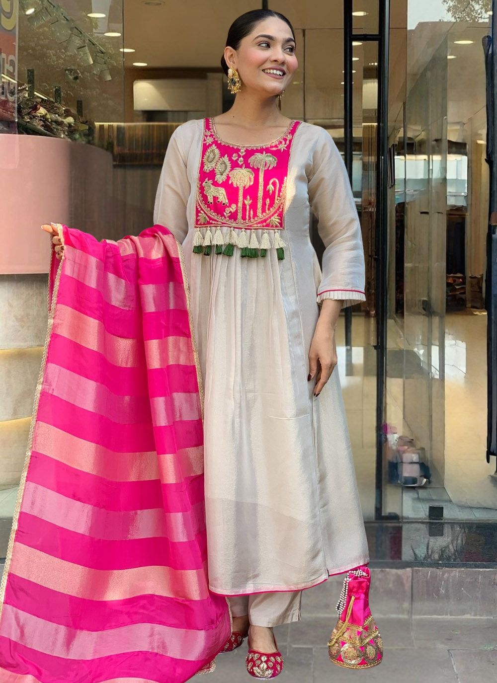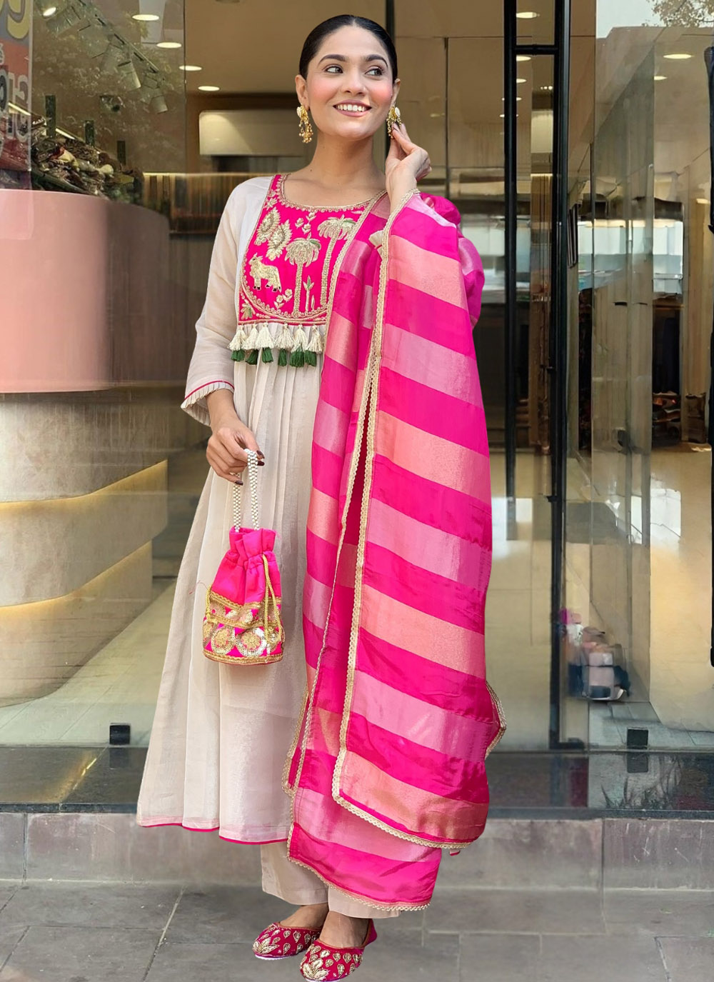Celebrate special moments in this Designer Pink Silk Embroidered Salwar Kameez Set. The elegant embroidery complements the vibrant pink tone, creating a balanced blend of tradition and contemporary fashion. Comes with matching bottom and dupatta.