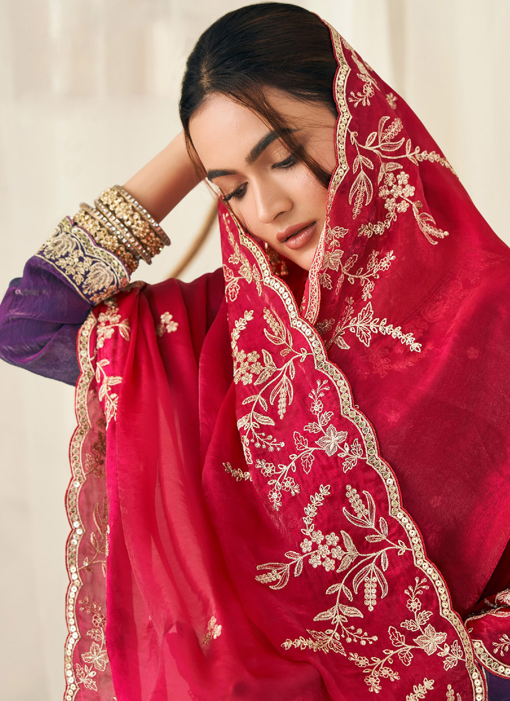 Add royal elegance to your wardrobe with this purple silk designer salwar kameez. The intricate embroidery highlights the outfit beautifully, perfect for ceremonies and cultural celebrations. Comes with matching bottom and dupatta.