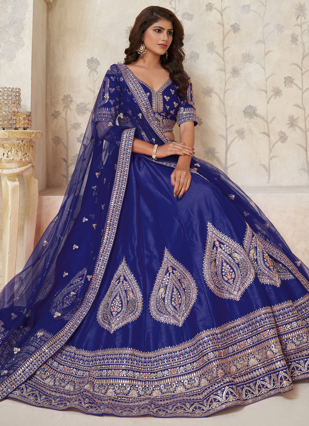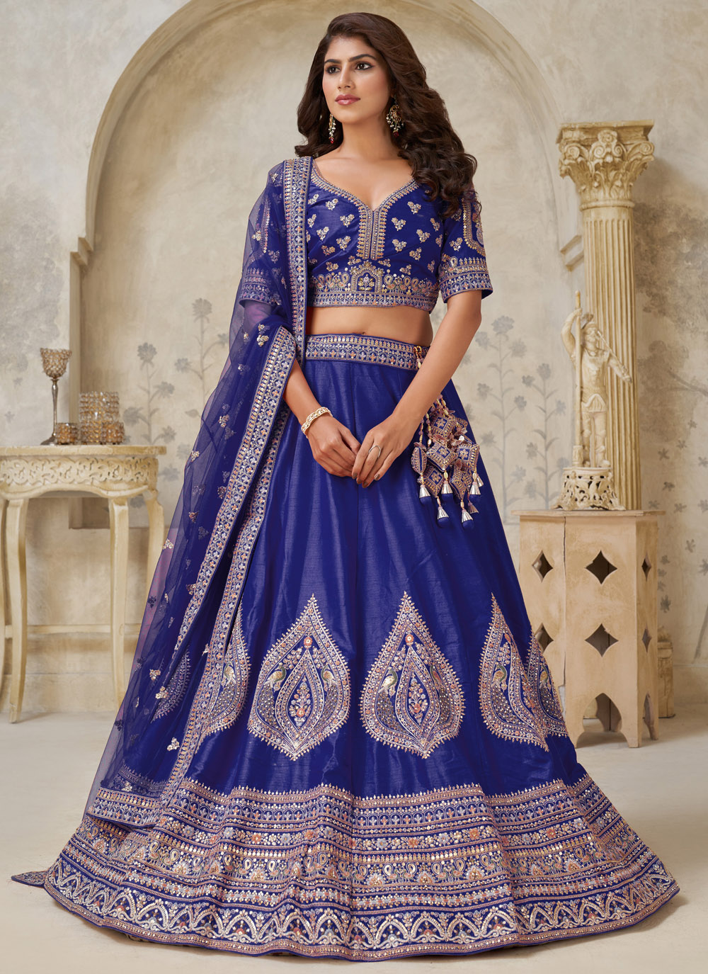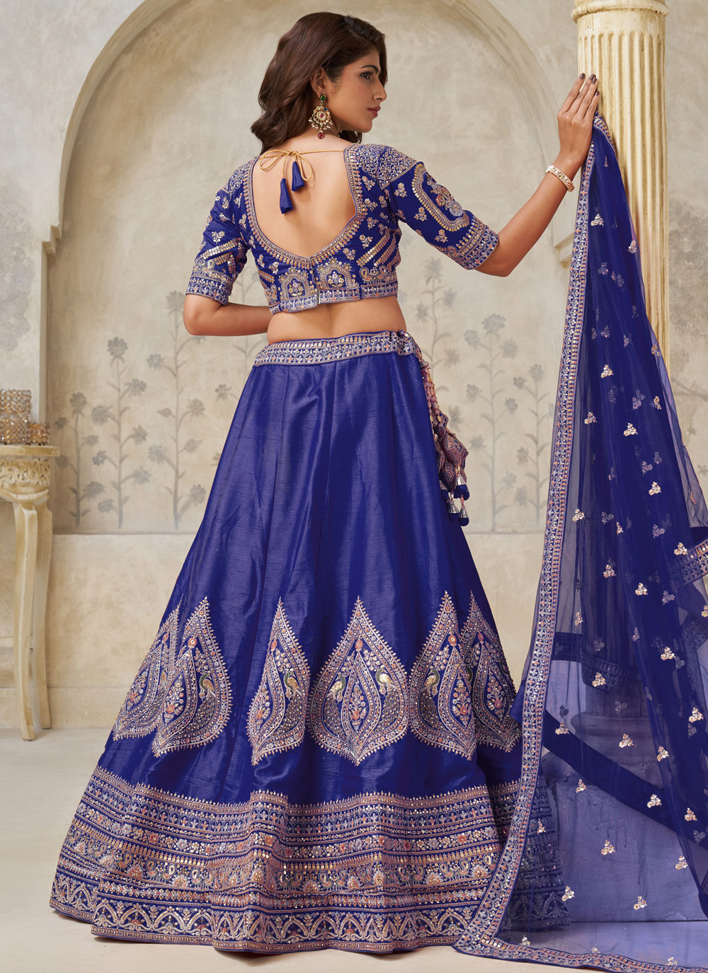 This purple silk A-line lehenga choli features beautiful zari thread embroidery highlighted with subtle sequins. The smooth silk fabric and flowing silhouette offer comfort along with a royal ethnic look. Comes with matching choli and dupatta.
