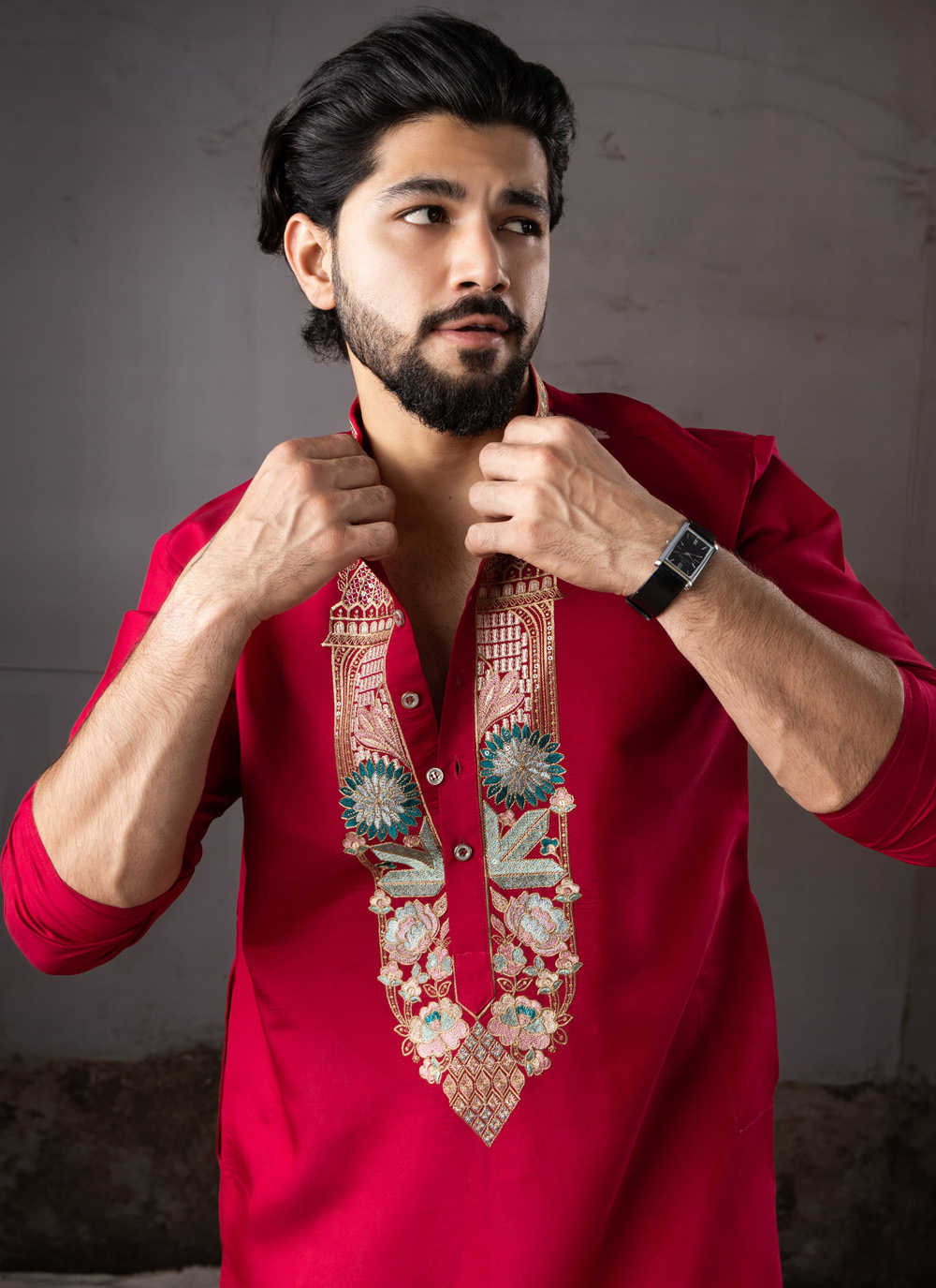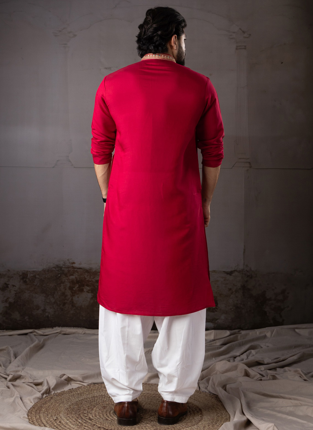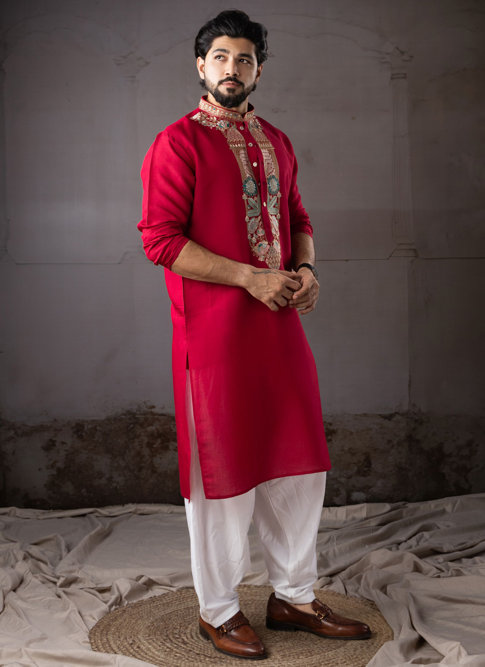 Celebrate traditional fashion with this Silk Red Embroidered Kurta Pyjama, a perfect combination of luxury and cultural style. The kurta is crafted from fine silk fabric that gives it a rich shine and comfortable feel.