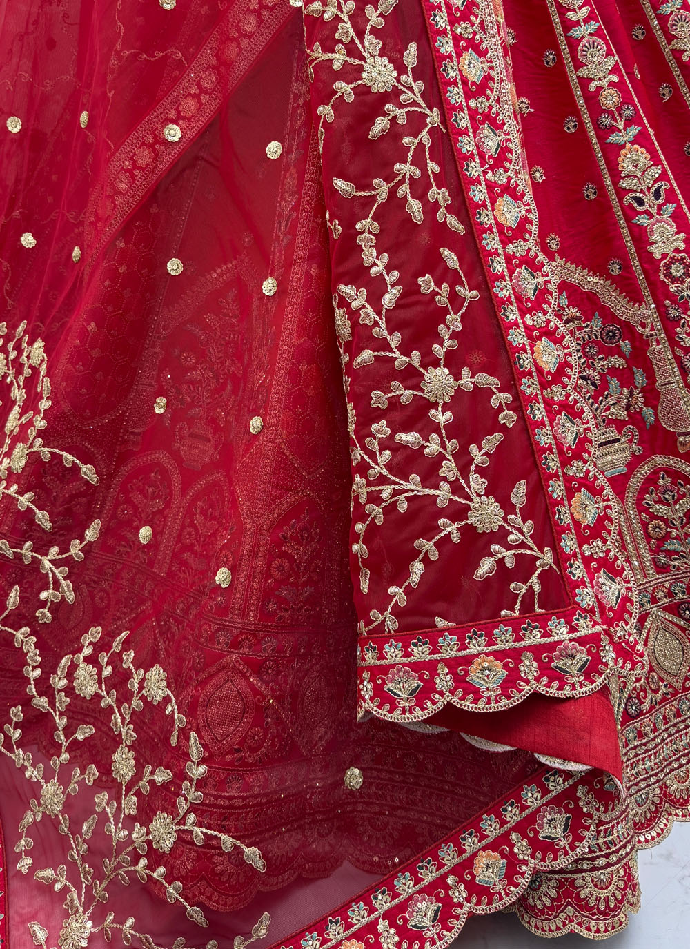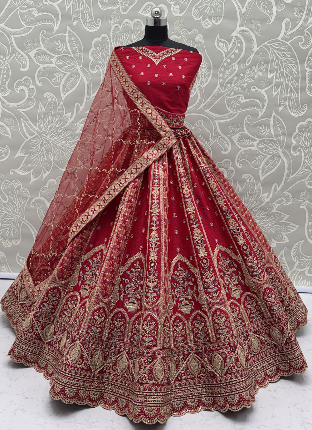This Red Silk Embroidered Lehenga Choli is crafted with detailed sequins, thread, and zari embellishments that highlight fine craftsmanship. The addition of lace accents brings a refined texture to the design, while the smooth silk fabric ensures a comfortable and elegant drape. Comes with matching choli and dupatta.
