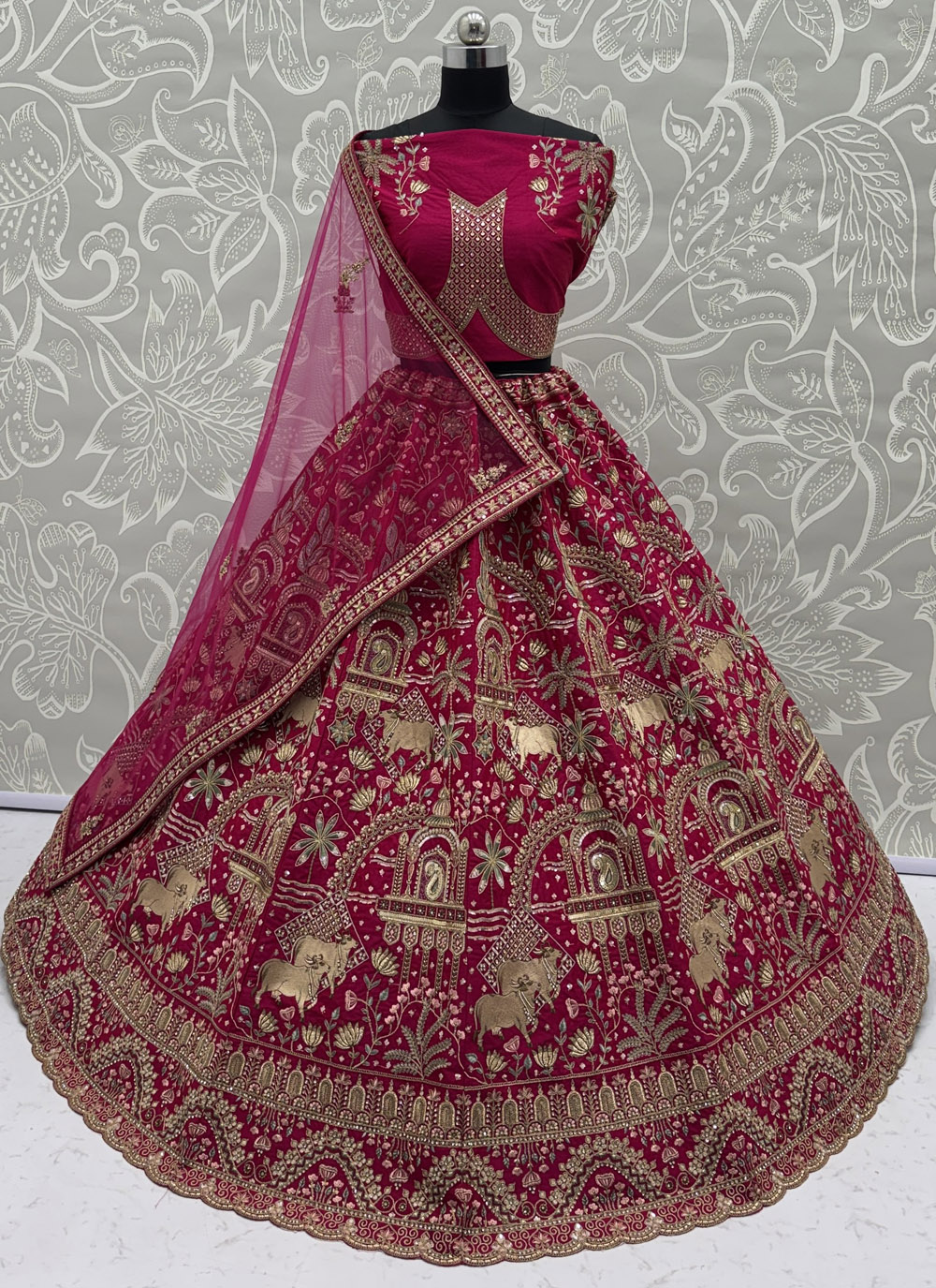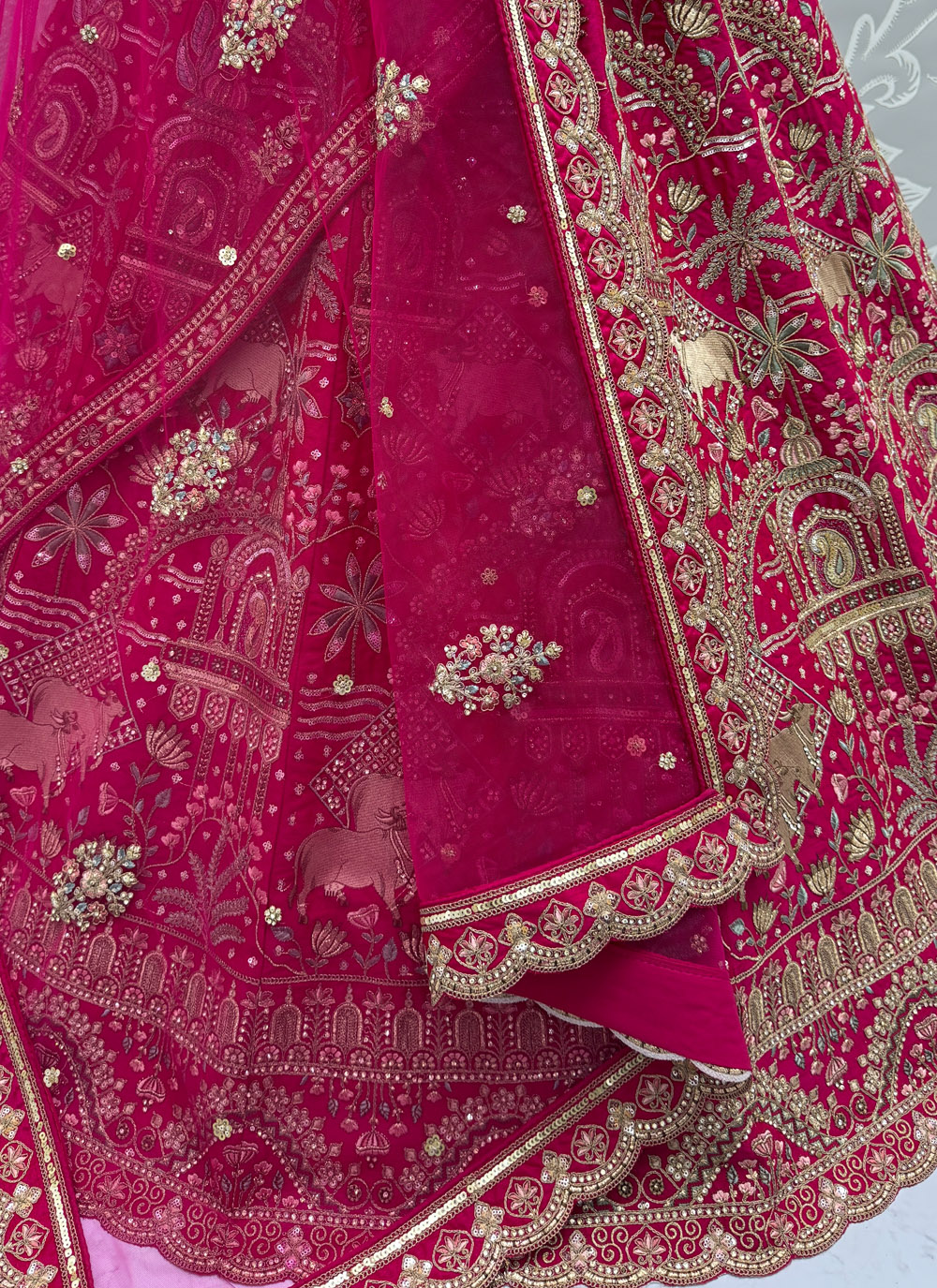 Elevate your reception look with this stunning Rani Silk Sequins Thread Dori Zari Embroidered Lehenga Choli. Designed with intricate craftsmanship, the embroidery adds depth and shimmer to the outfit. Comes with matching choli and dupatta.