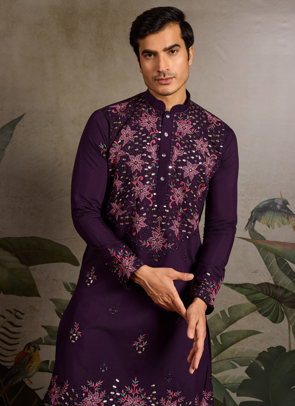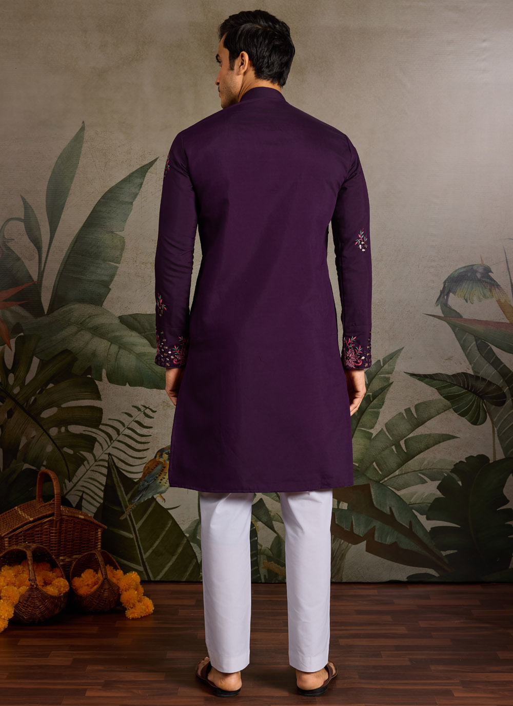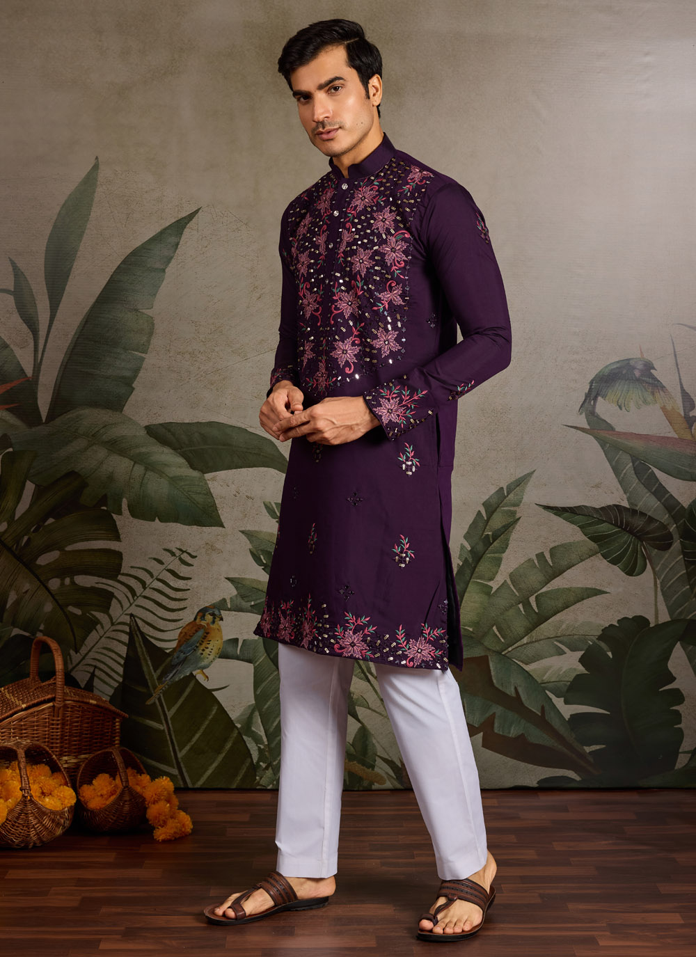 Designed for men who value timeless elegance, this purple viscose silk kurta showcases detailed embroidery in sequins and mirrors. Its graceful finish and fine fabric quality make it a versatile ceremonial outfit.