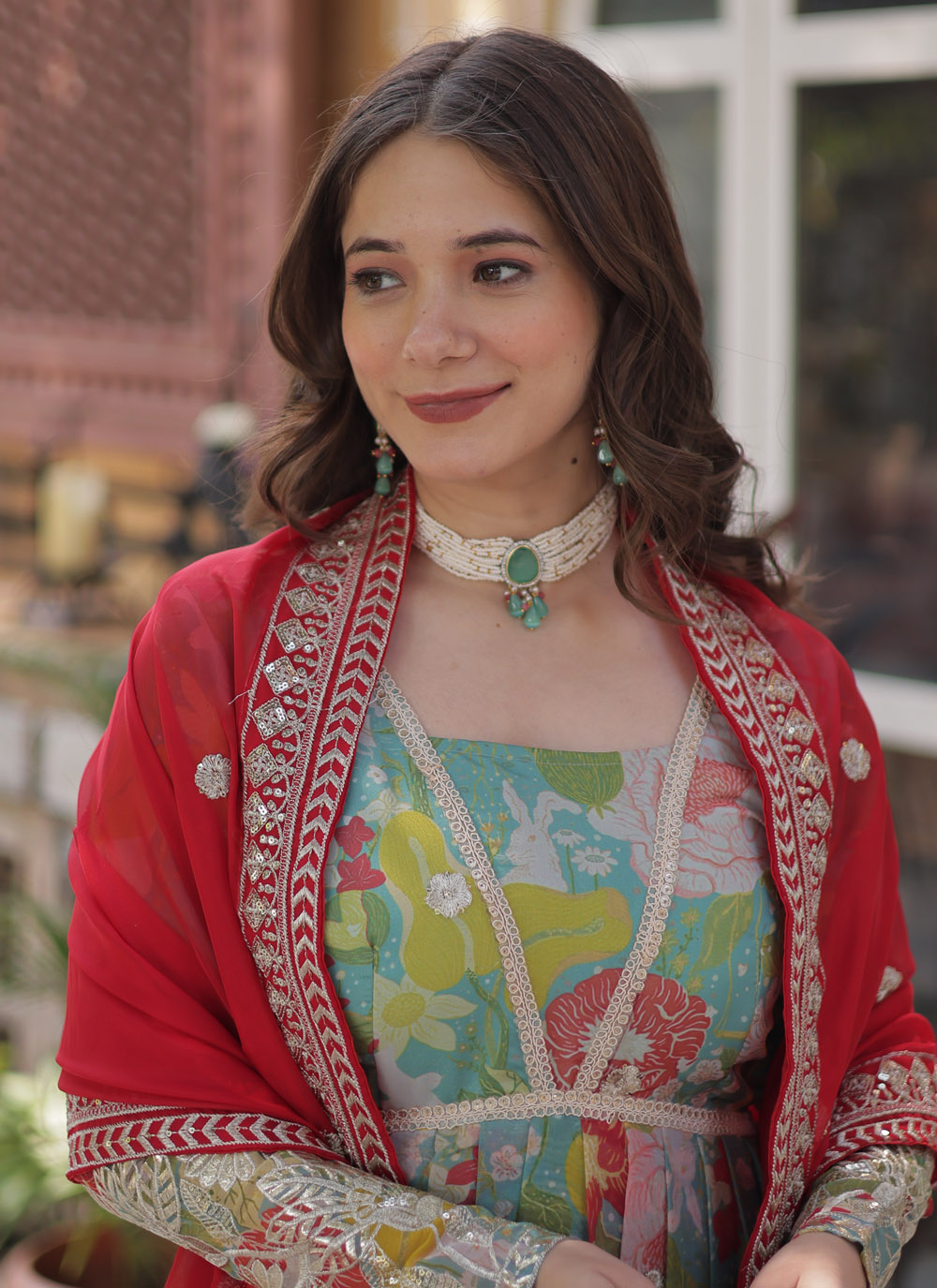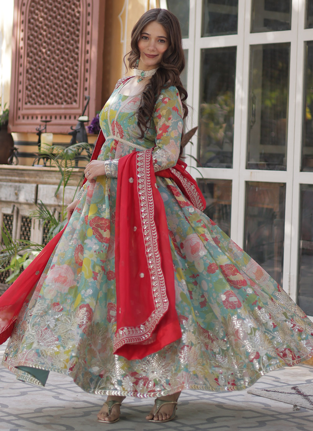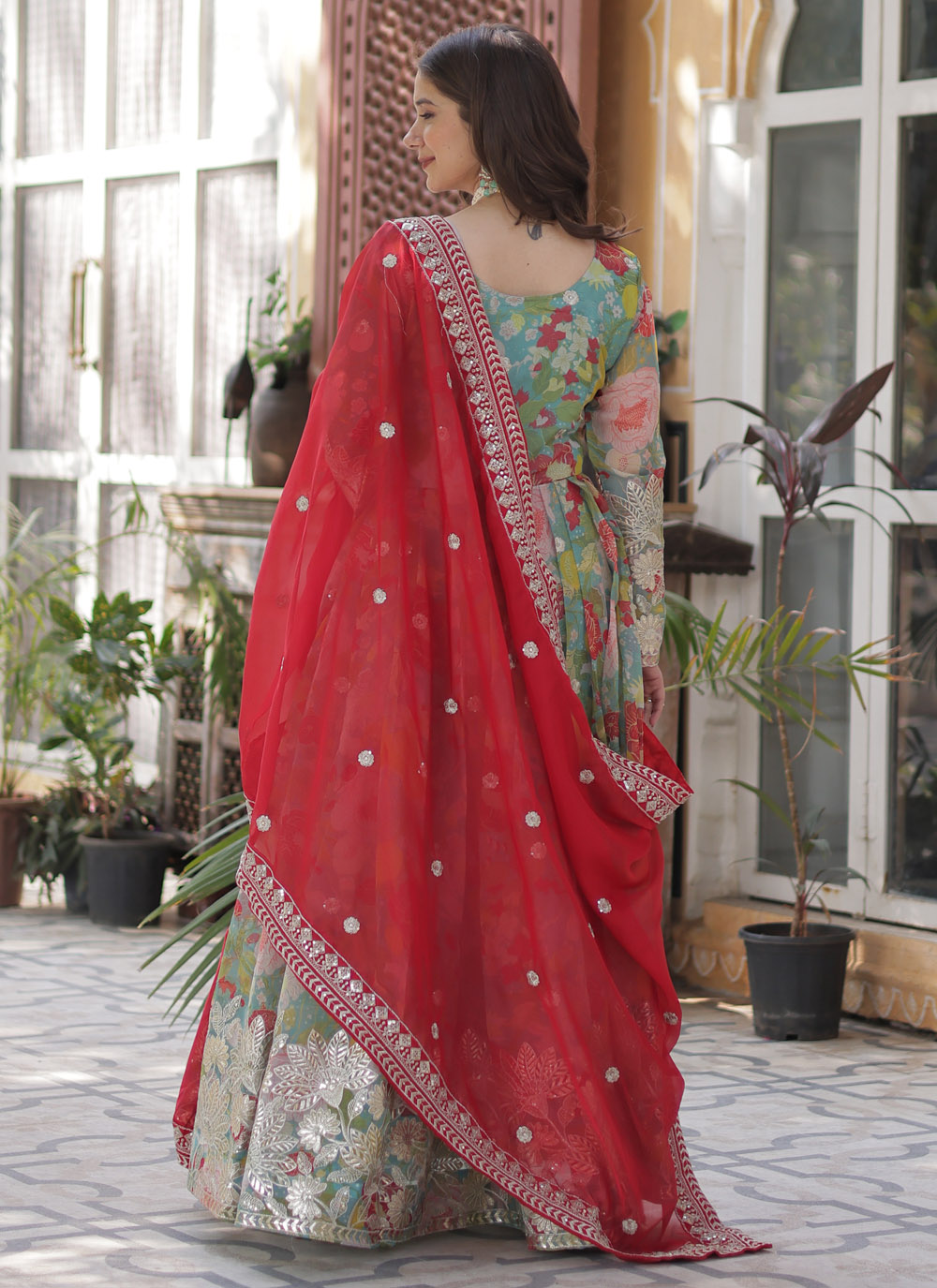 Step into grace with this Aqua Blue Readymade Gown, crafted in fine silk and beautifully enhanced with sequins and zari embroidery. The soothing hue combined with shimmering details makes it ideal for receptions, parties, or festive events. Comes with matching dupatta.