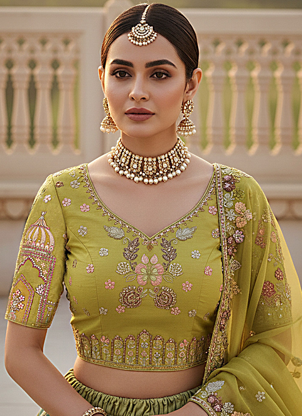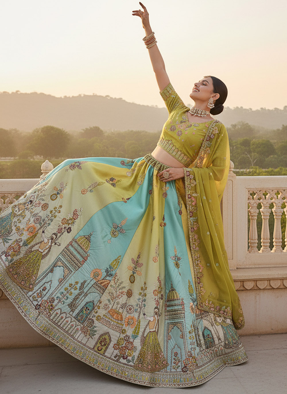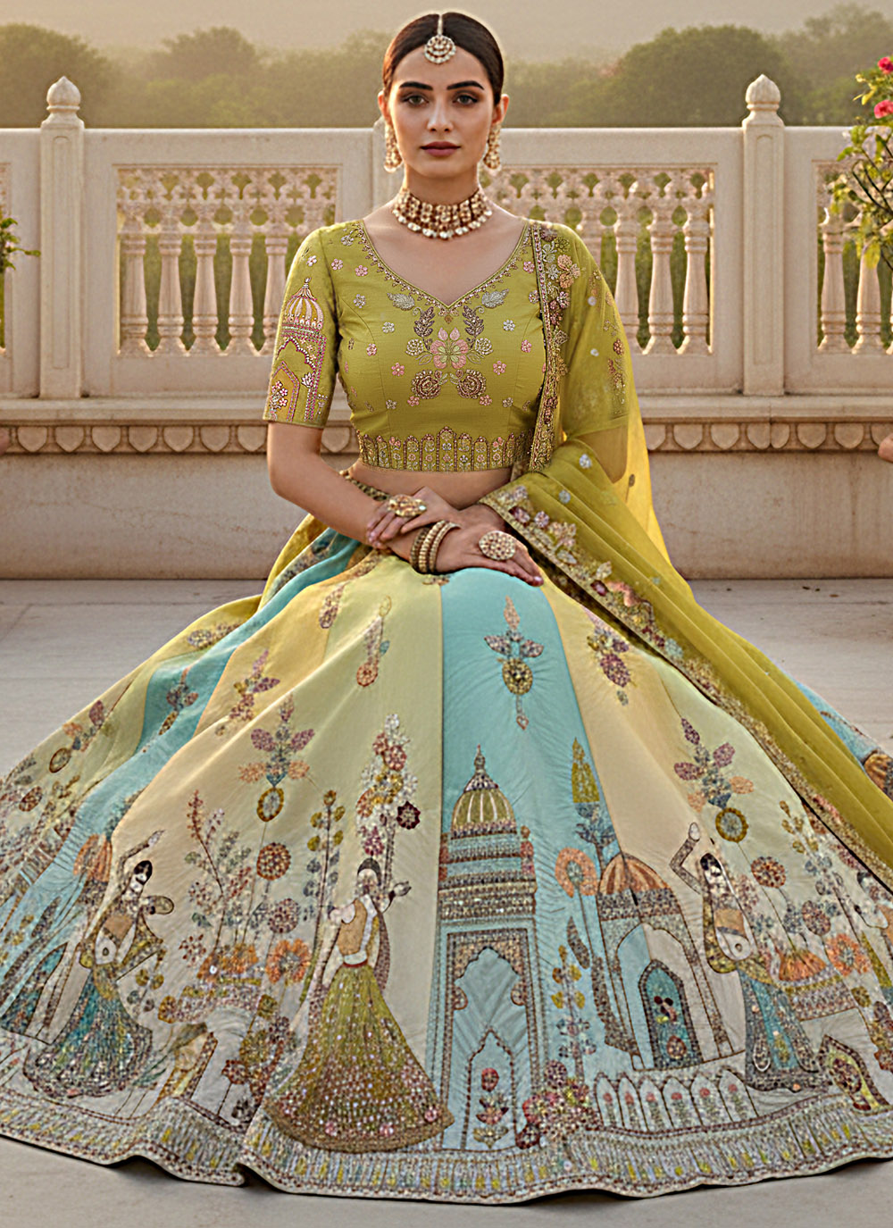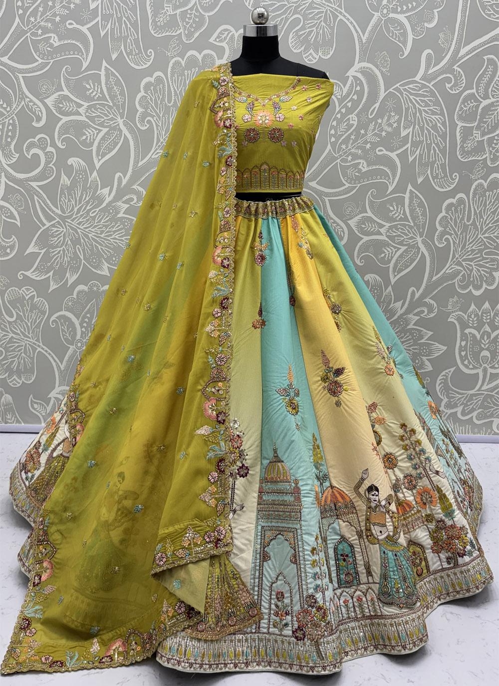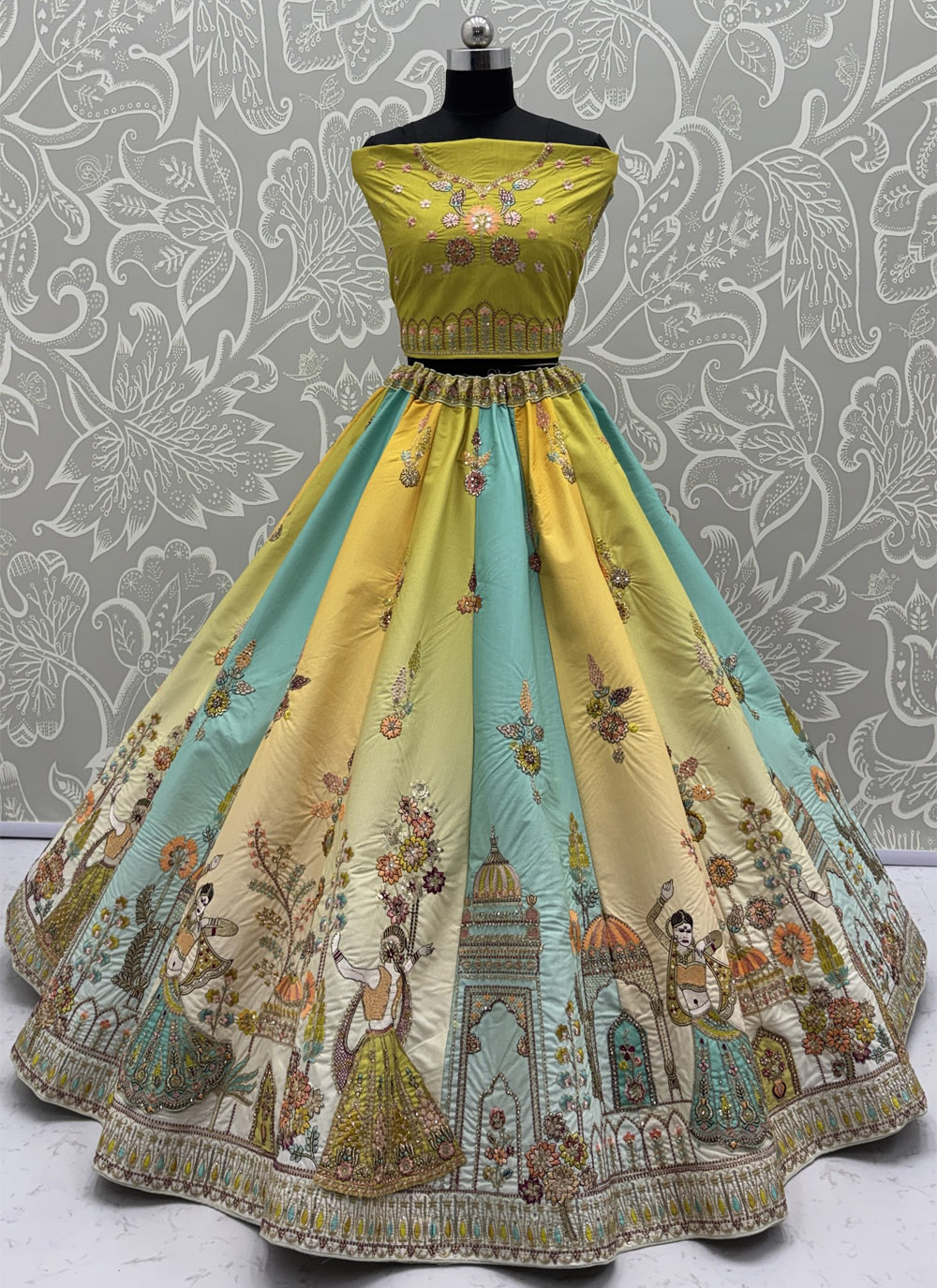 Crafted from premium silk, this multi-color lehenga choli showcases intricate thread embroidery, sequins, and diamond accents. Its vibrant palette, combined with detailed craftsmanship, makes it perfect for weddings and celebrations. Comes with matching choli and dupatta.