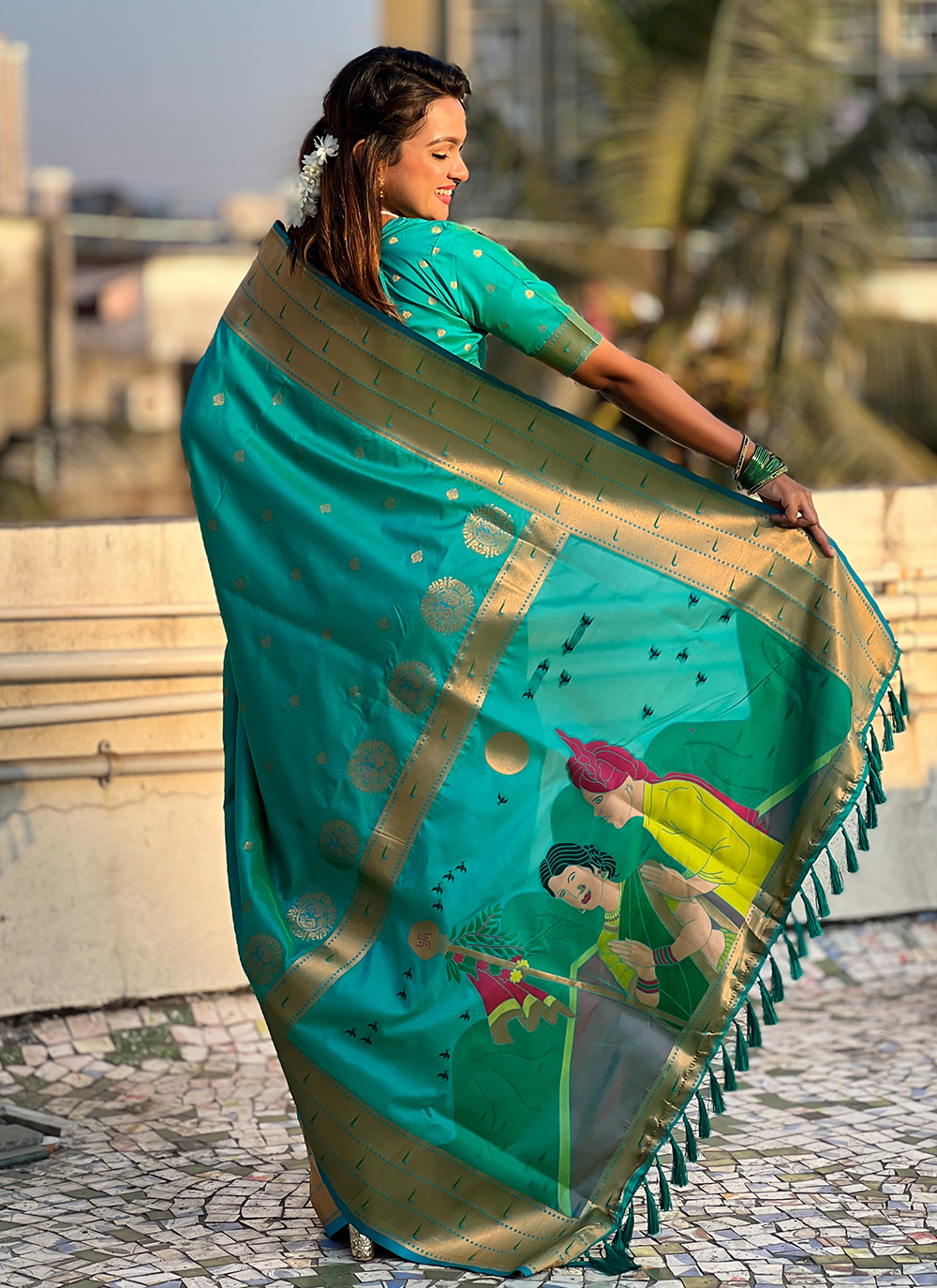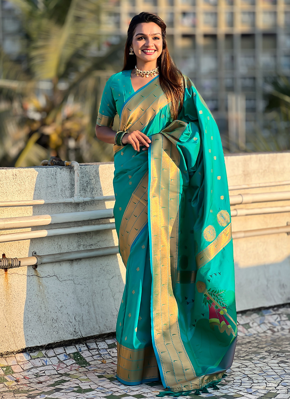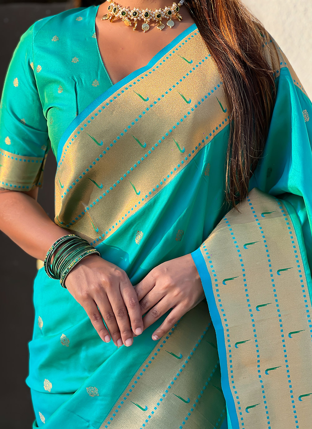 The Silk Weaving Ceremonial Saree in Sea Green, paired with a matching blouse, combines intricate weaving with a soothing sea green hue. This elegant saree is perfect for weddings, festivals, and special ceremonies, offering a timeless and luxurious look for any occasion.
