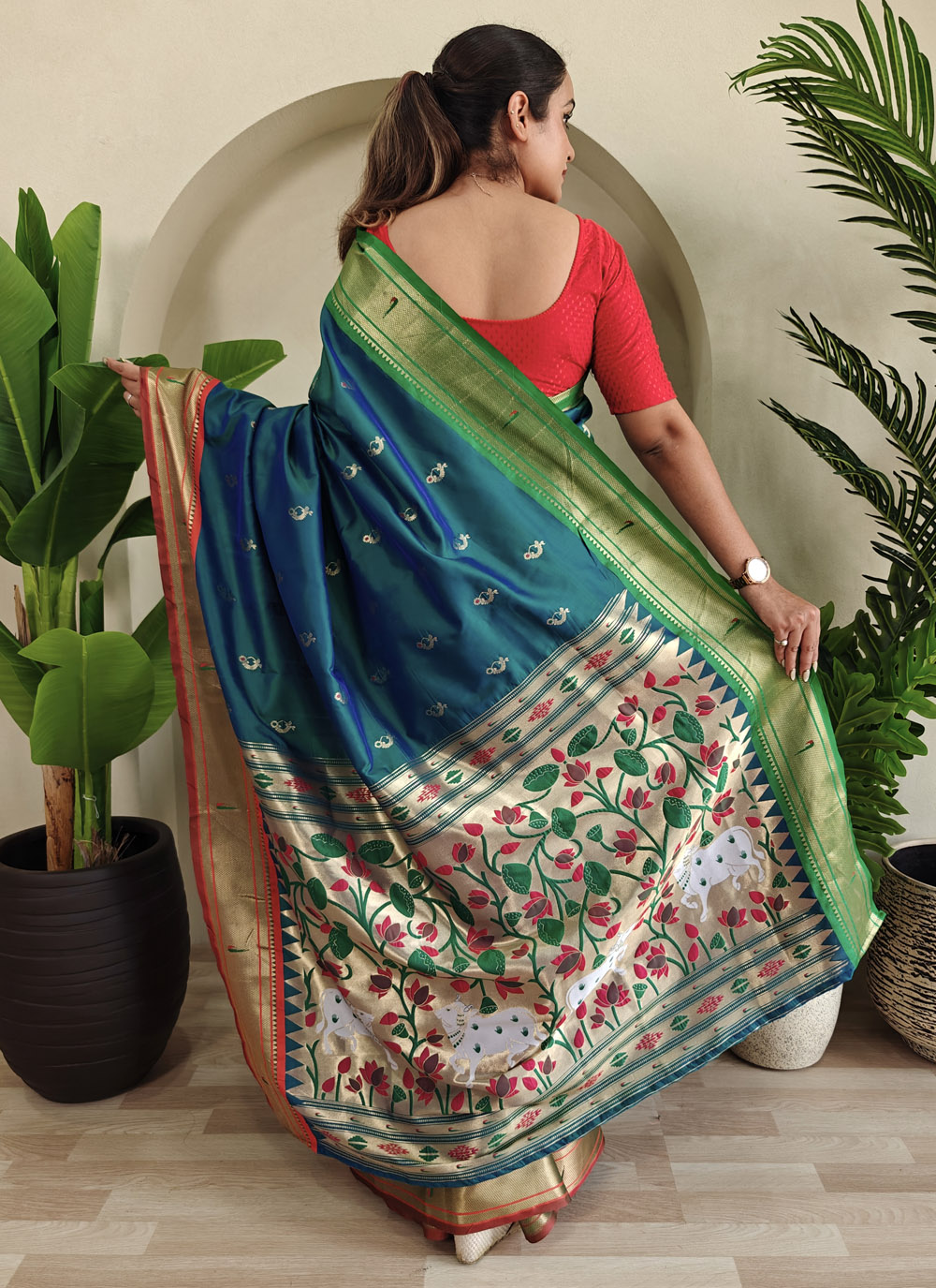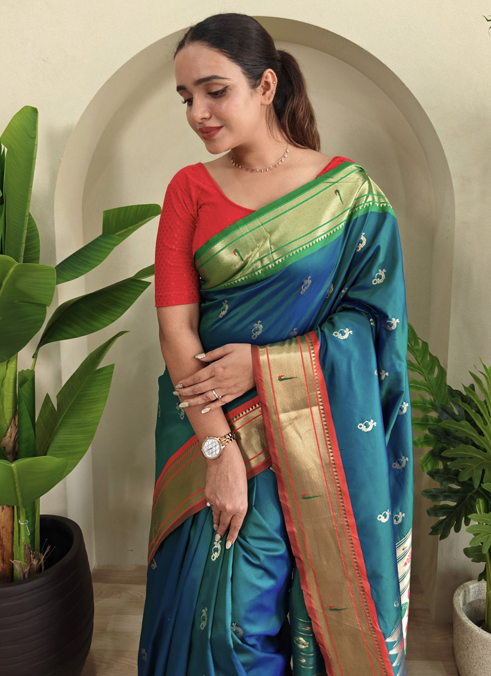 Drape yourself in the understated elegance of this Silk Weaving Classic Saree in Rama Colour. The rich silk fabric and intricate weaves create an opulent look that’s perfect for special occasions. Add a touch of glamour with antique accessories. Comes with matching blouse.