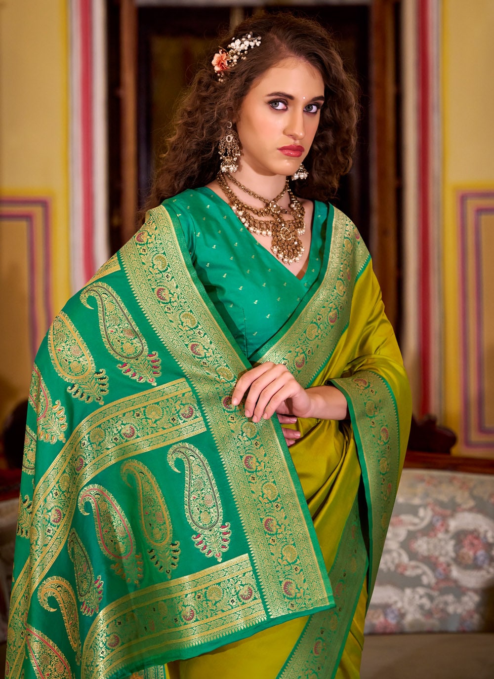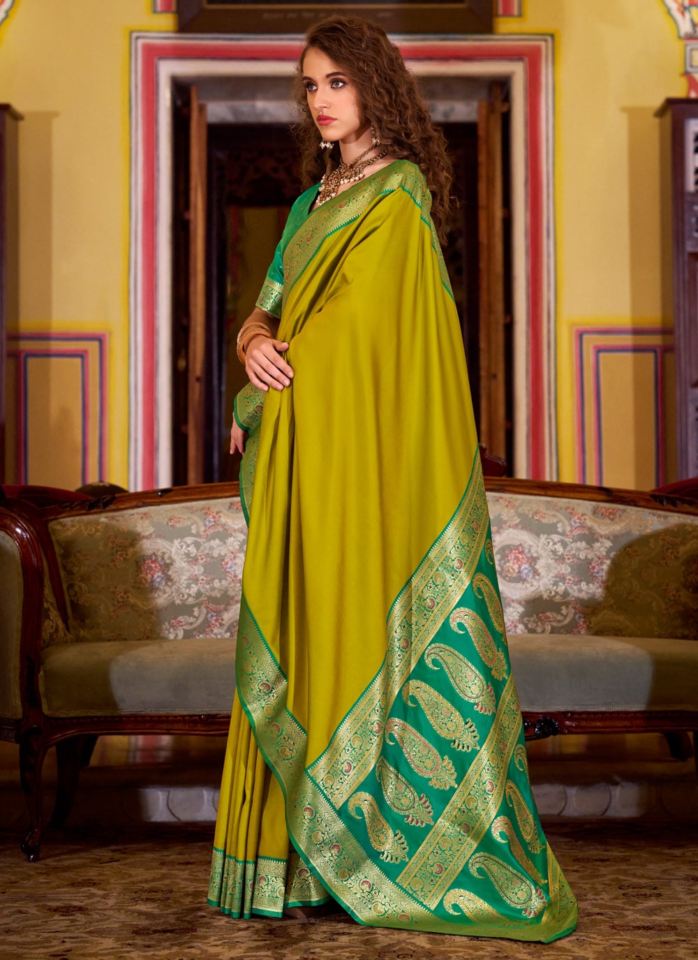 This green silk weaving work saree is the epitome of grace and grandeur. Designed to stand out, it combines rich craftsmanship with a designer look, ideal for ceremonies and festive celebrations. Comes with matching blouse.