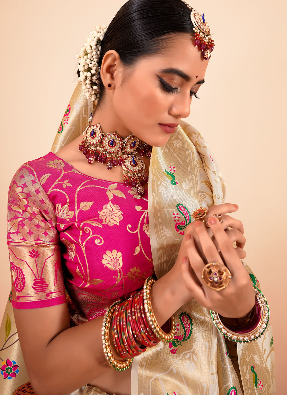 A timeless Cream Silk Saree with Zari Border Work, offering elegance and grace. Paired with a matching blouse, it’s perfect for special events and cultural occasions.