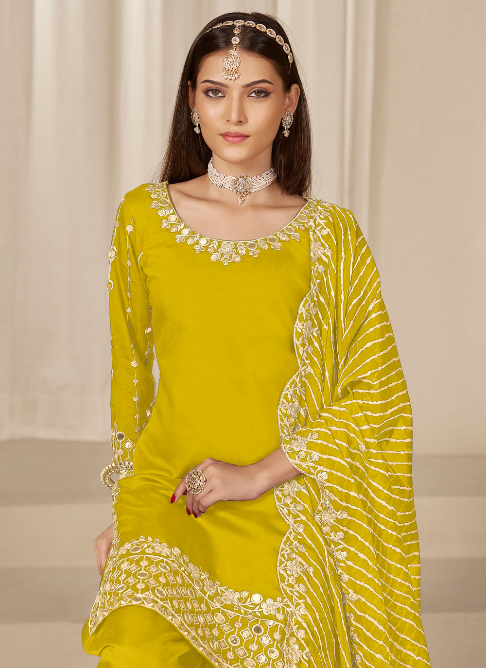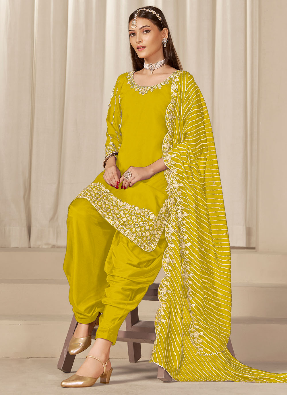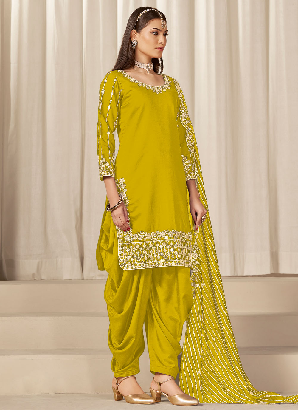 Elevate your ethnic wardrobe with this Mirror and Zari Embroidered Punjabi Salwar Suit in vibrant silk yellow. Adorned with intricate handwork and reflective mirror accents, this suit adds a regal touch to your festive look. Comes with matching bottom and dupatta.