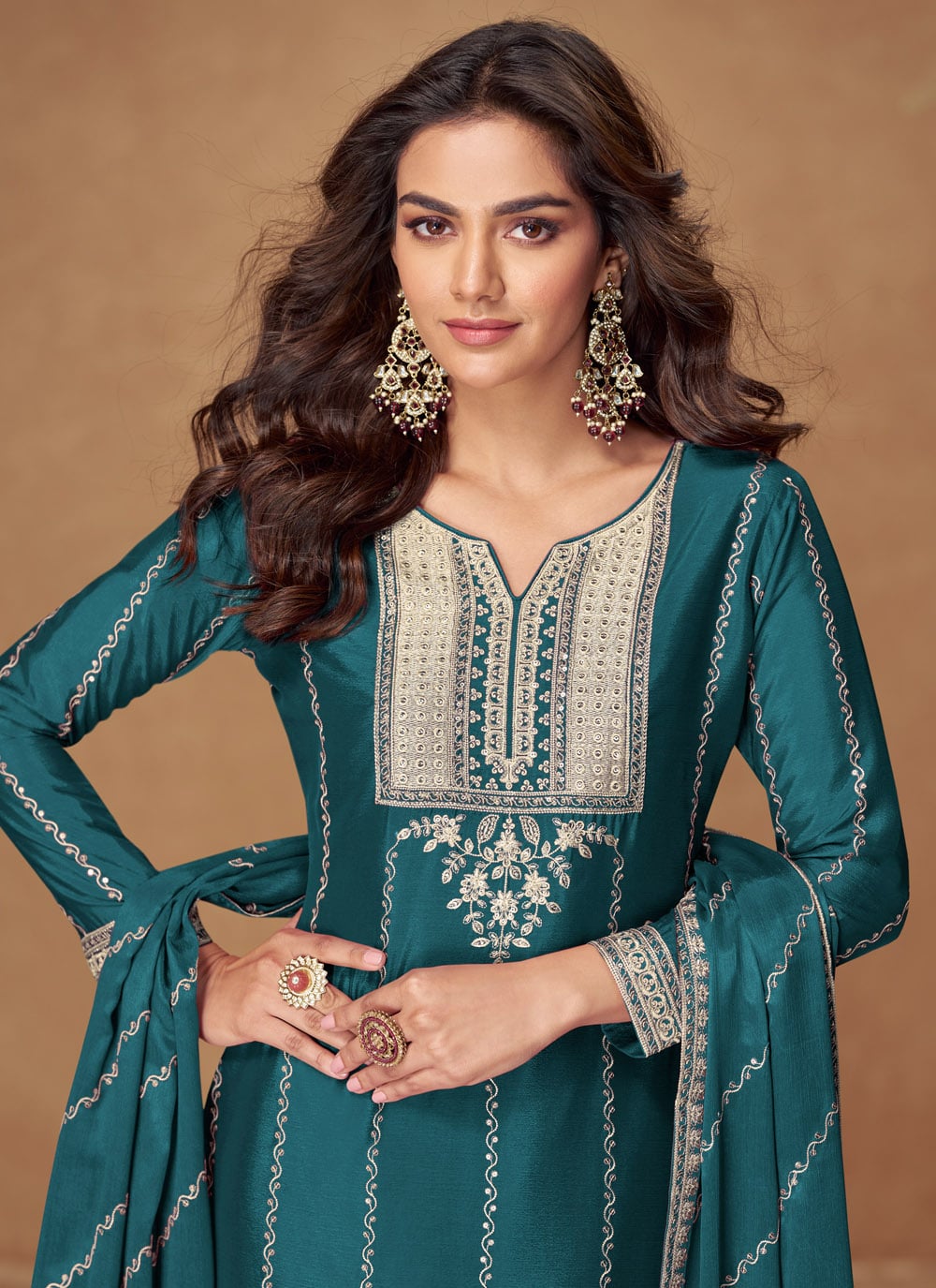 Make every occasion special in this Morpeach Salwar Suit crafted from rich silk and detailed with exquisite zari and sequin work. With its modern silhouette and intricate embellishments, it's the perfect blend of glamour and tradition. Comes with matching bottom and dupatta.