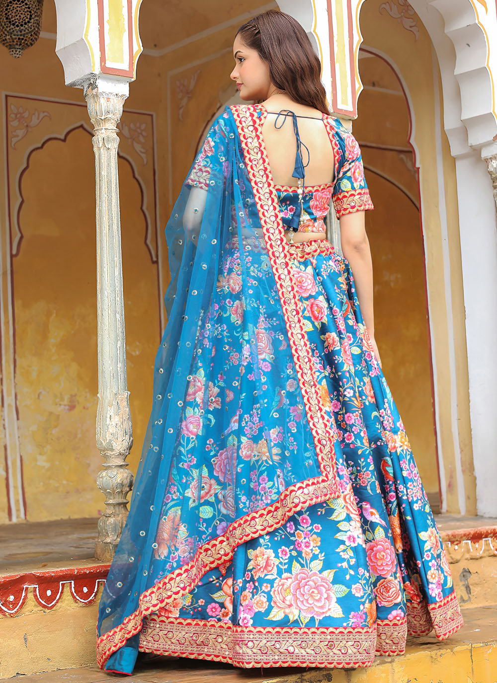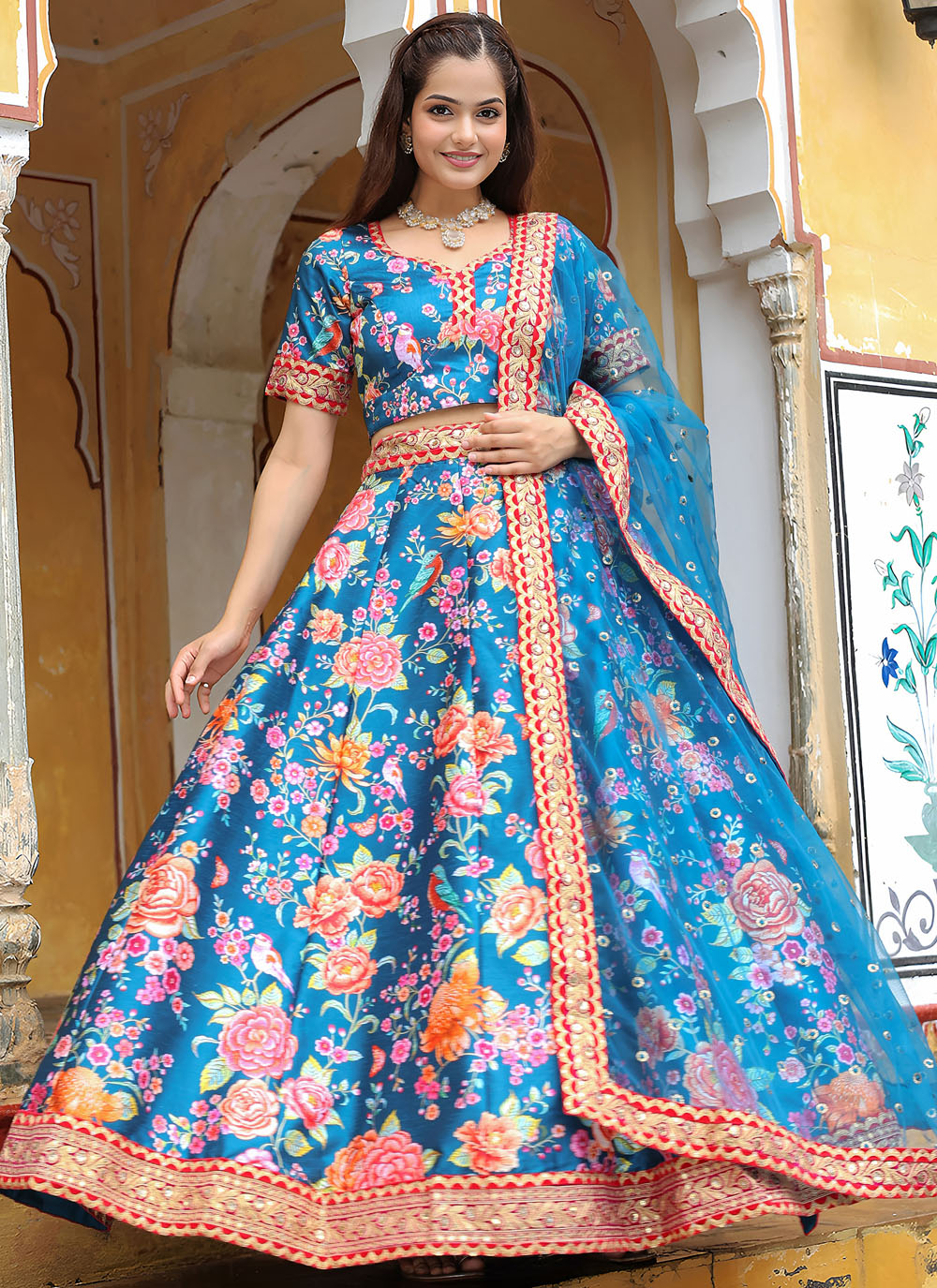 Make a graceful statement with this blue designer lehenga choli crafted in silk. Adorned with ornate zari lace and soft floral prints, it strikes the perfect balance between rich ethnic heritage and modern fashion. Comes with matching choli and dupatta.