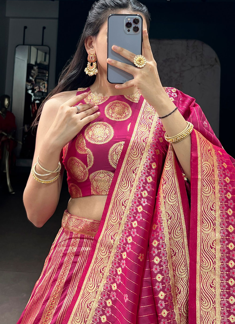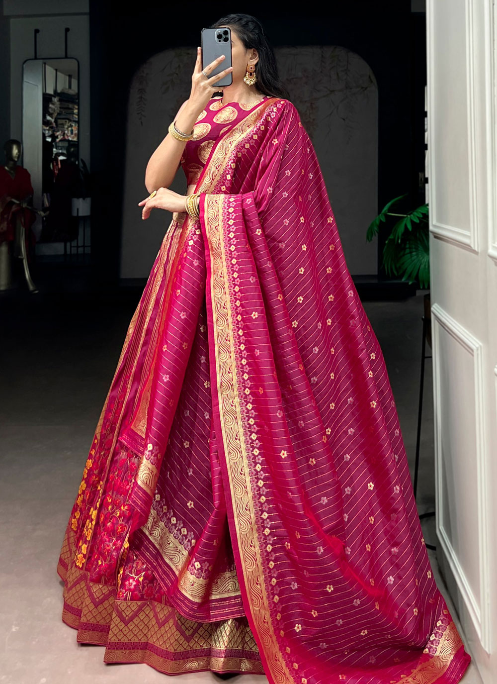 Enhance your ceremonial look with this Silk Zari Weaving Work Ceremonial Lehenga Choli in Rani Colour. The luxurious silk fabric offers a rich appearance, while the intricate zari work adds depth and detail. Comes with matching choli and dupatta.