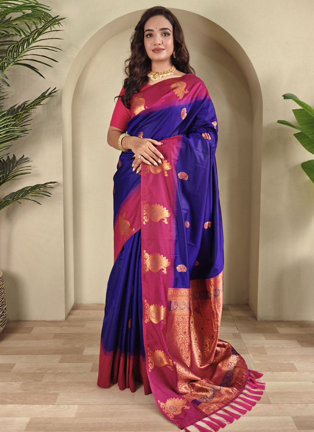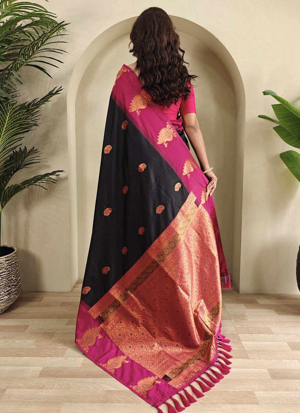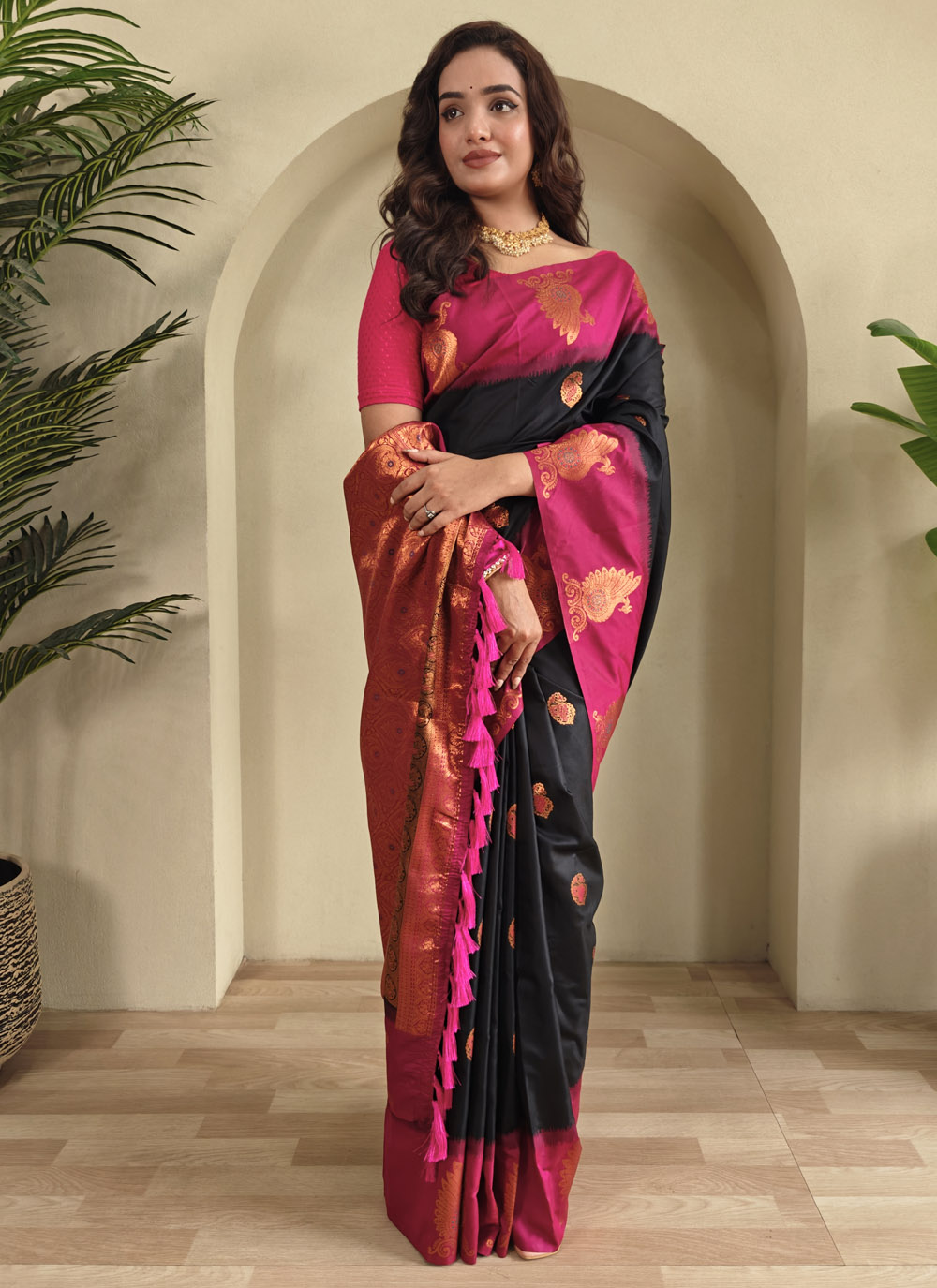 Command attention with this Classic Black Silk Saree, gleaming with resplendent Zari weaving work. Its luxurious drape and subtle shimmer make it the perfect choice for grand occasions and evening events. A truly captivating ensemble that defines elegance. Comes with matching blouse.