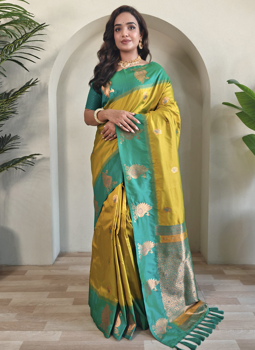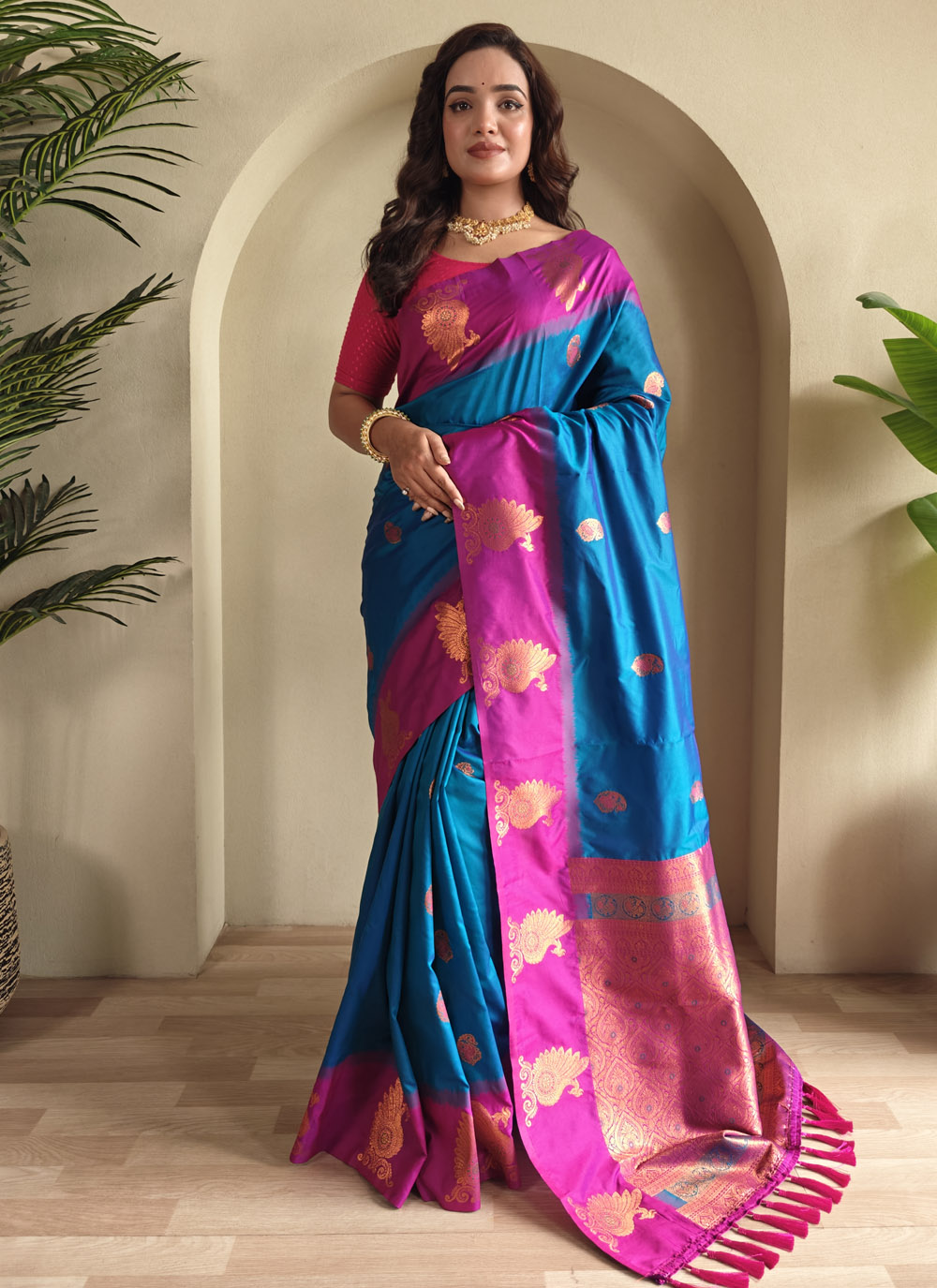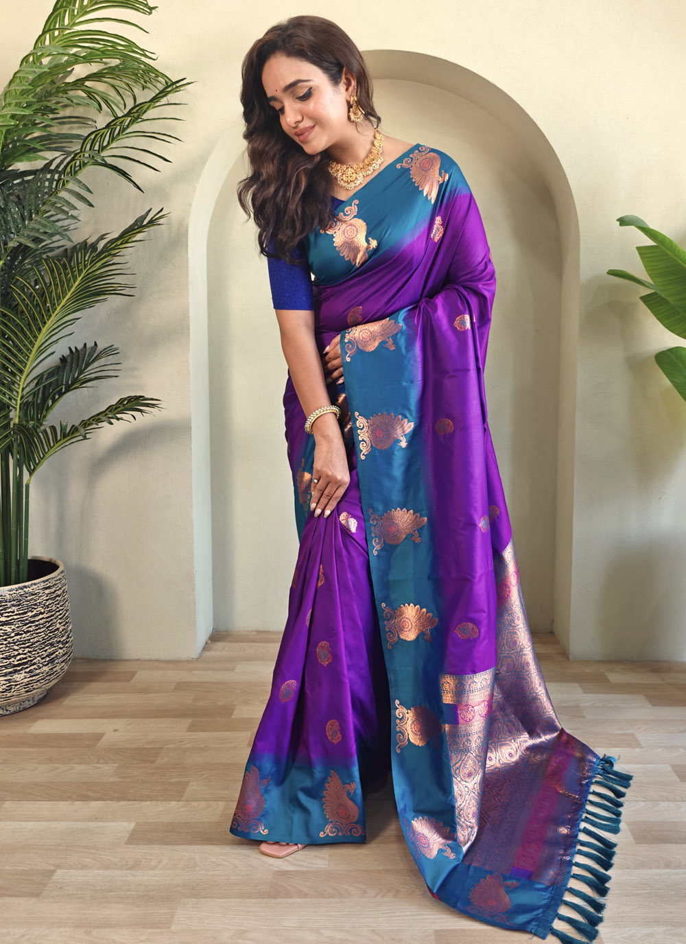 Command attention with this Classic Black Silk Saree, gleaming with resplendent Zari weaving work. Its luxurious drape and subtle shimmer make it the perfect choice for grand occasions and evening events. A truly captivating ensemble that defines elegance. Comes with matching blouse.