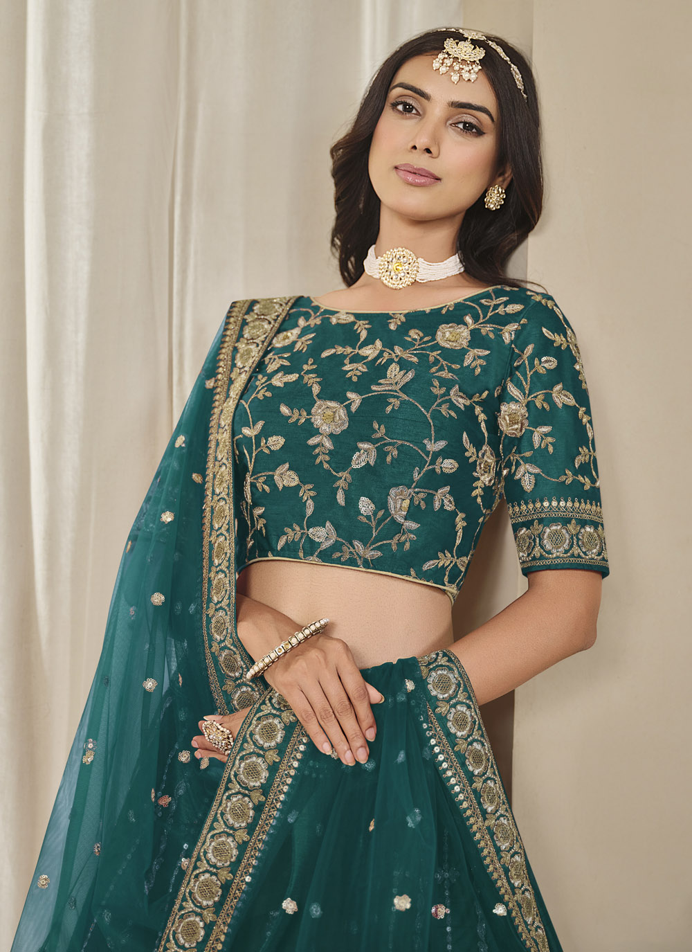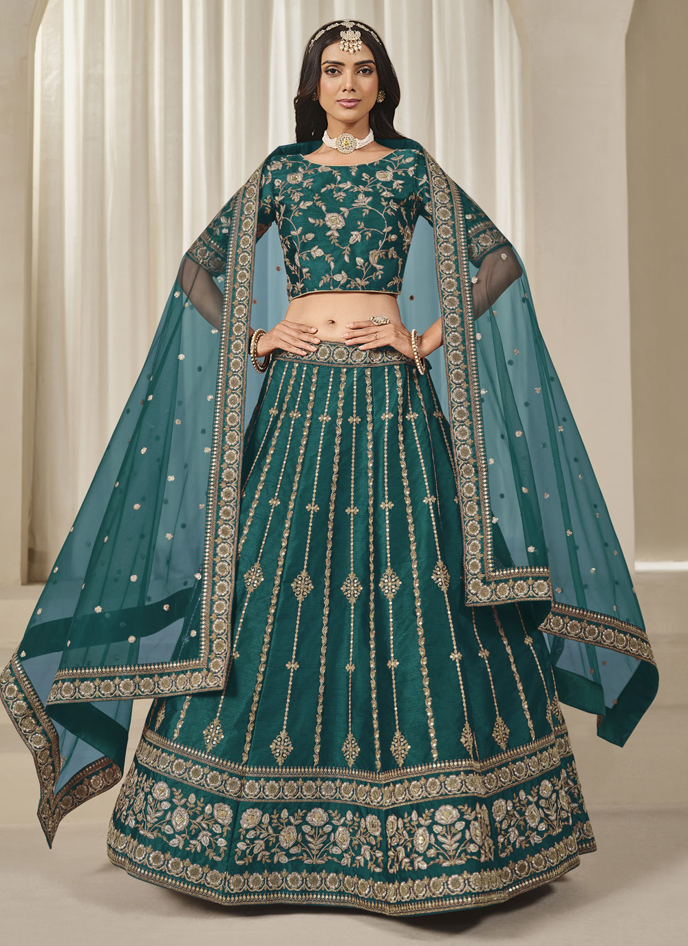 Make a lasting impression in this stunning teal lehenga choli made from smooth art silk. With shimmering sequins and traditional zari work, it’s designed to give you a regal and radiant look that’s perfect for sangeet ceremonies and evening festivities. Comes with matching choli and dupatta.