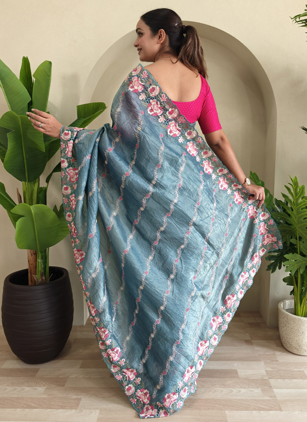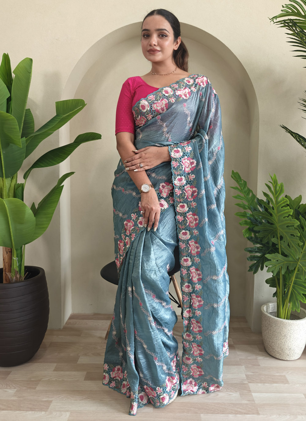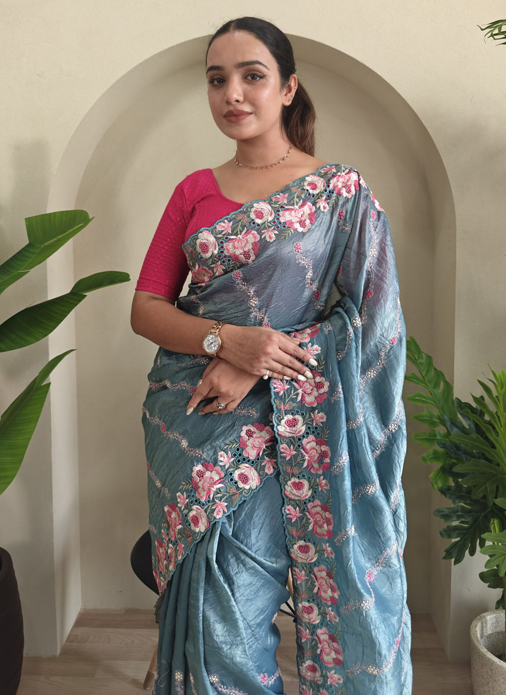 Step into timeless elegance with this Teal Crush Silk Saree, featuring intricate embroidery and exquisite cut work detailing. Perfect for those who love a blend of tradition and modernity, this saree is a statement piece for parties, receptions, and cultural celebrations. Comes with matching blouse.