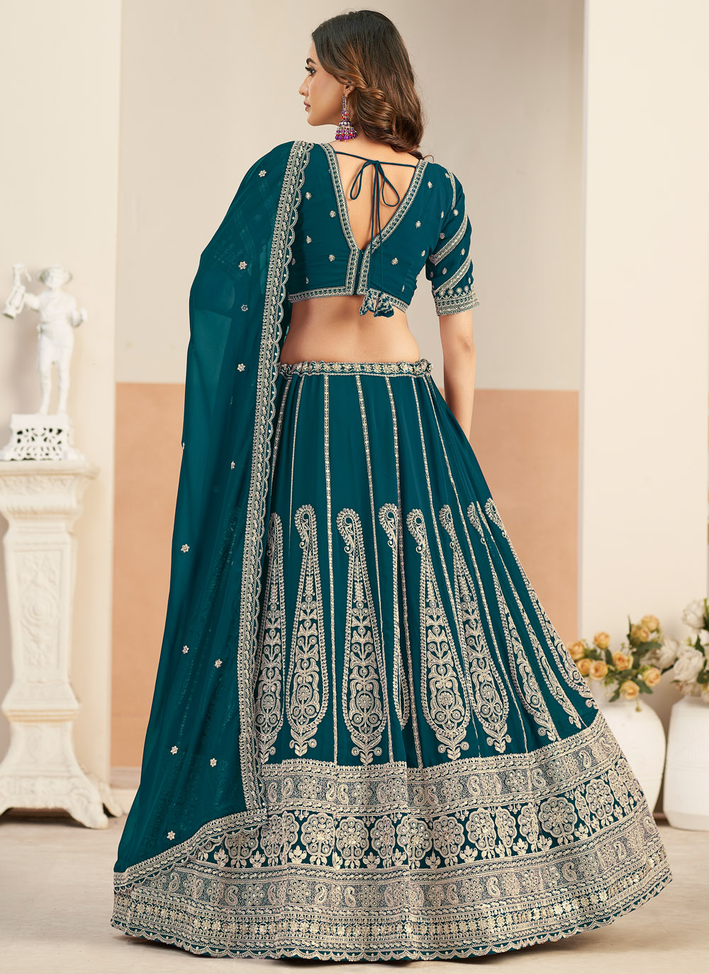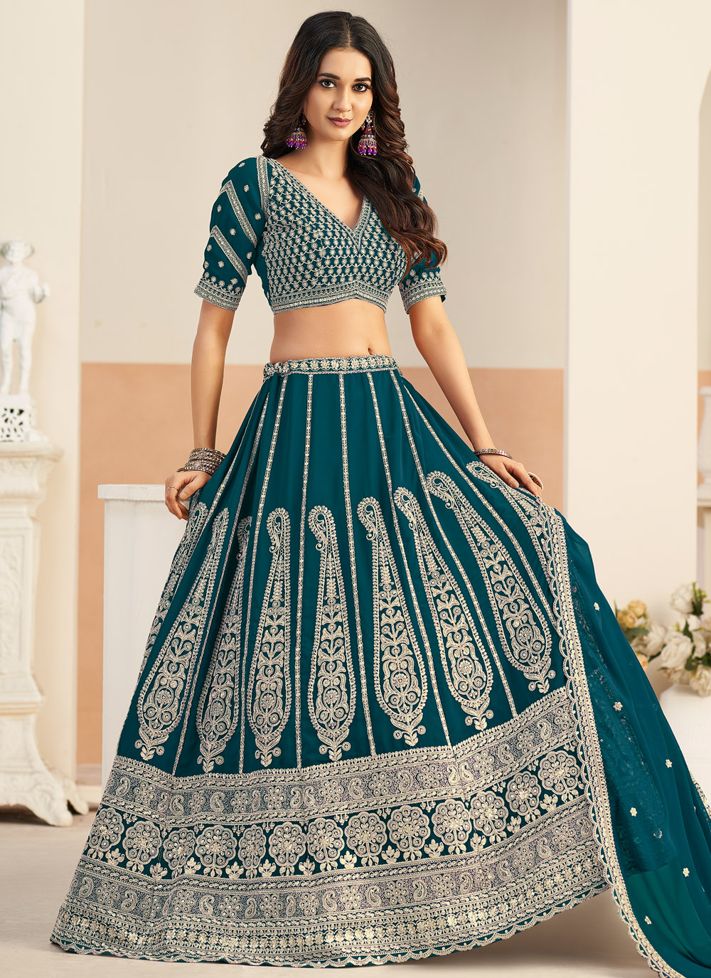 Enhance your festive wardrobe with this teal faux georgette lehenga choli featuring elegant resham embroidered work. The refreshing teal shade adds uniqueness, while the detailed embroidery gives a premium designer finish. Comes with matching choli and dupatta.