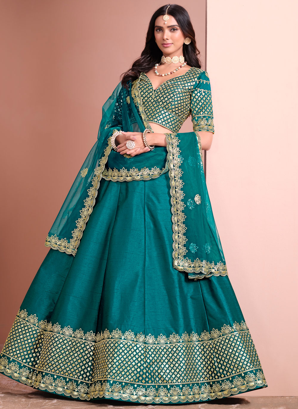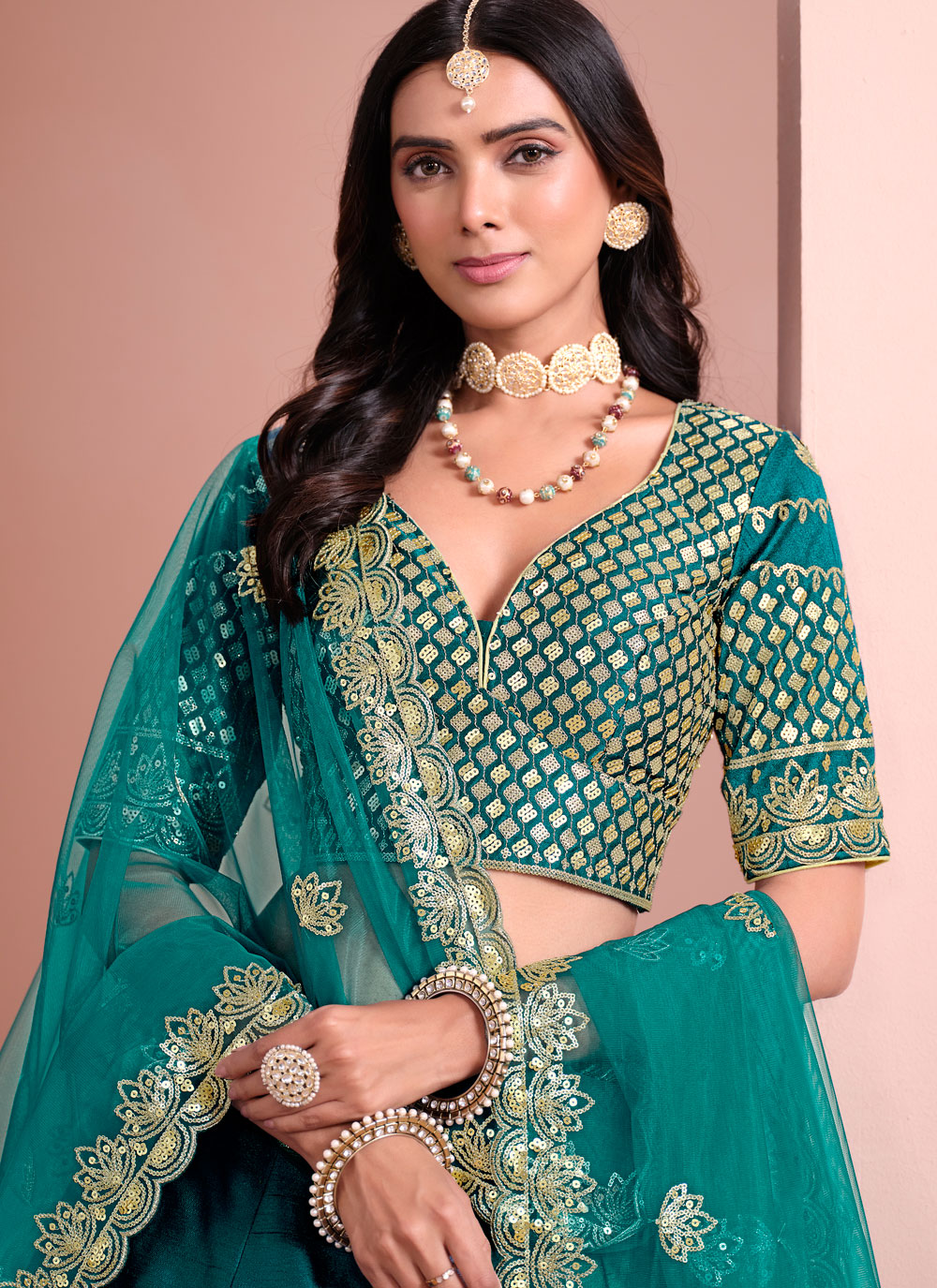 This Teal Embroidered Sequins Art Silk Lehenga Choli, with a matching dupatta, features intricate embroidery and sequins for a glamorous look. Perfect for weddings and festive occasions, it combines elegance and modern style.