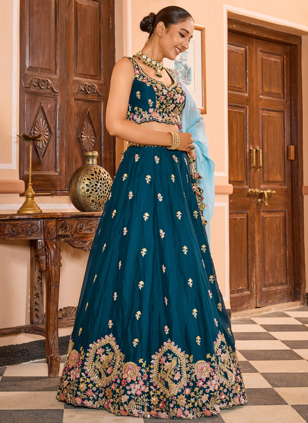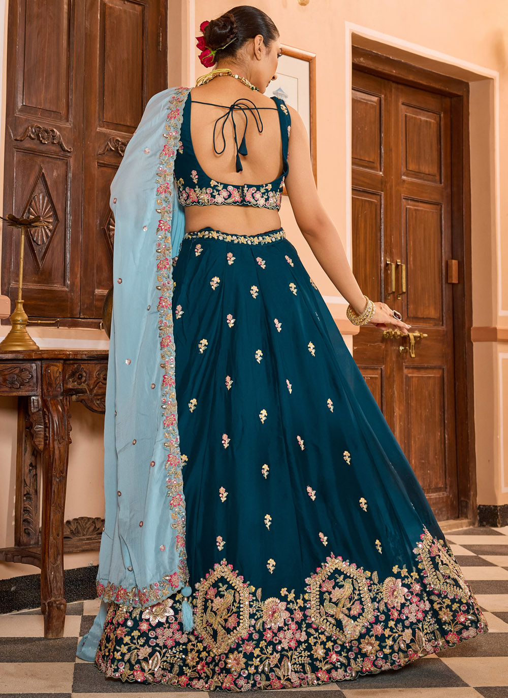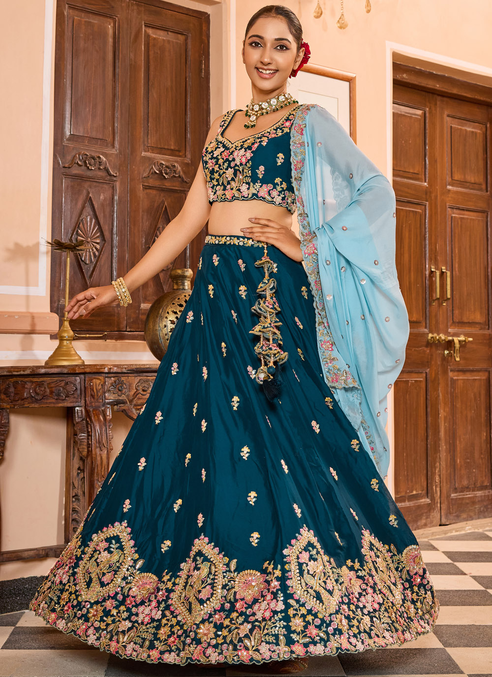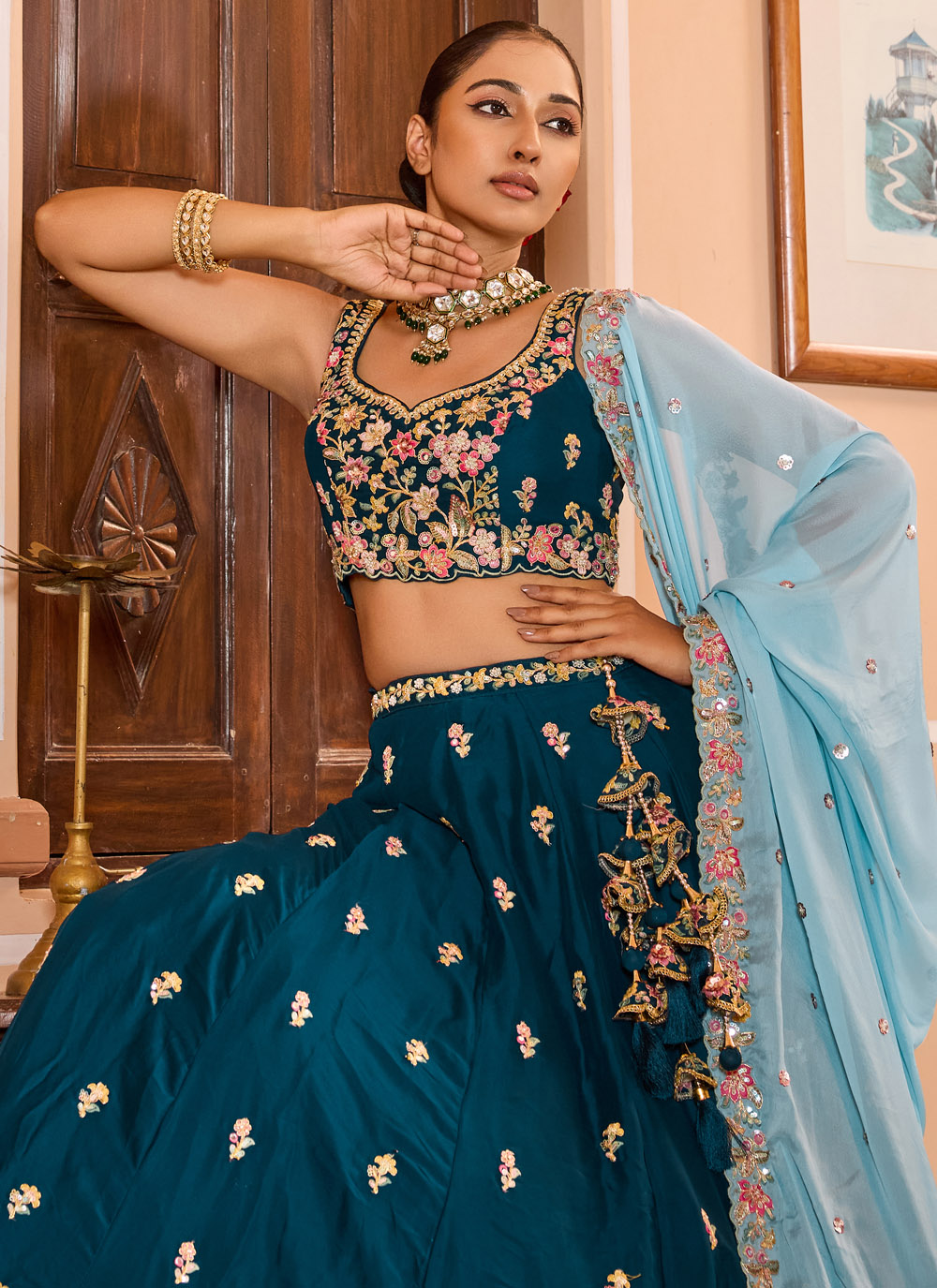 This teal georgette lehenga choli brings a refreshing and elegant festive look. The lehenga is decorated with sequins and mirror embroidery that adds a radiant sparkle to the outfit. The soft georgette fabric flows beautifully, offering comfort with style. Comes with matching choli and dupatta.