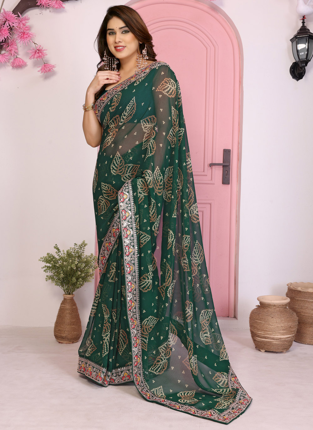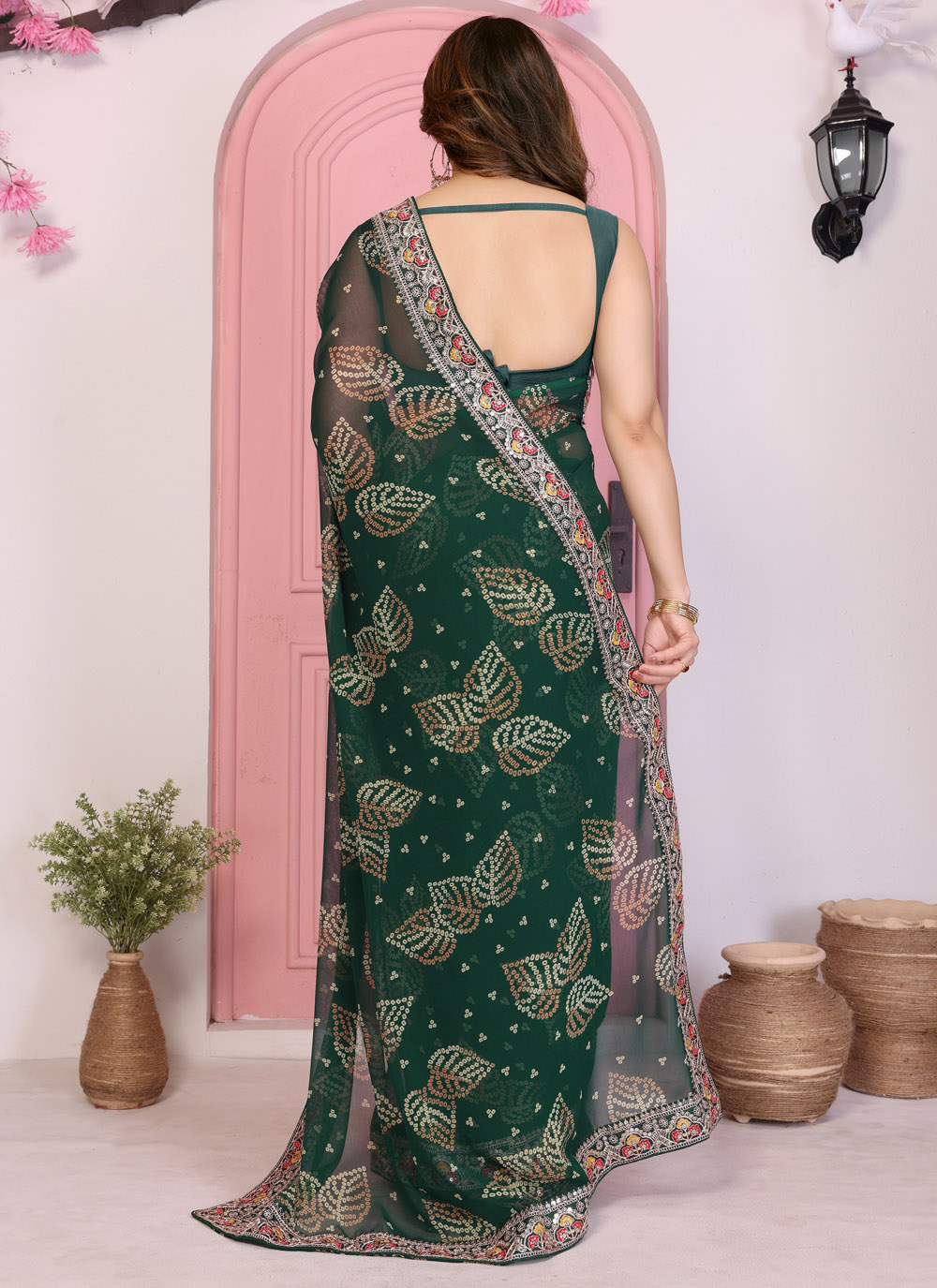 This Teal Bandhej Print Saree in Georgette with embroidered patch borders perfectly blends tradition with sophistication. The fine embroidery work enhances the timeless Bandhej design, making it a versatile drape for cultural ceremonies and special occasions. Comes with matching blouse.