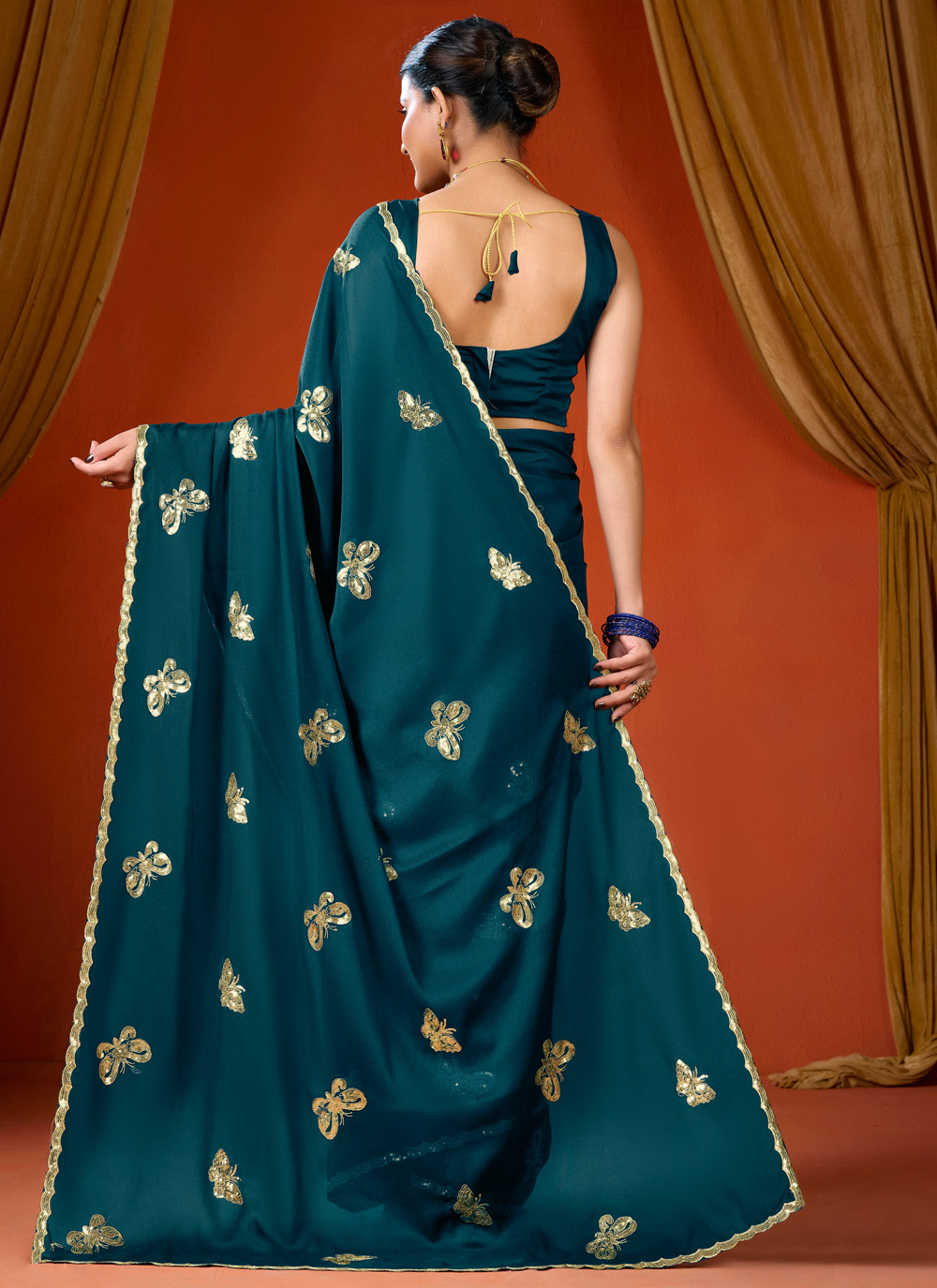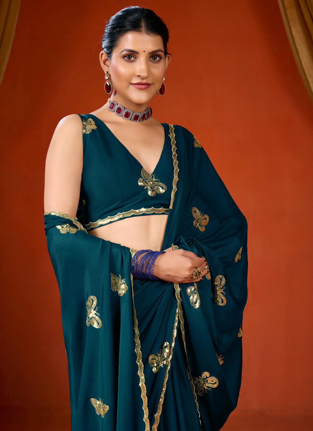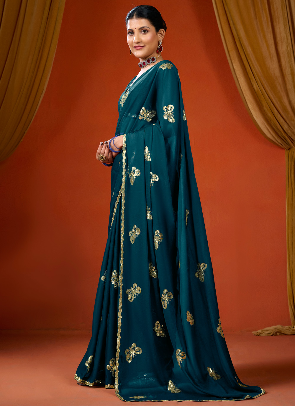 Add modern elegance to your ethnic wardrobe with this Trendy Teal Georgette Saree. The soft georgette fabric offers comfort and grace, while the sequins detailing enhances its stylish appeal. Comes with matching blouse.