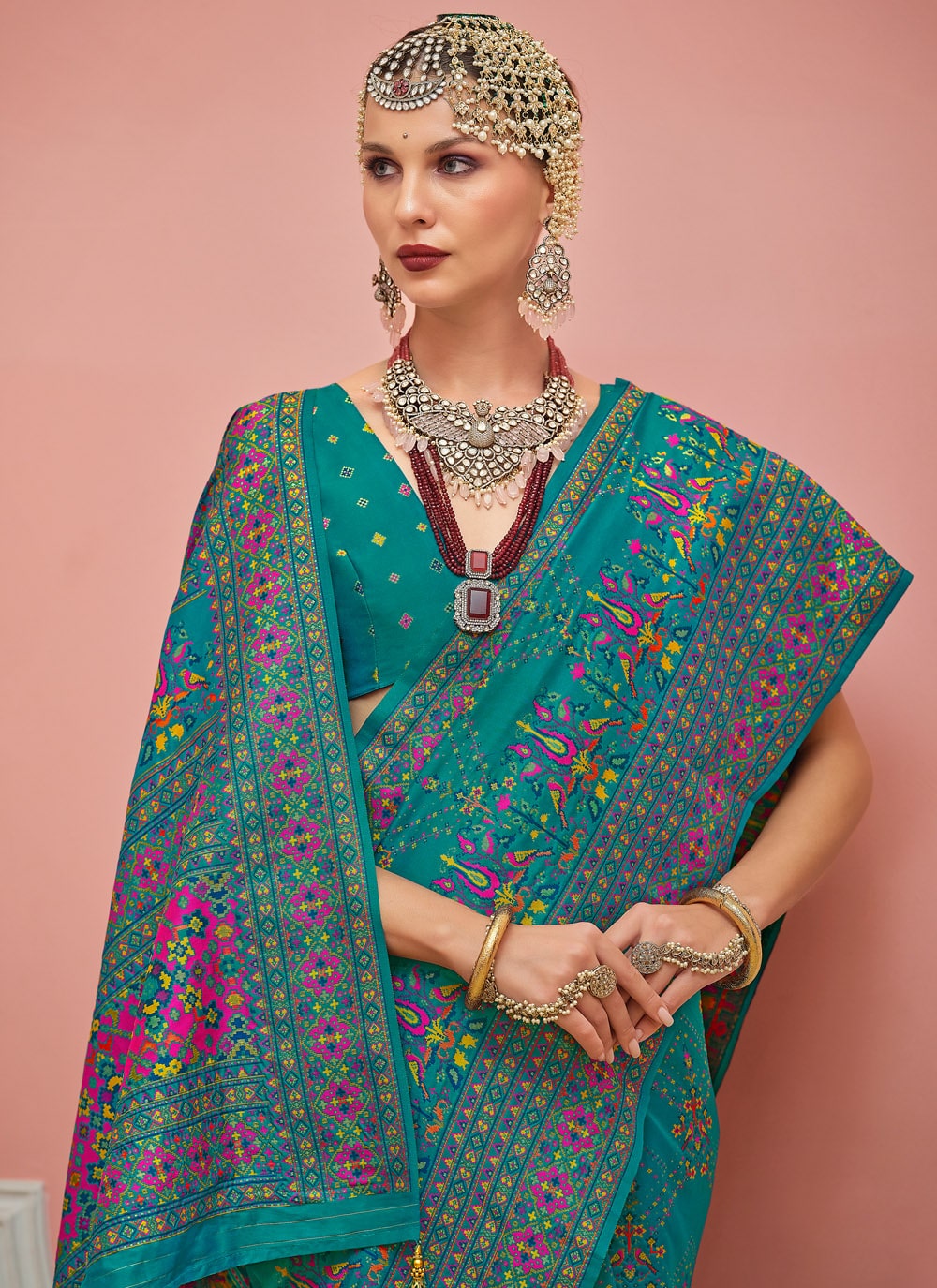 This teal Banarasi silk saree celebrates the richness of Indian weaving traditions with its beautifully crafted Meenakari work. The fabric flows smoothly, offering a regal charm ideal for festive gatherings or traditional events. Comes with matching blouse.