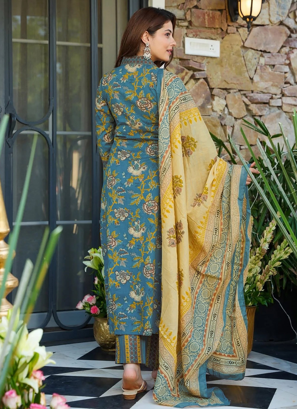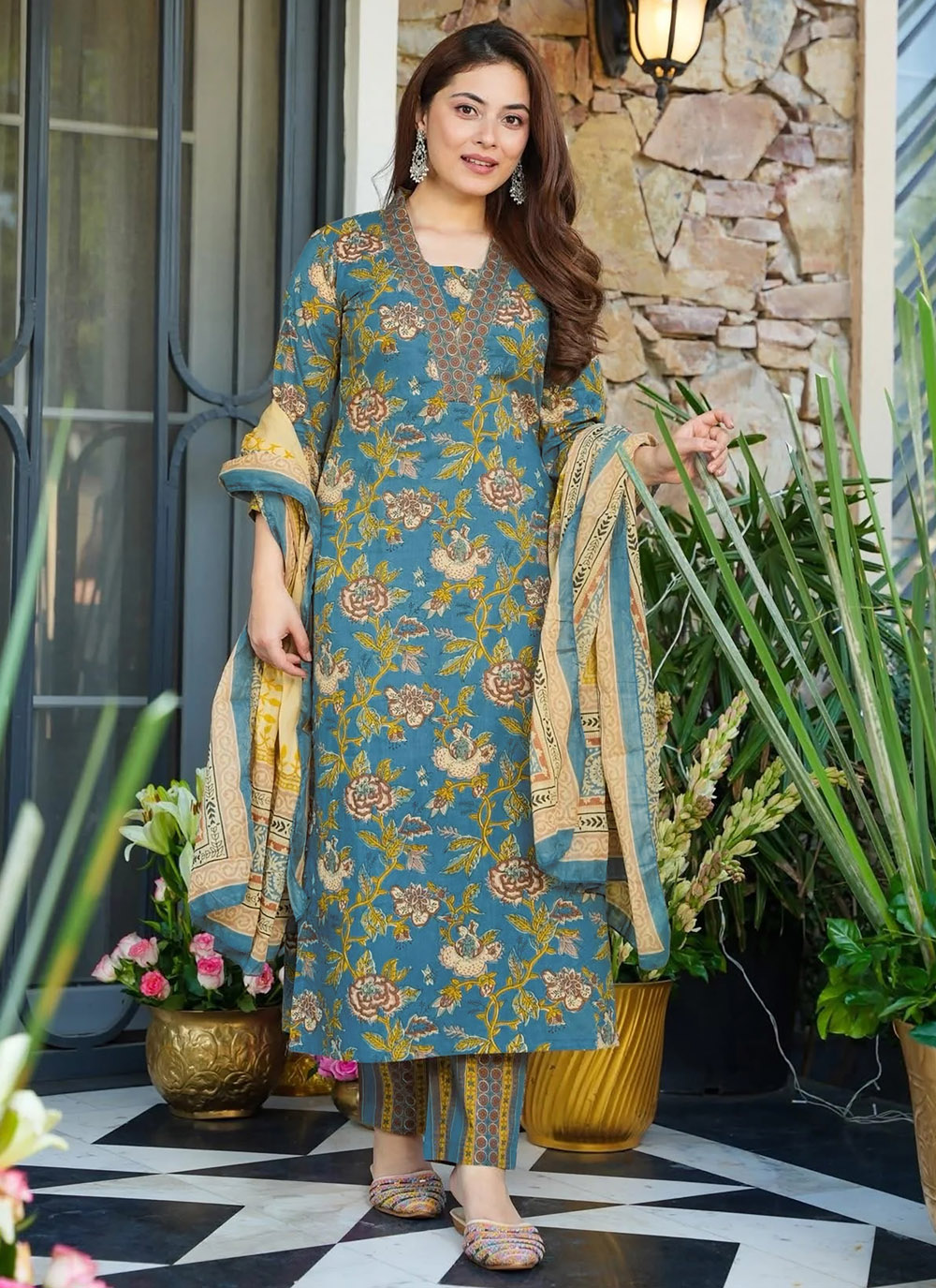Crafted from soft muslin fabric, this teal salwar suit features modern digital prints that add charm and freshness. Its easy fit and smooth texture make it suitable for office wear and daytime events. Comes with matching bottom and dupatta.