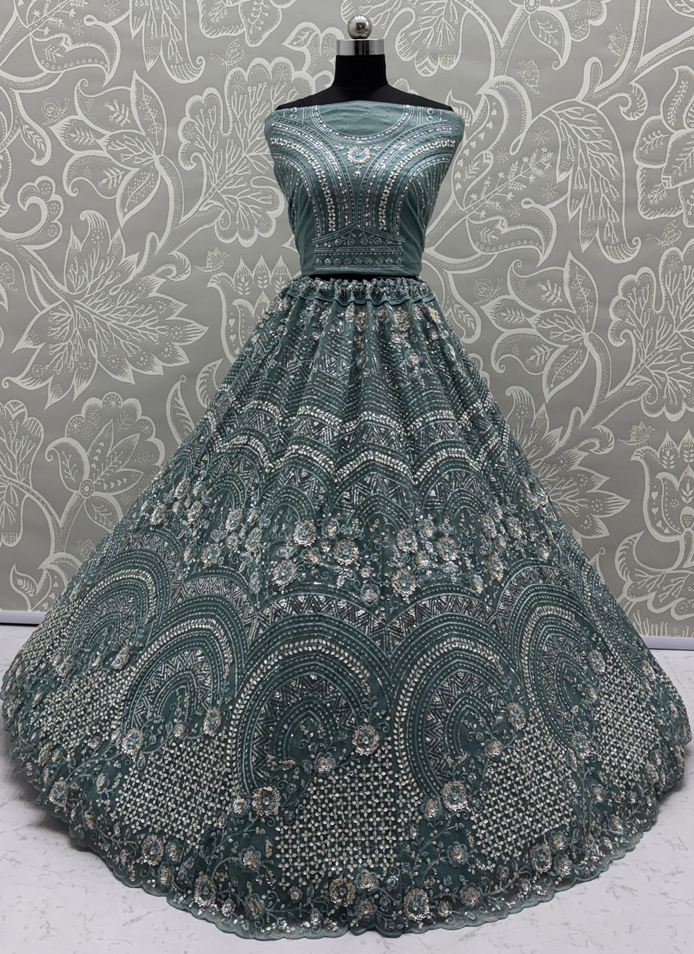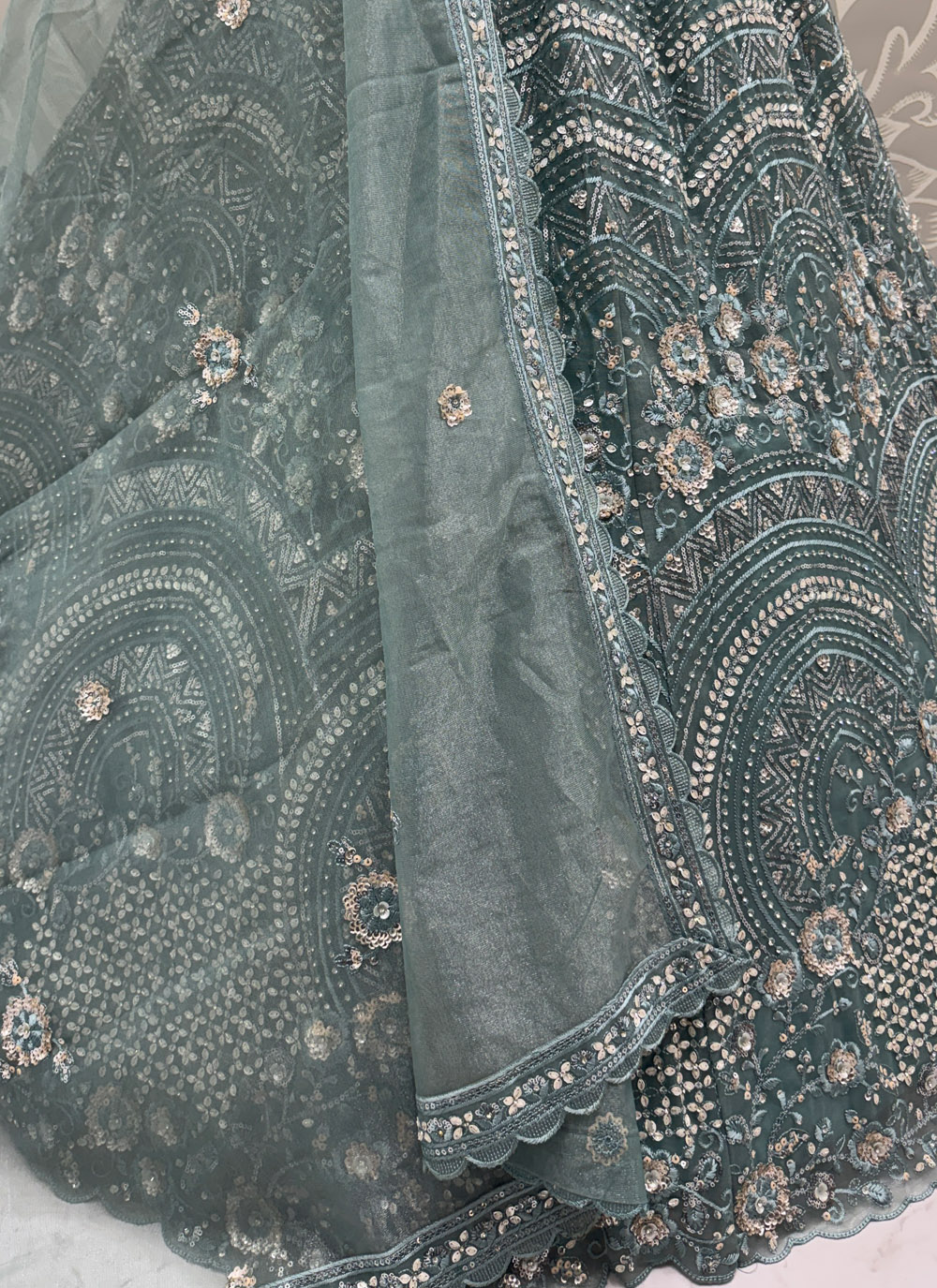 Make every celebration memorable with this Teal Net Lehenga Choli featuring fine beadwork, multi-thread embroidery, shimmering sequins, and diamond embellishments. The flowy net skirt and stylish choli offer a flattering silhouette with modern appeal. Comes with matching choli and dupatta.