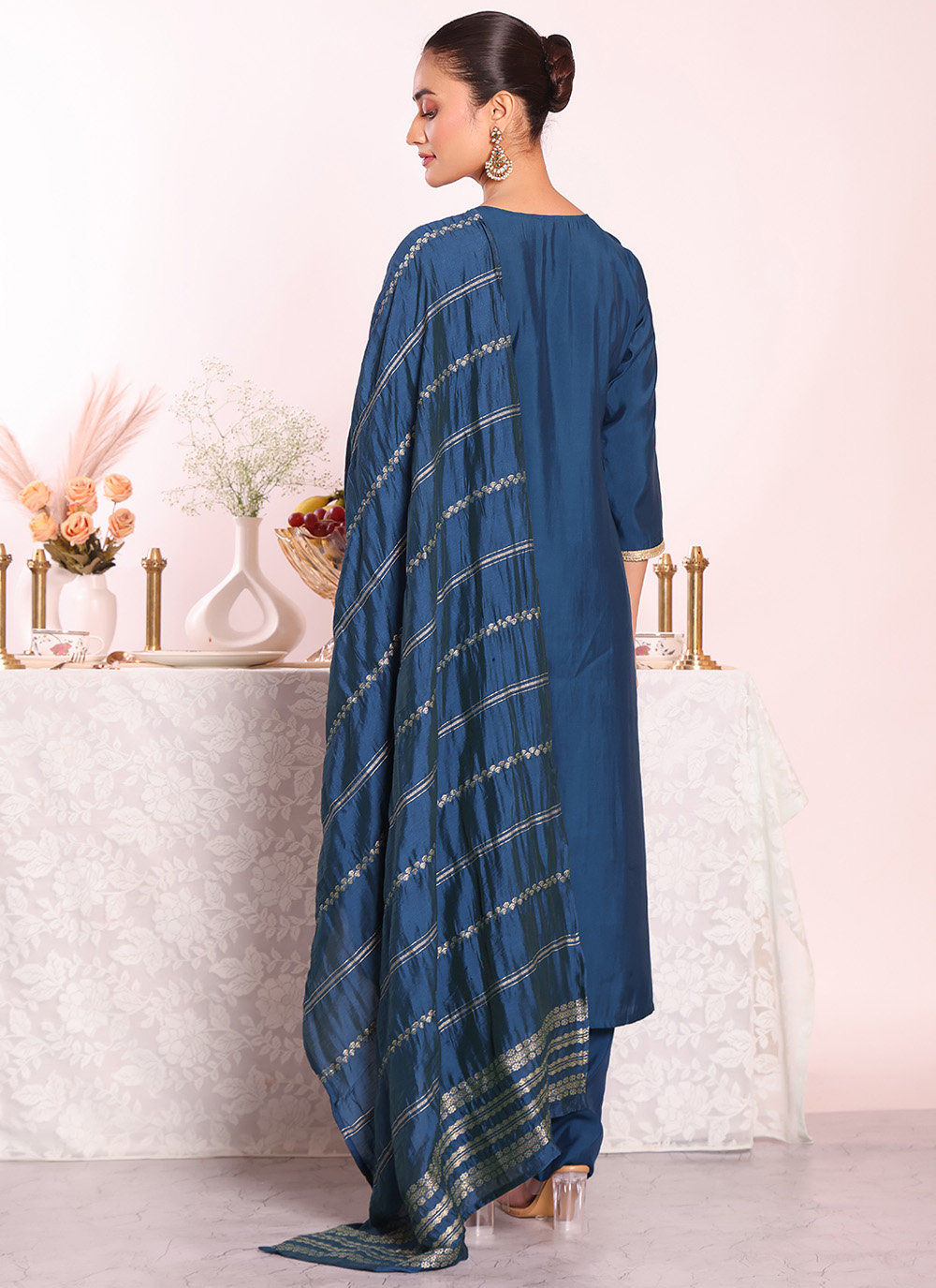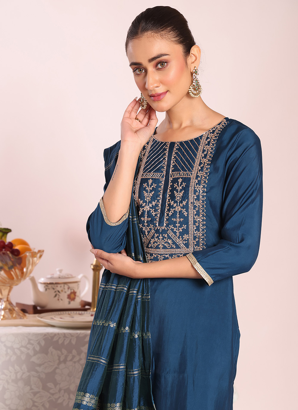 Step into sophistication with this beautifully crafted teal salwar kameez made from premium poly silk fabric. The intricate embroidery adds a rich decorative element, making it ideal for celebrations and special occasions. Comes with matching bottom and dupatta.
