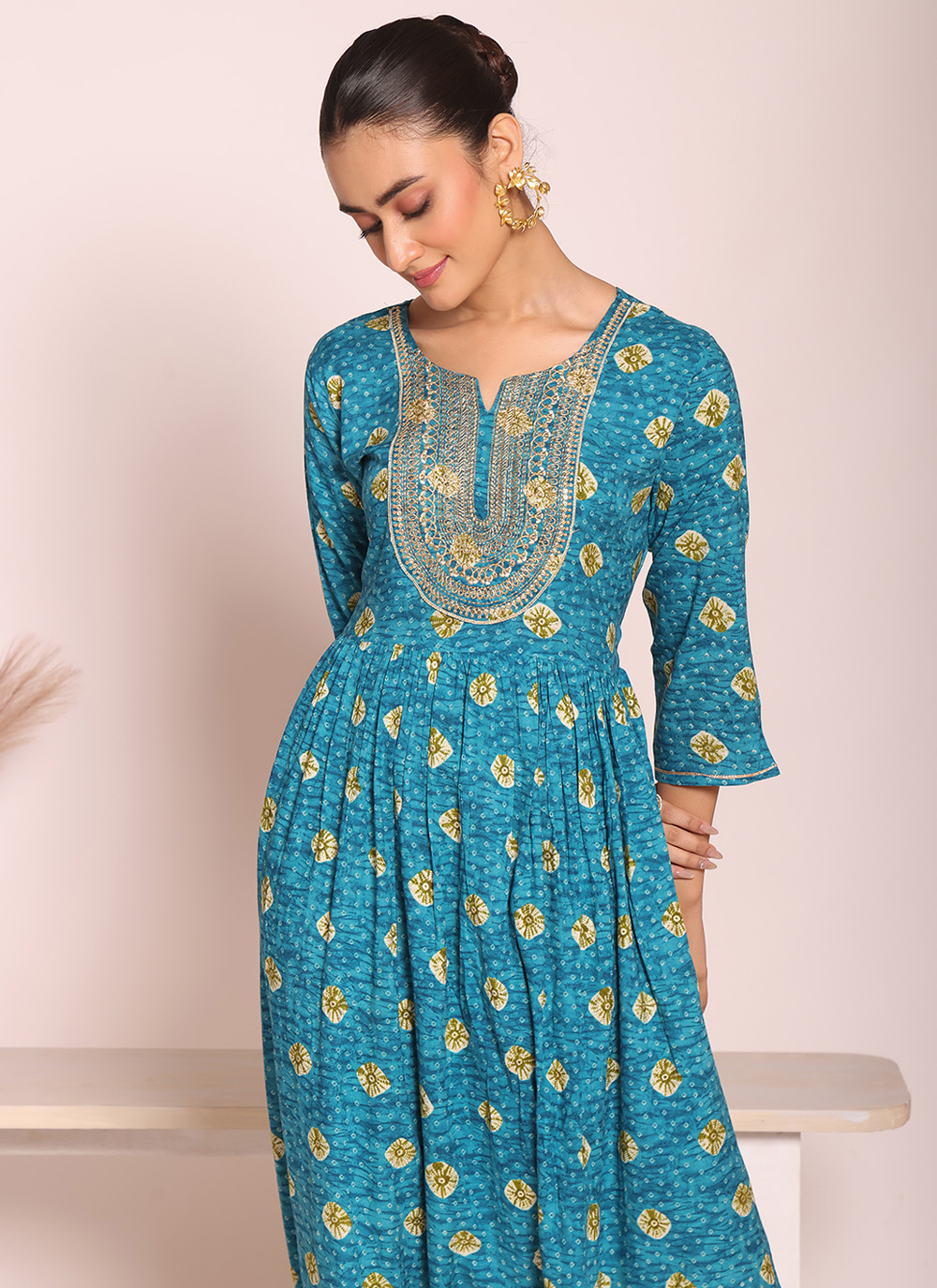 Refresh your ethnic wardrobe with this stylish teal poly silk printed and embroidered trendy kurti, designed to deliver elegance with everyday comfort.