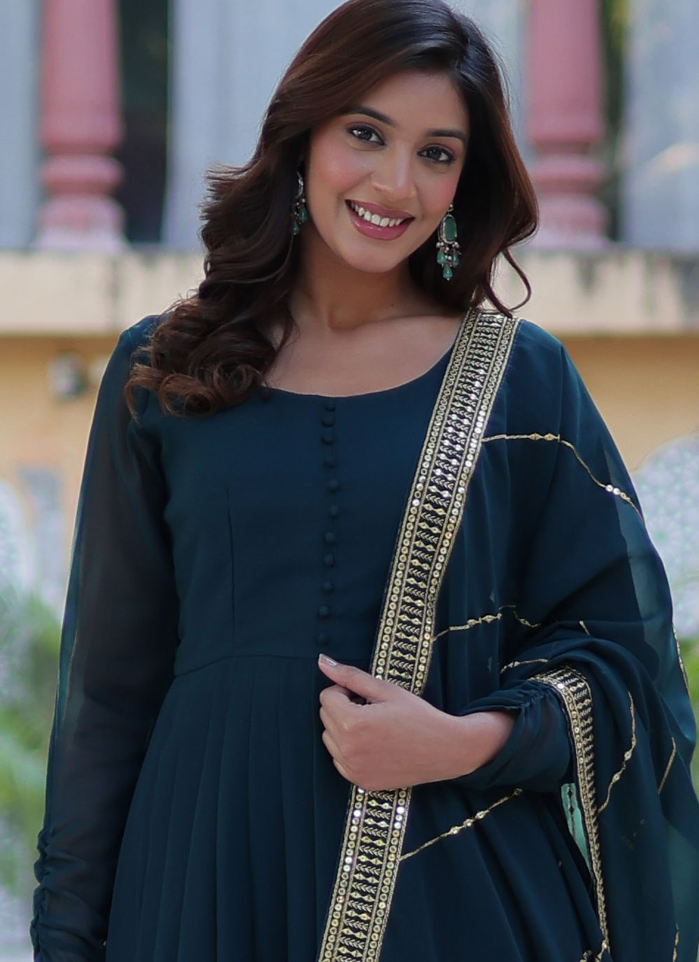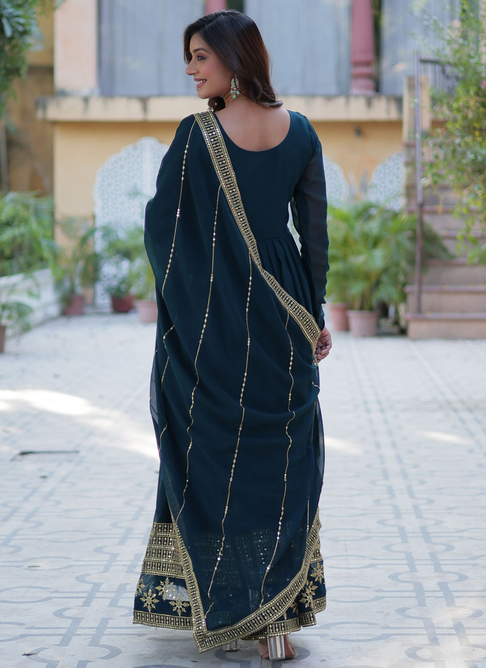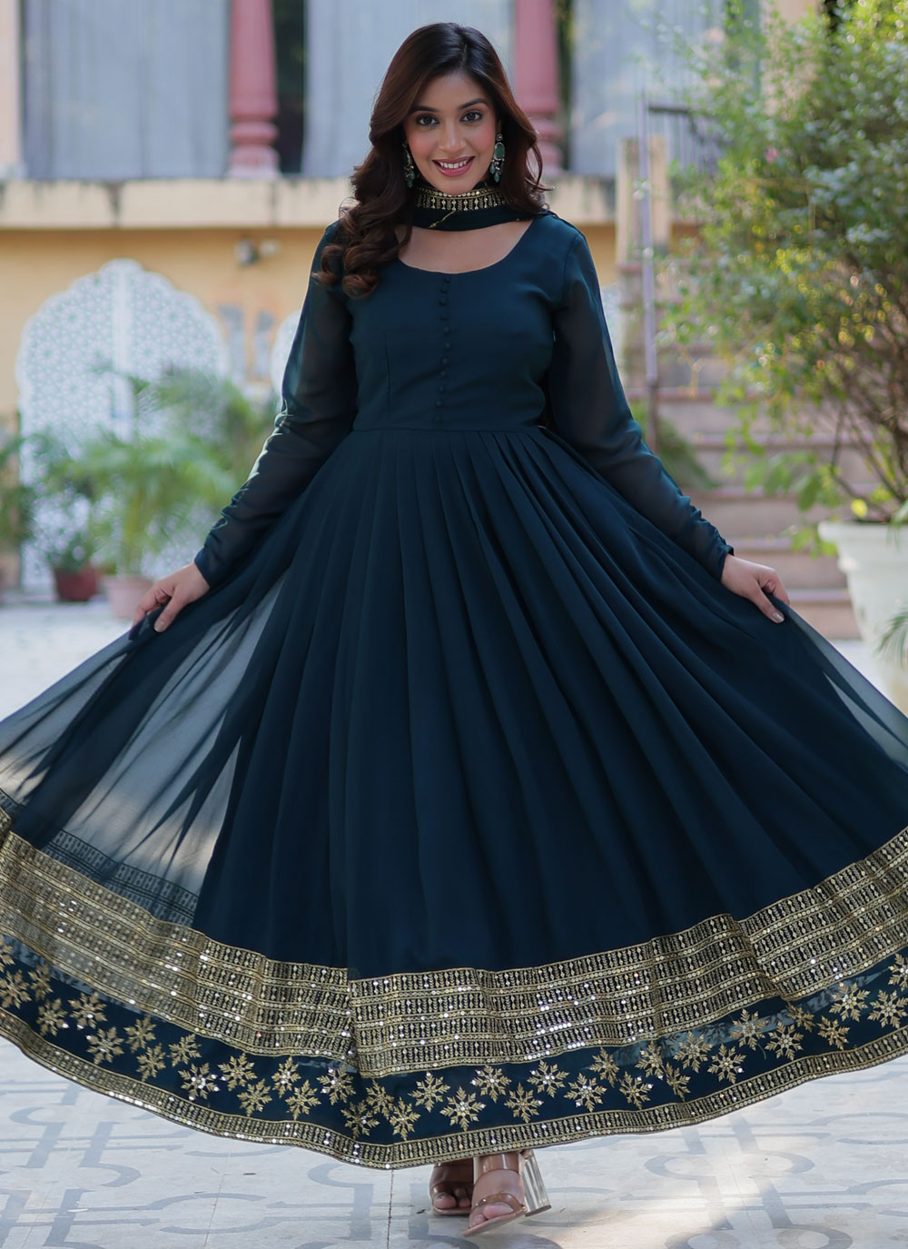 The Teal Sequins Thread Trendy Readymade Gown, with a matching dupatta, combines elegance and glamour. Perfect for parties and special occasions, its intricate sequins and rich teal color create a chic, standout look.
