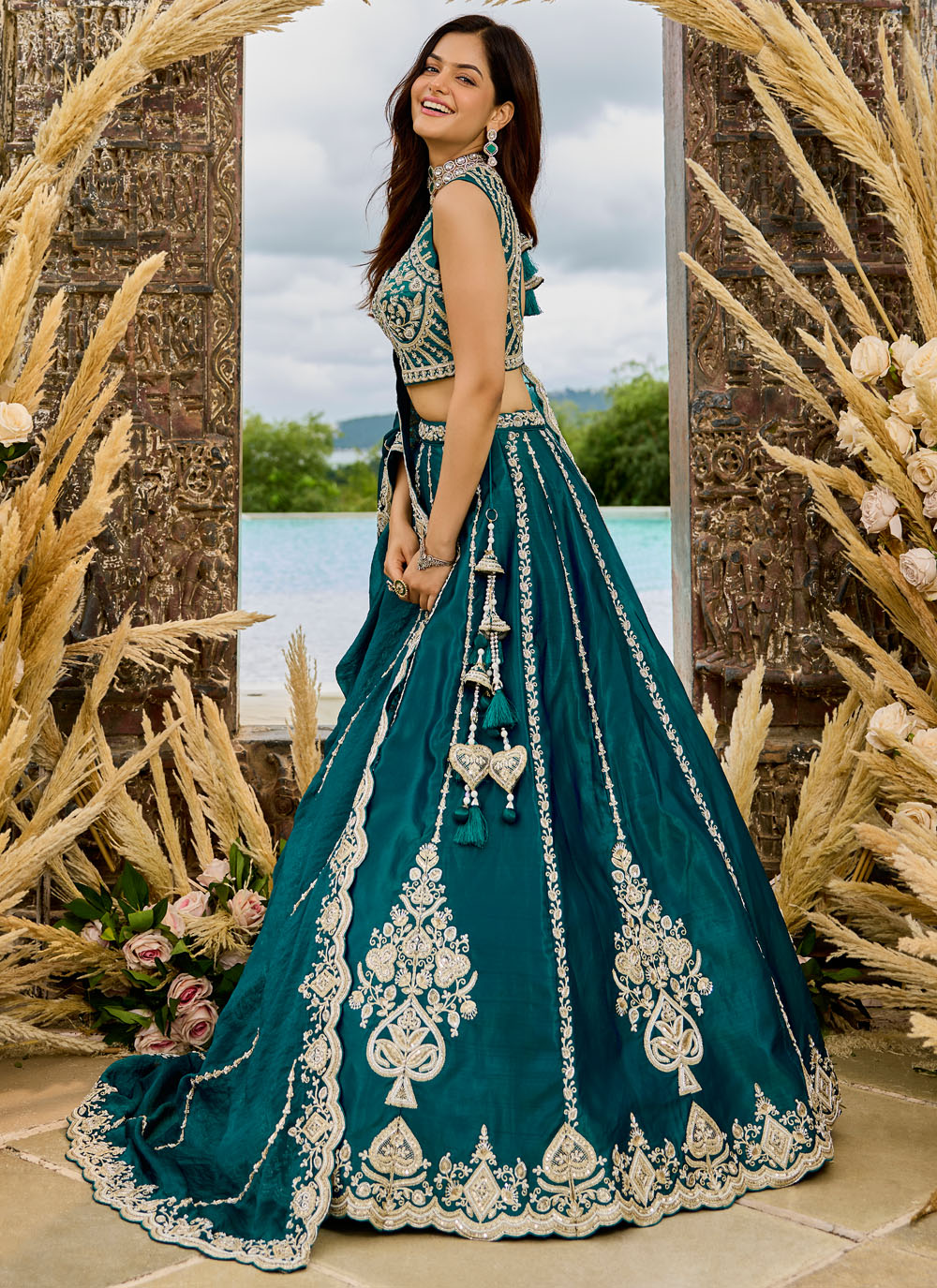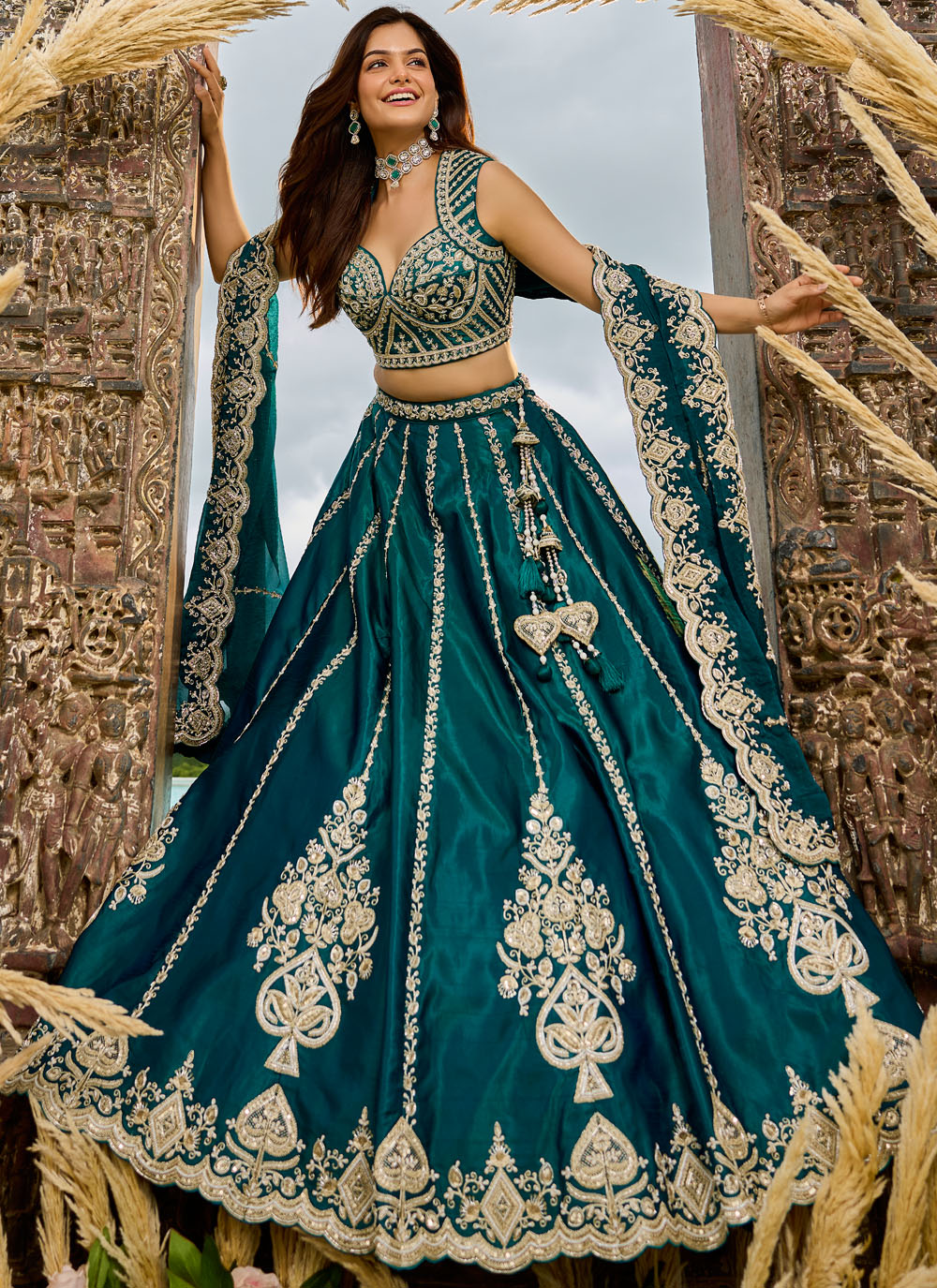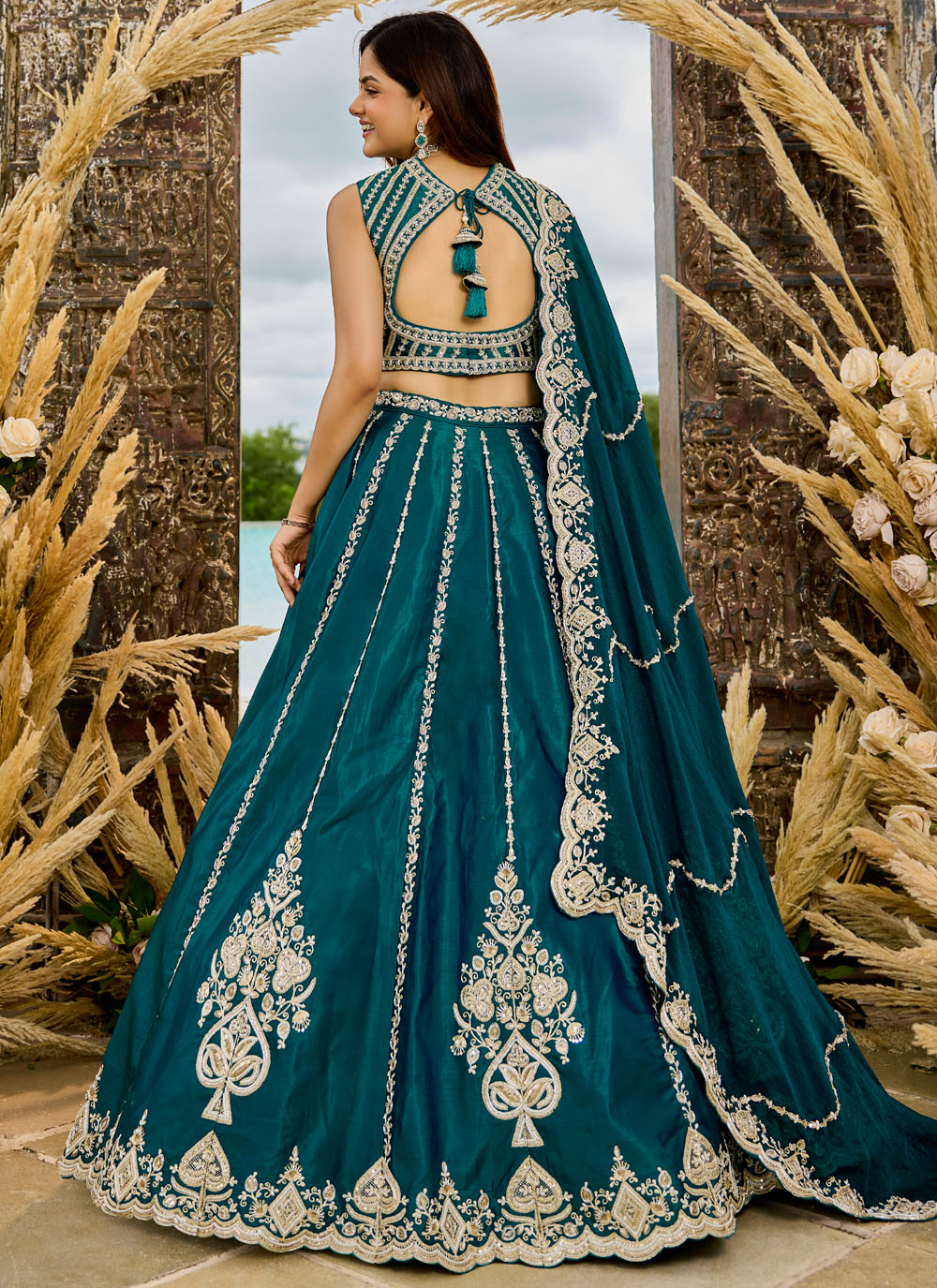 Step into elegance with the Teal Silk Beads Sequins Embroidered Designer Lehenga Choli. The smooth silk fabric gives the outfit a royal feel, while the bead and sequin work adds brilliant sparkle to the design. Comes with matching choli and dupatta.