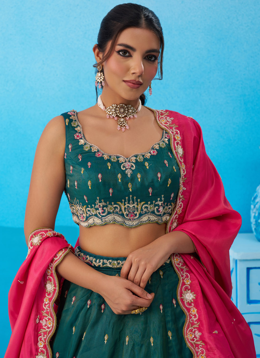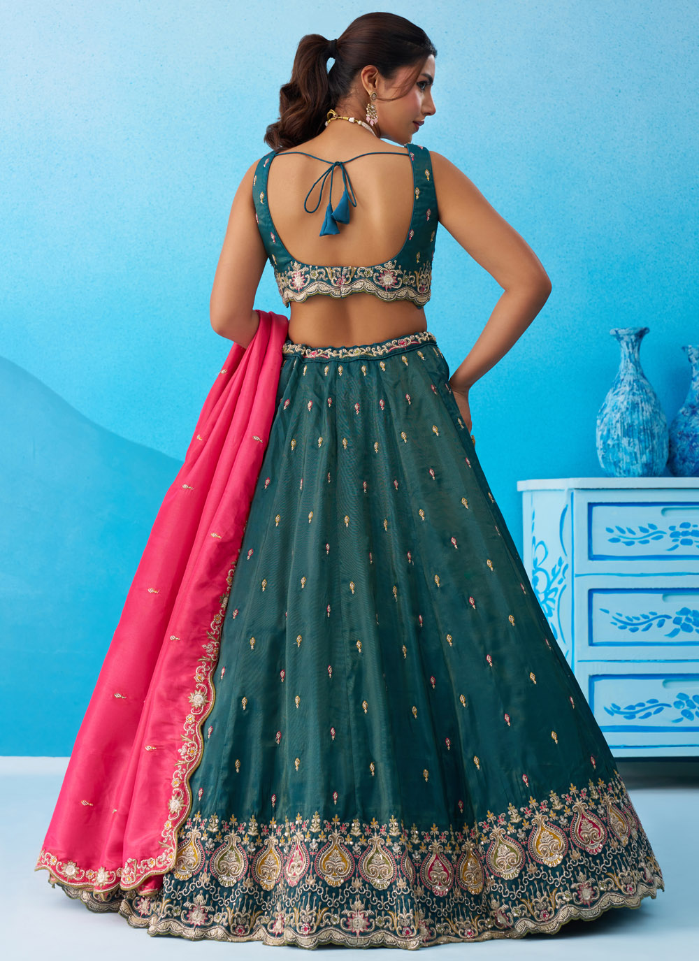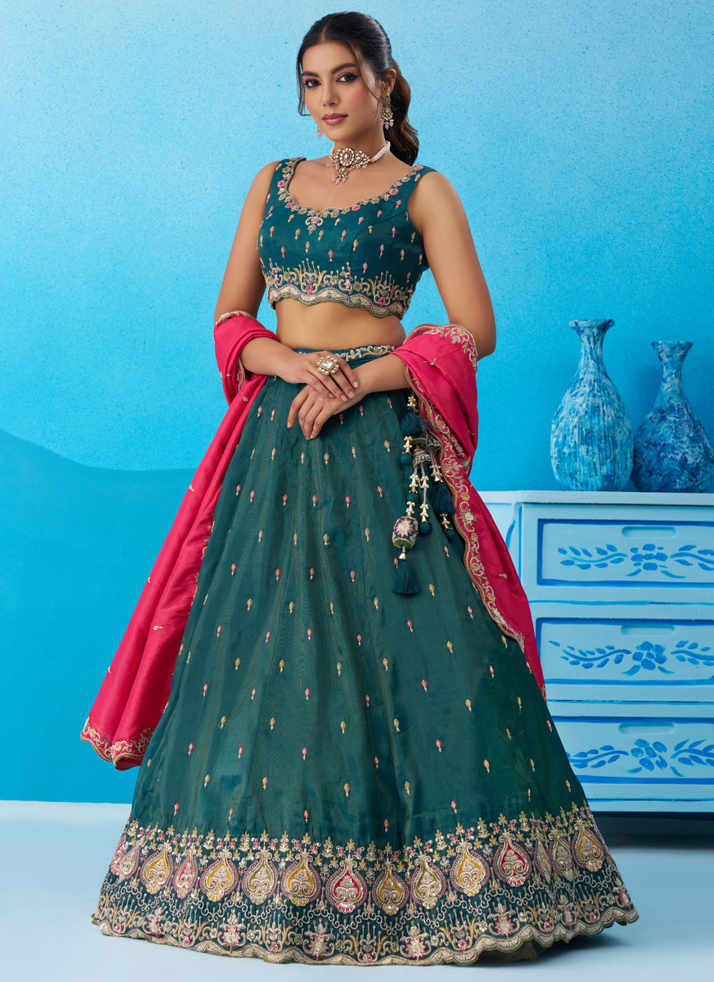 The Teal Silk Beads Sequins Thread Embroidered Lehenga Choli for Ceremonial beautifully blends traditional craftsmanship with modern elegance. Designed with silk fabric, the lehenga features detailed embroidery decorated with shimmering sequins and bead work. Comes with matching choli and dupatta.
