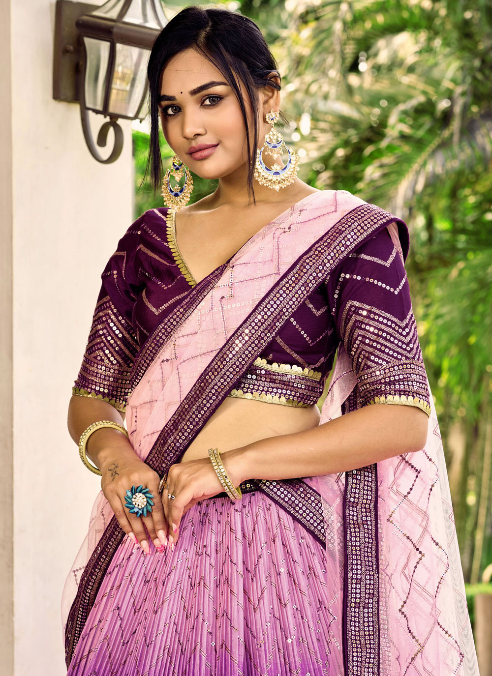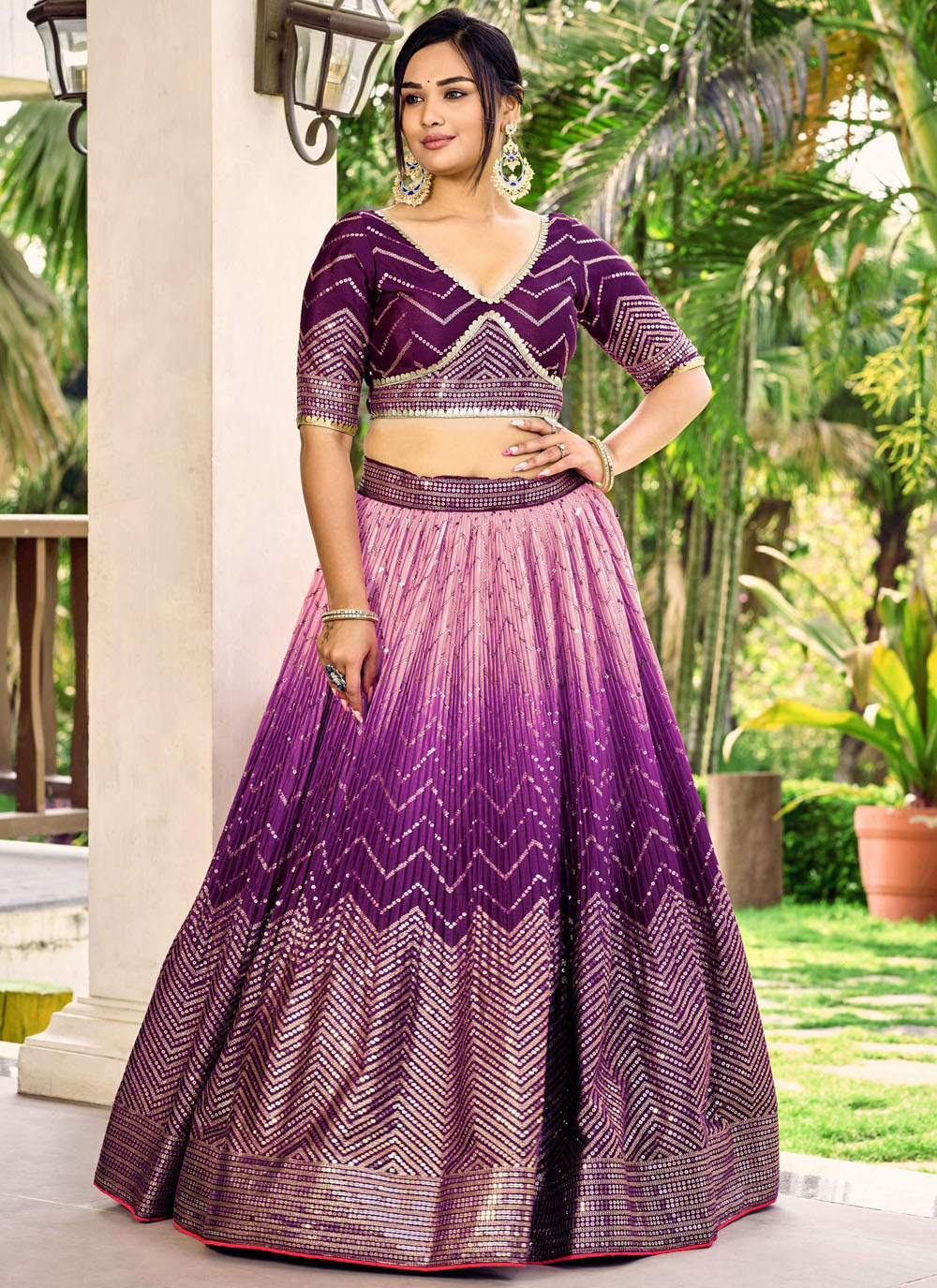 This designer purple A line lehenga choli blends traditional embroidery with modern styling. Decorated with shimmering sequins and elegant thread work, it adds sparkle and charm to your ethnic collection. Comes with matching choli and dupatta.