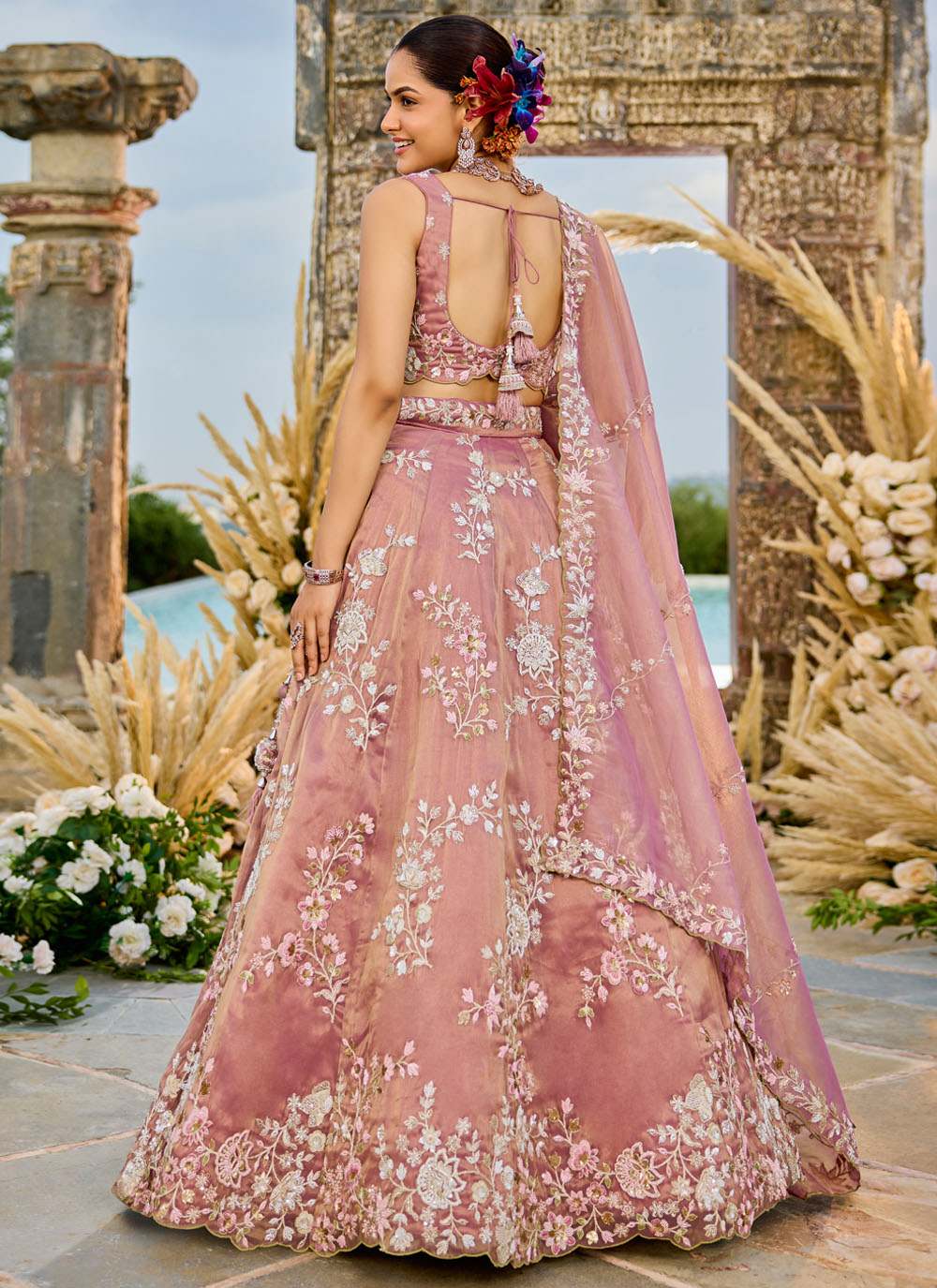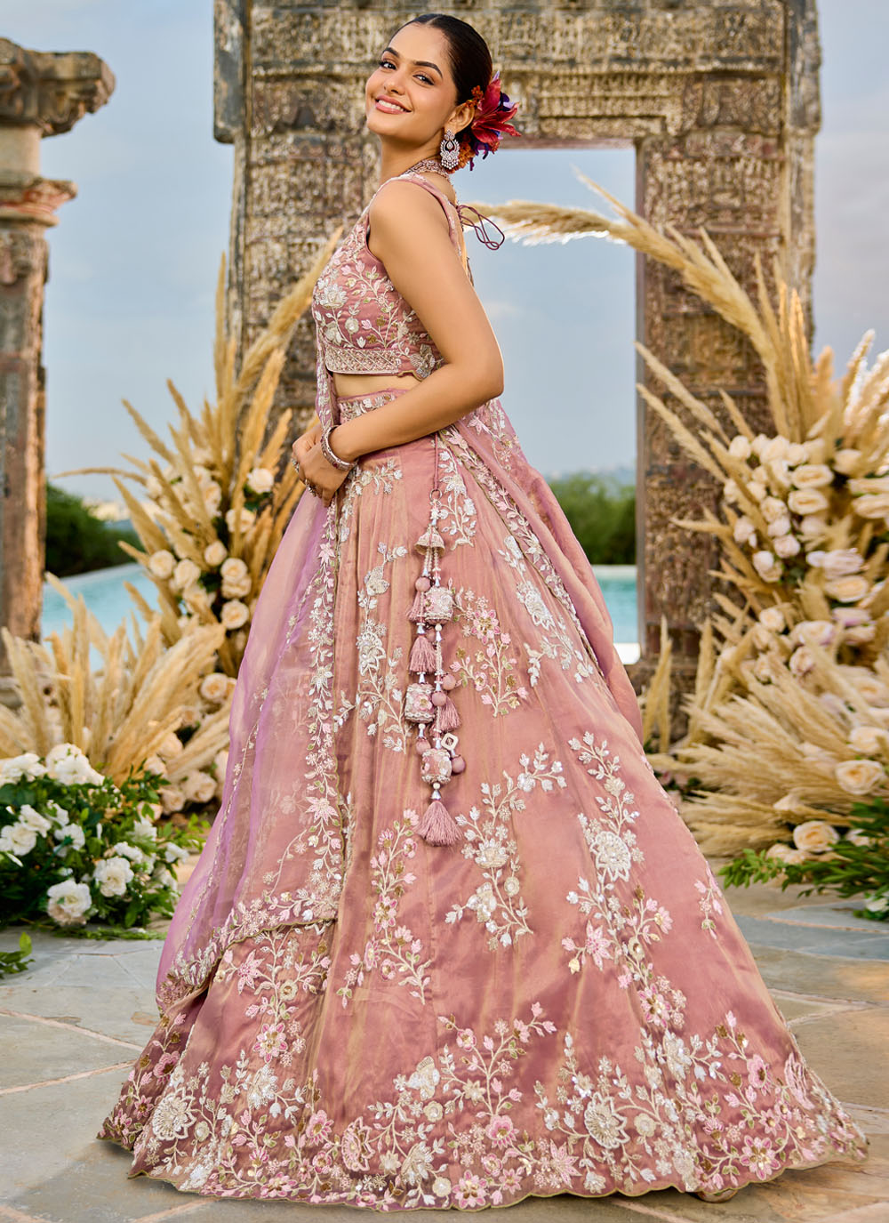 This pink reception lehenga choli in tissue fabric features exquisite embroidery crafted with beads, sequins, and thread detailing. The elegant shine of the fabric complements its designer finish, creating a stunning combination of grace and modernity. Comes with matching choli and dupatta.