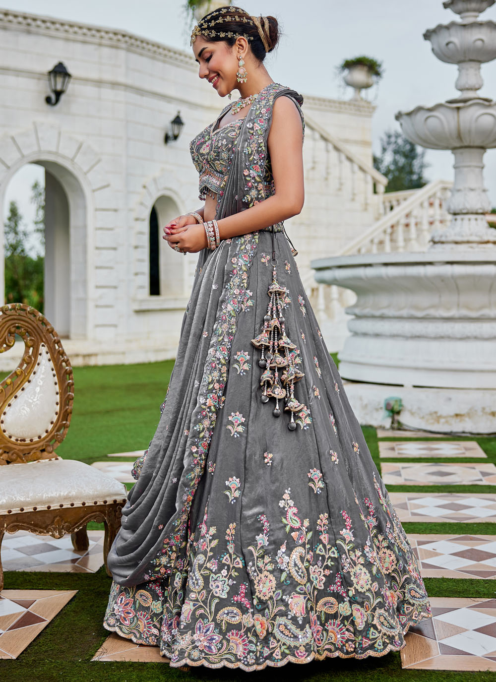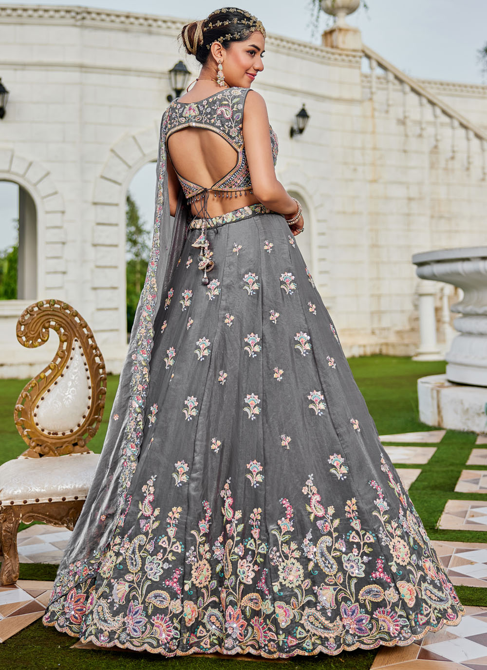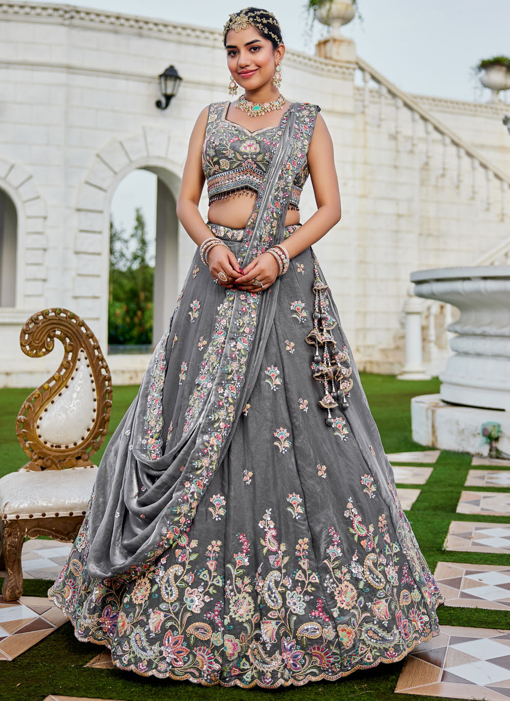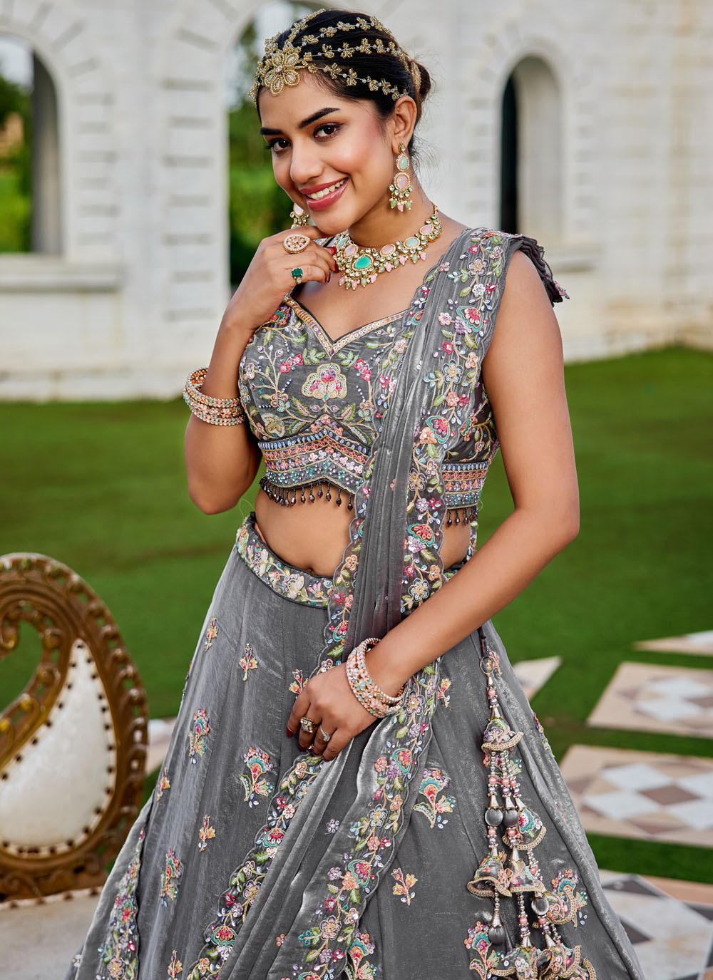 This grey tissue lehenga choli is adorned with shimmering sequins and delicate stone embellishments, enhanced by zari and thread artistry. Ready-to-wear, it is ideal for weddings, receptions, and festive celebrations. Comes with matching choli and dupatta.