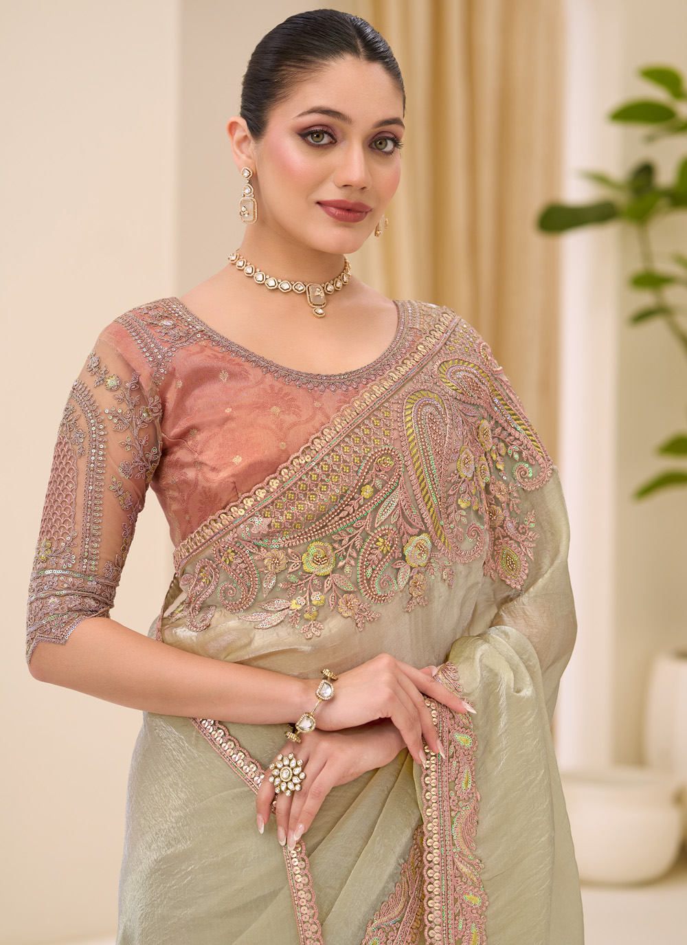 This green tissue saree features an elegant embroidered border that enhances its classic charm. The lightweight tissue fabric offers a graceful sheen and delicate drape, making it an ideal choice for festive occasions and traditional gatherings. Comes with matching blouse.