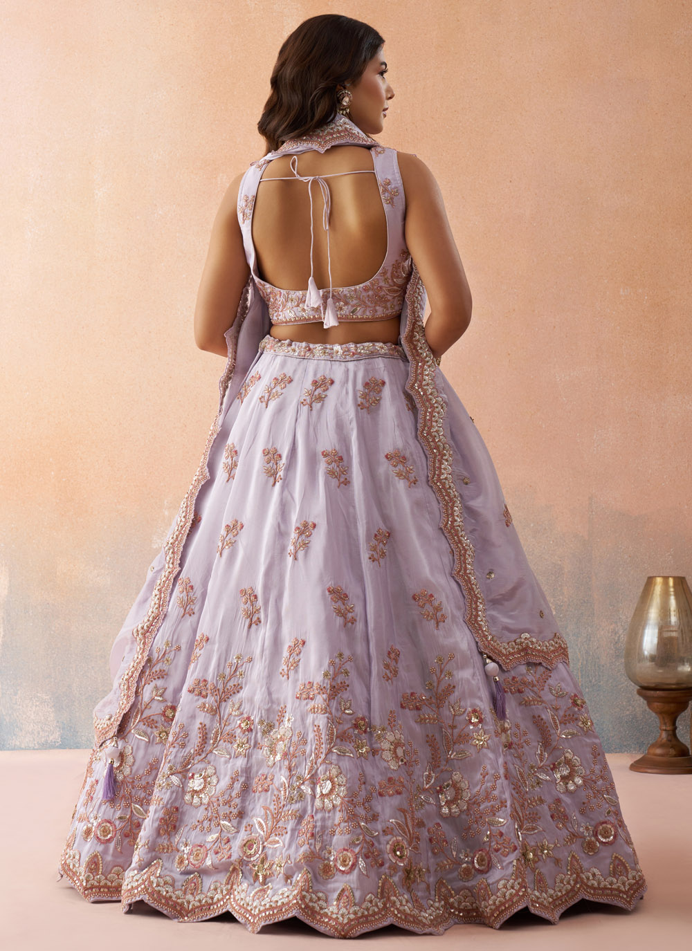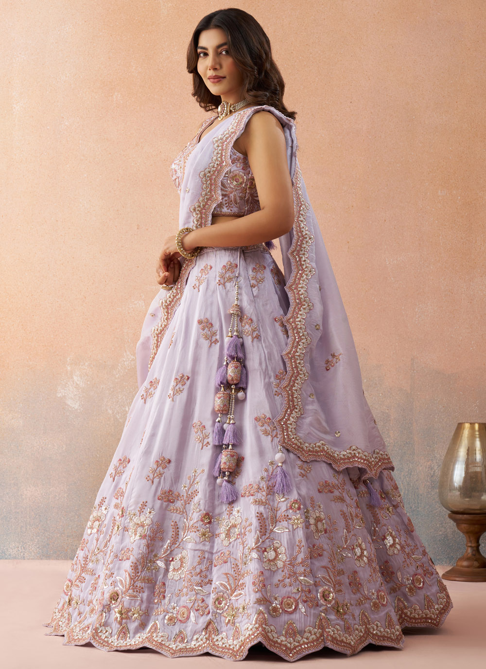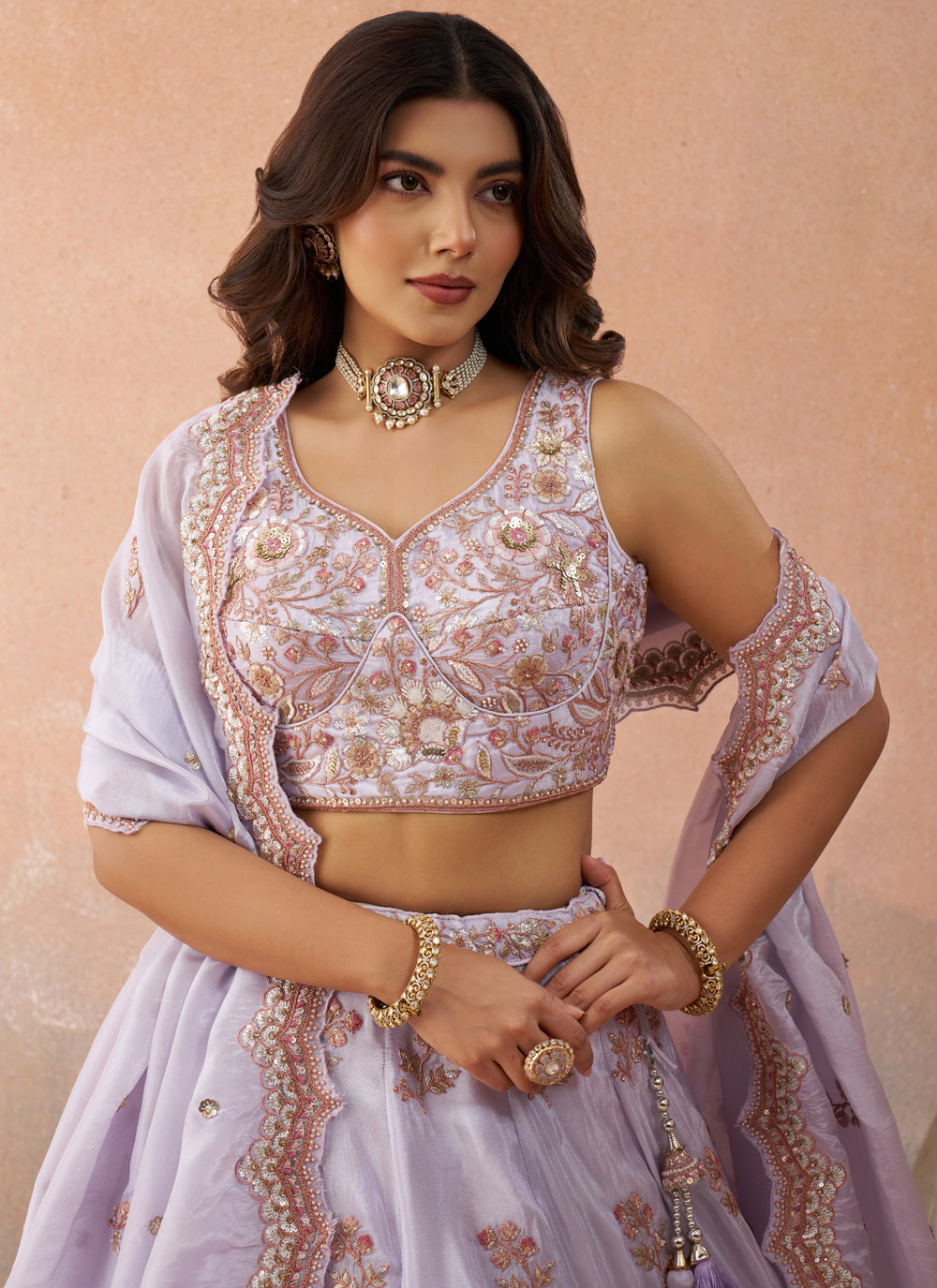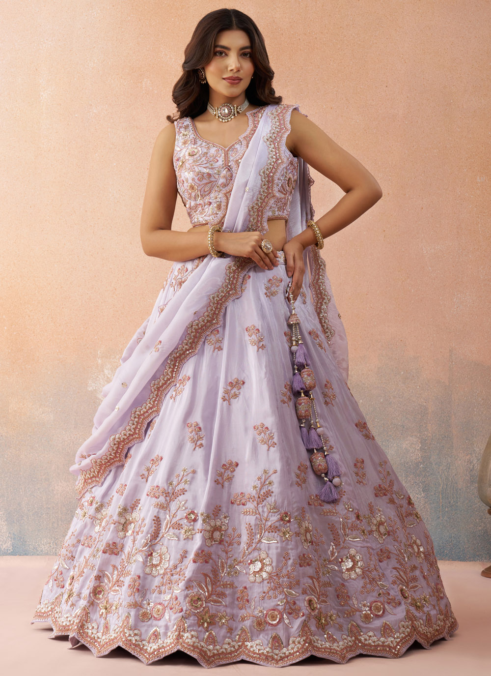 This Tissue Lavender Sequins Embroidered Designer Lehenga Choli is a perfect blend of delicate beauty and festive glamour. The shimmering tissue fabric adds richness and texture, while detailed sequins embroidery gives the outfit a dazzling yet elegant appearance. Comes with matching choli and dupatta.