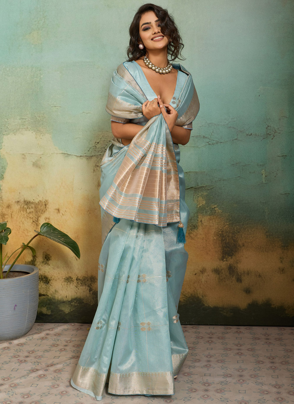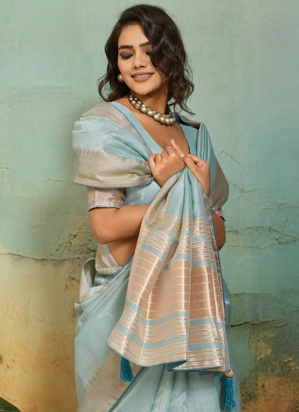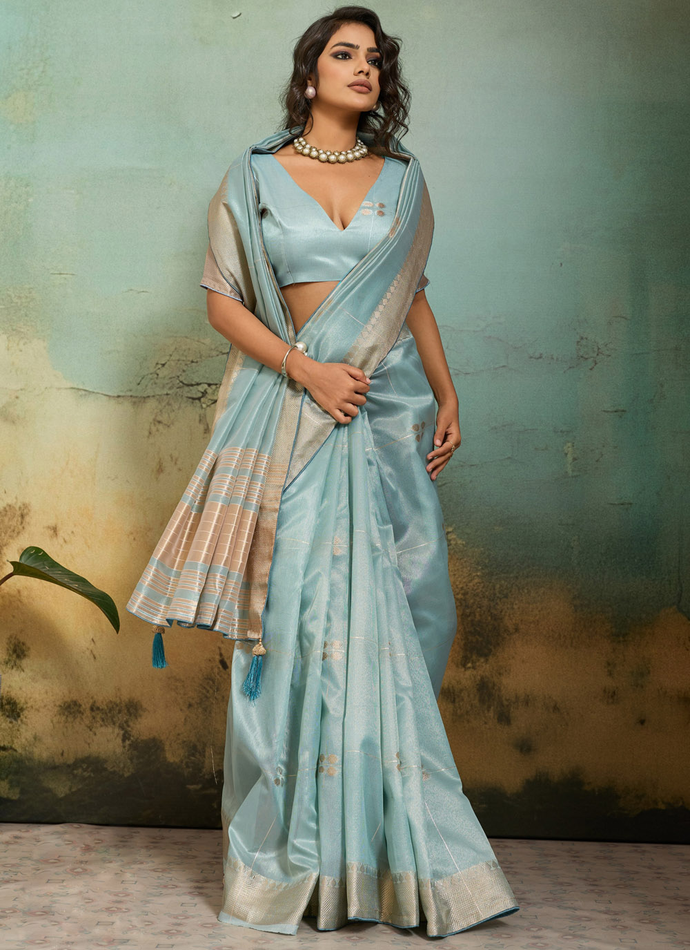This classic aqua blue tissue linen saree is designed for women who appreciate elegance and comfort. The lightweight fabric ensures easy wear, while the woven detailing enhances its sophisticated appearance. Comes with matching blouse.