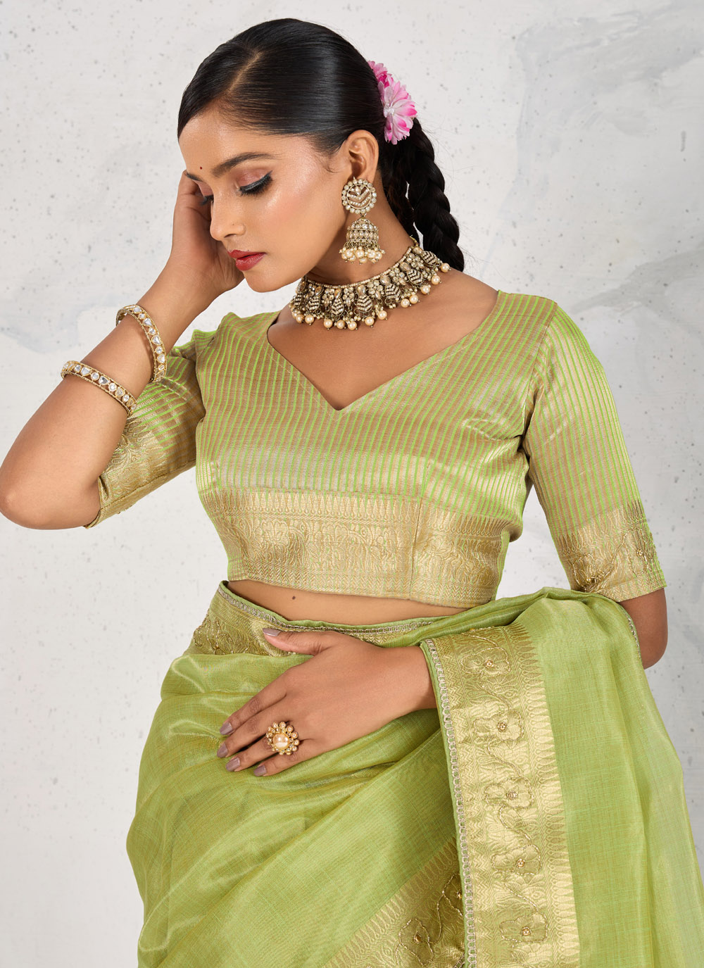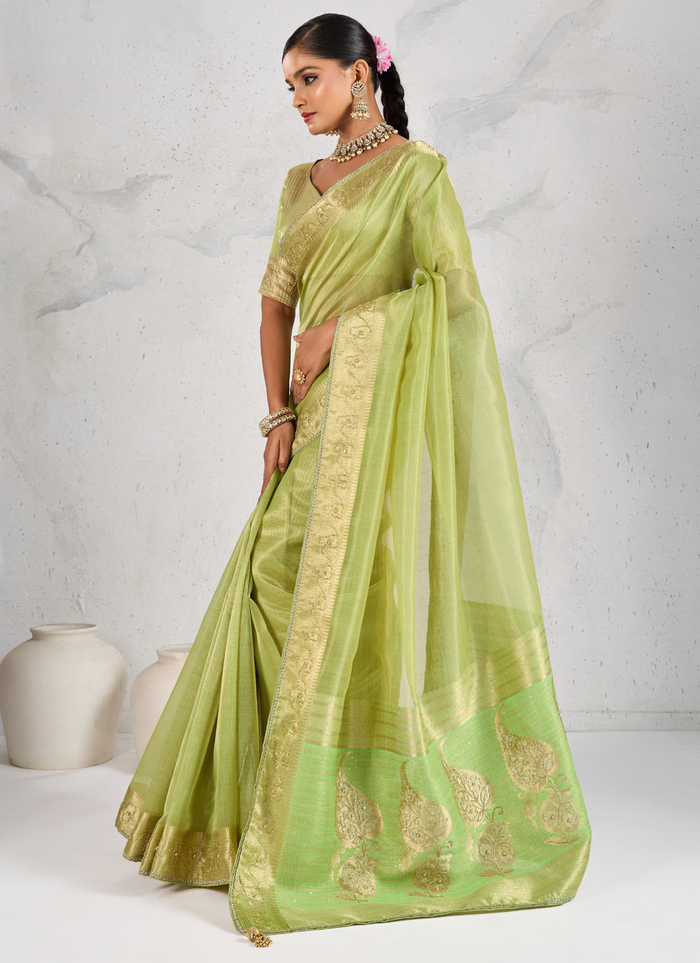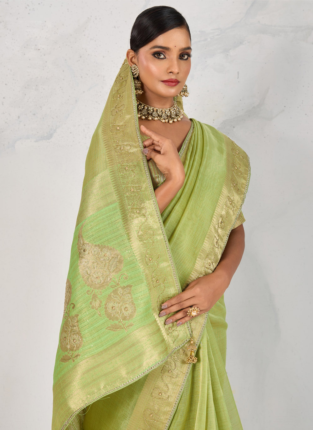 Grace meets tradition in this stunning Green Tissue Linen Saree, meticulously woven and embellished with Zardosi, shimmering Cutdana, pearls, and fine thread work. A timeless drape perfect for weddings, pujas and festive gatherings. Comes with matching blouse.