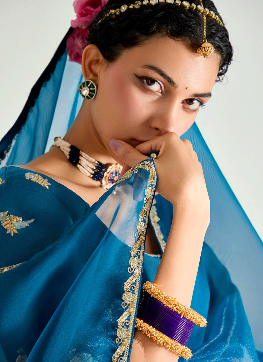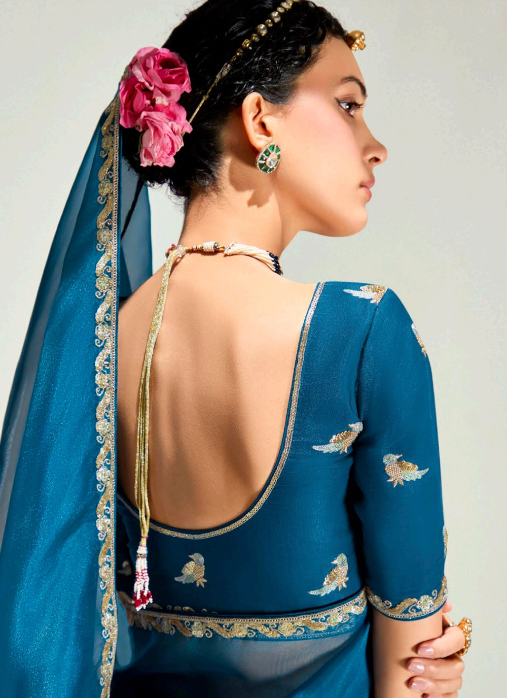 Elevate your ethnic wardrobe with this morpeach tissue organza saree, highlighted by shimmering zari-embroidered borders. The elegant drape and trendy shade offer a refined, graceful appeal for cultural events, poojas or festive parties. Comes with matching blouse.