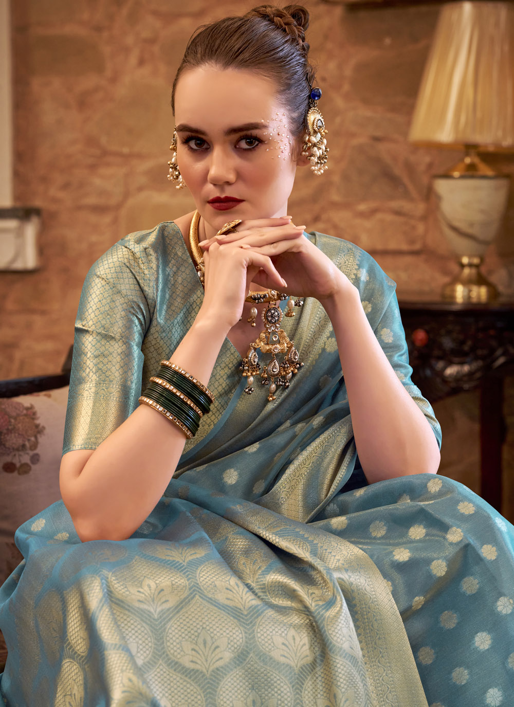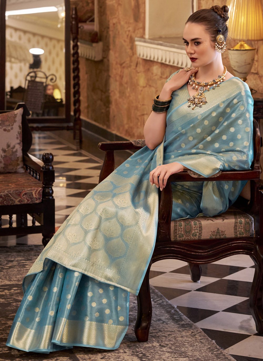 Drape yourself in royal sophistication with this blue tissue silk saree adorned with delicate zari weaving. Its shimmering texture and intricate borders make it a perfect classic for weddings, receptions and evening events. Comes with matching blouse.