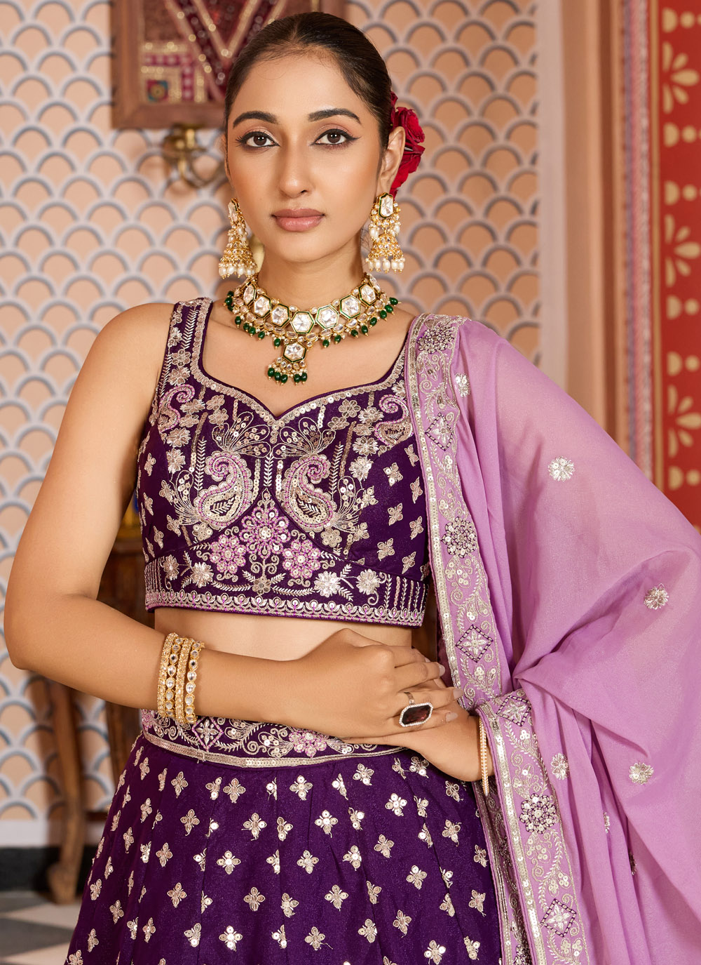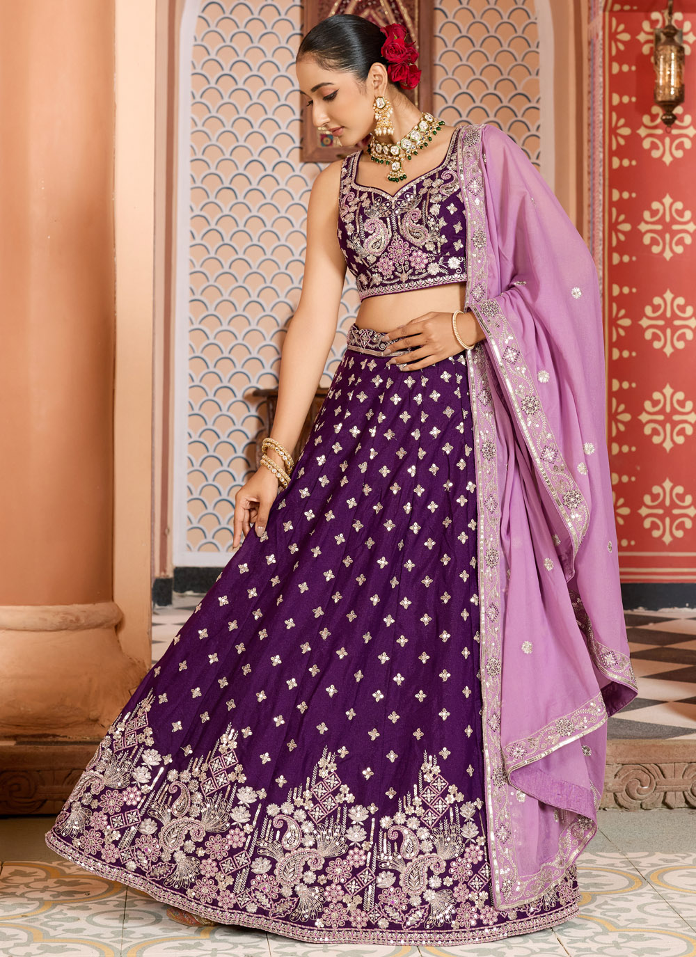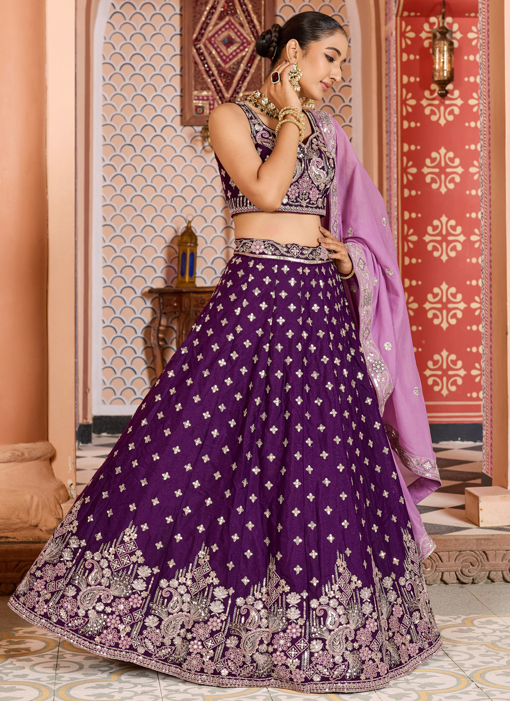 This trendy burgundy lehenga choli stands out with its intricate sequins embroidery over smooth tissue silk. The refined shine of the fabric paired with the modern design ensures you make a stylish statement at every celebration. Comes with matching choli and dupatta.